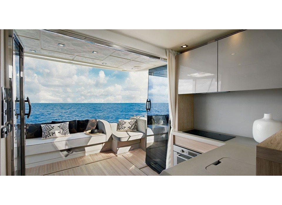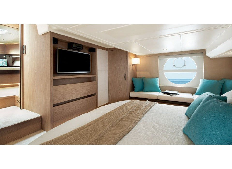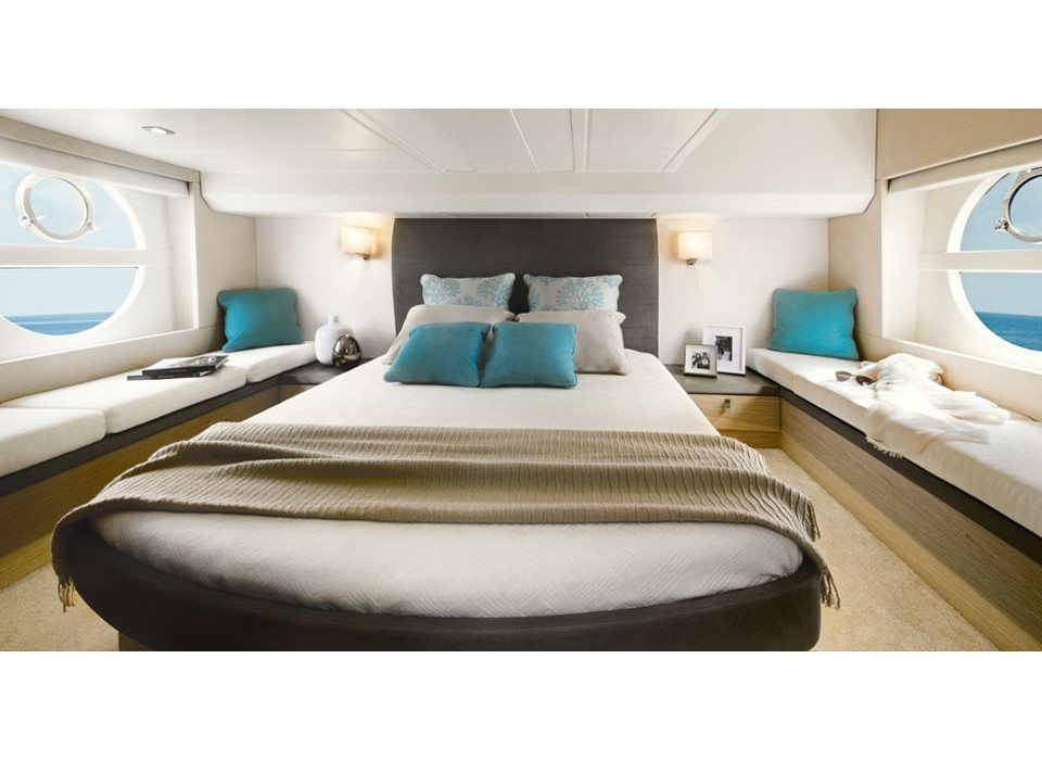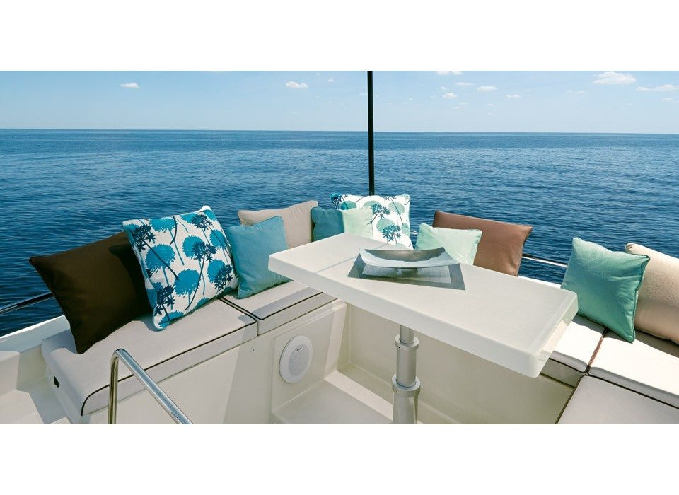The Monte Carlo is one of the rare yachts of this size that boasts a flybridge. Relax on the seating on thefly bridge with a drink or bite for the ultimate small yacht experience. Exterior space on this motor boat is incredibly generous, with sun-lounging pads forward adding to the great space for enjoying the gorgeous weather.