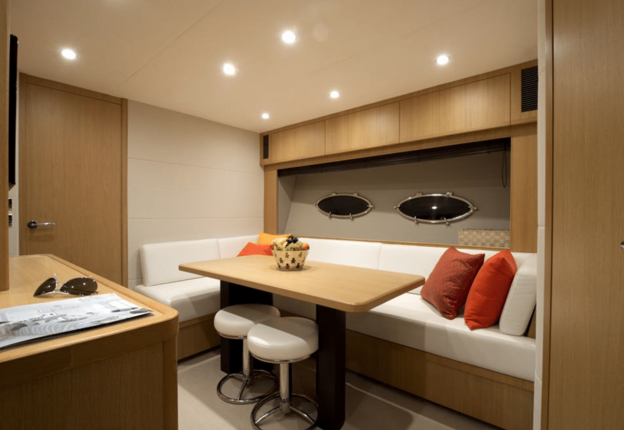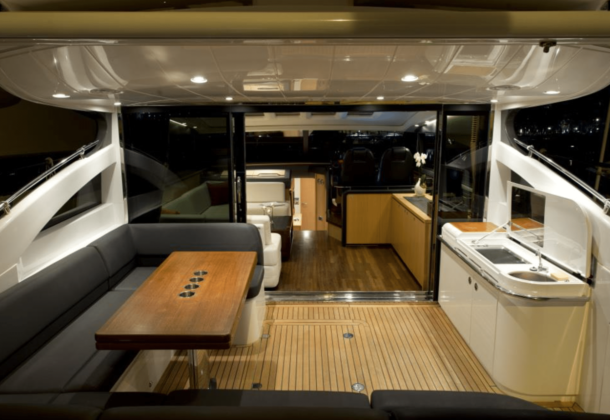 Exterior space is in abundance on the Princess V62, with a large sun-pad forward. On the aft deck, there is a spacious and comfortable sun-lounger, ideal for sun-bathing and enjoying a cocktail. The exterior deck space with optional shade is a real treat. With seating, a large dining table and preparation area, the Princess is the ideal yacht rental for those who wish to drop anchor off if Cannes and enjoy an amazing meal at sea. The large sun-roof on the main deck adds the finishing touch to a great open yacht rental.