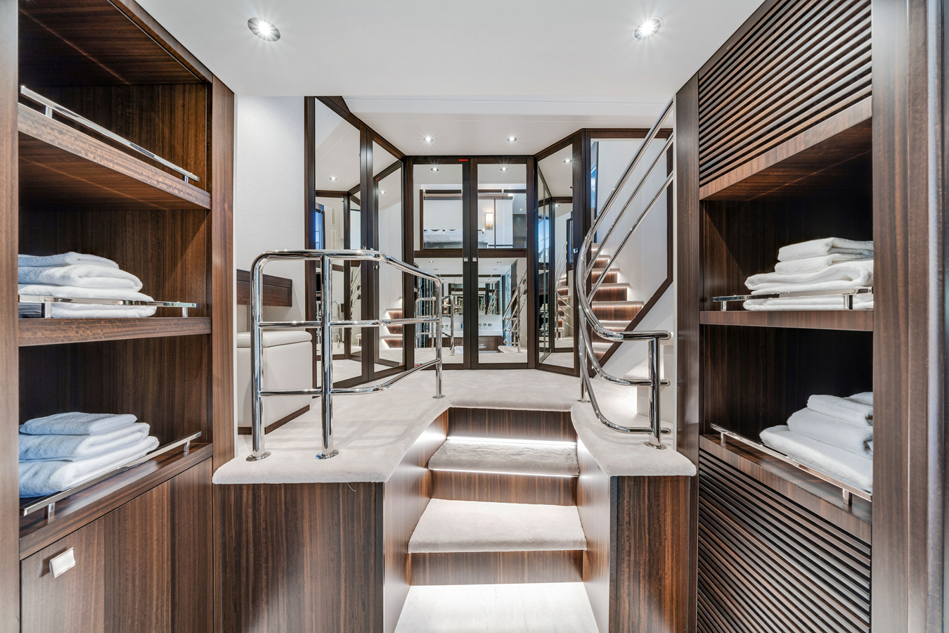 - 8 step side mount stairway with hull fittings port and starboard with dedicated stowage in bulwark