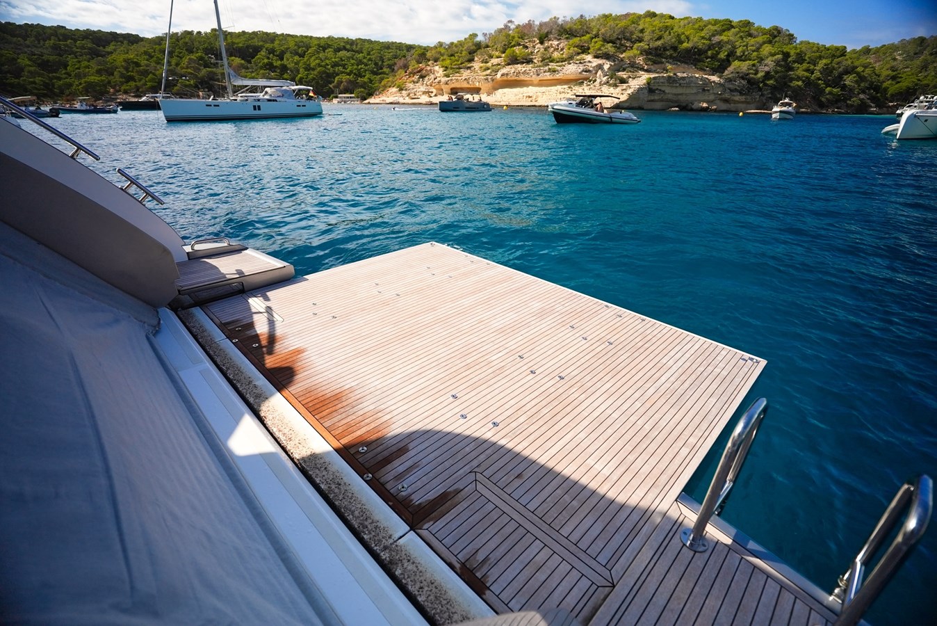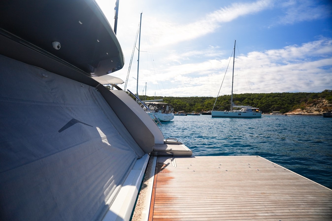 The exterior spaces of the Azimut S8 are a true highlight, designed for effortless connection to the water and endless fun. From the generous swim platform, which transforms into a secluded private beach, to the spacious aft deck with its sunbathing area, dining space, and BBQ, every detail invites relaxation and enjoyment. The bow features an oasis deck with sunbathing cushions and an awning for shaded comfort, while the impressive flybridge offers a multipurpose lounge, a fully equipped summer galley, and a helm station for an owner-operated experience. Step inside to discover a world of comfort and sophistication. The lower deck offers four luxurious guest cabins, including a full-beam master suite that provides ultimate privacy and tranquility, well-insulated from engine sounds. Two twin cabins with pullman beds and a VIP cabin forward ensure ample space for up to 10 guests, all designed with beautiful built-in furniture and thoughtful touches like opening portholes and vanity mirrors. The interior salon and dining area exemplify seamless connection with the outside, featuring a sliding door that opens to the aft deck. Large windows flood the salon with natural light, complemented by automatic Roman blinds for privacy. The main deck is thoughtfully divided into a comfortable salon with opposing sofas, a pop-up TV, and elegant cabinets for entertaining, including an interior bar with a fridge. The indoor dining area, with its beautiful glass tabletop and an openable glass roof, provides a light and airy space for up to eight guests. The galley is smartly located and fully equipped, ensuring culinary delights can be prepared without disturbing the serene atmosphere of the salon. KEY FEATURES: Floating beach house with ample exterior spaces Flawless performance at high speed and stability at anchor Equipped with Seakeeper stabilizer, DPS, Naviop etc. Garage for 4m tender, jet ski and more water toys 4 cabins for 10 guests and crew accommodation for 3 crew members