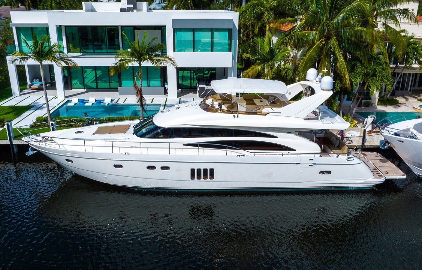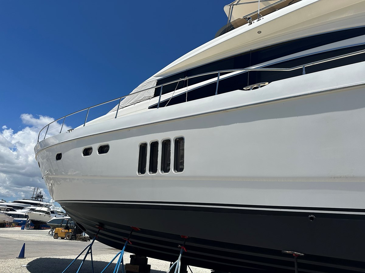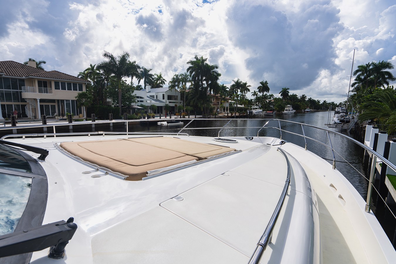 Features of this yacht include MAN diesels with 1,800 hours, two Seakeepers, new headliner in 2022, AC chiller system upgrade 2021, new Garmin electronics in 2019, new hydraulic swim platform in 2018, all new air handlers, teak decks replaced, new carpets, two sets of linens for beds included – 1 stock, 1 custom (see photos), 5 staterooms, 4 heads.