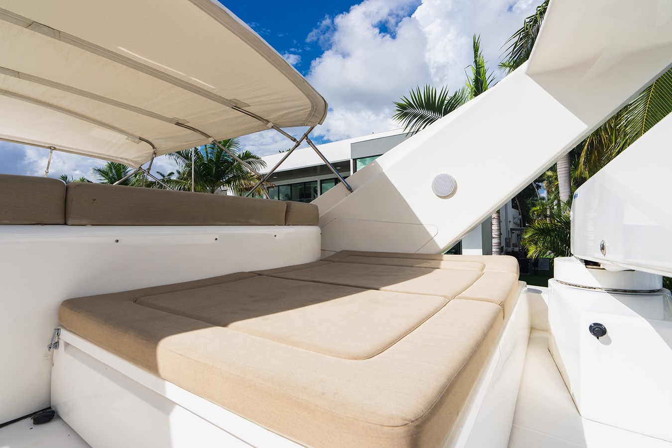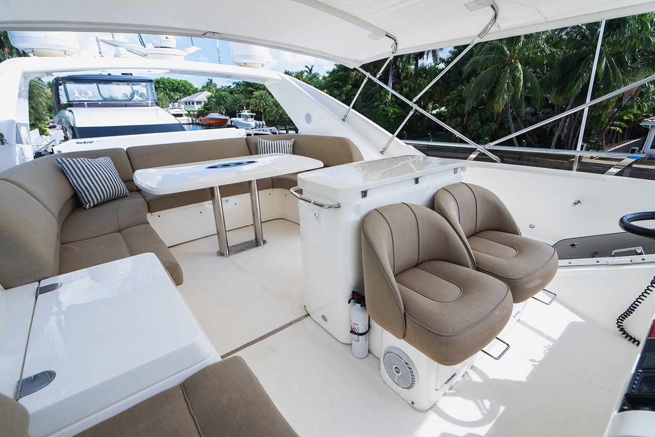 - Dinette: Opposite galley + aft deck & flybridge tables