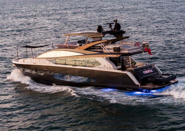 OMNIA is a 2018 Pearl 80 flybridge yacht built by Pearl Yachts. Powered by twin MAN V12 engines, she cruises at 25 knots with a top speed of 32 knots. She’s fitted with a Seakeeper SK16 gyro stabilizer, hydraulic thrusters, and tropical air conditioning rated for up to 40°C. The interior, designed by Kelly Hoppen, features neutral tones, open-plan living, and large windows for natural light. The main salon includes lounge seating, dining space, and a galley with a breakfast bar and privacy divider. Accommodation is for eight guests in four cabins: a full-beam master suite, a forward VIP, and two convertible twins. Crew quarters sleep two. The exterior, by Dixon Yacht Design, includes an aft deck dining area, a hydraulic swim platform, and a flybridge with a hot tub, wet bar, sunpads, and a hardtop with an electric sunroof. The foredeck offers additional sunpads and optional shade. Upgrades between 2022 and 2025 include new exterior upholstery, covers, and systems such as a generator, watermaker components, and freshwater pump and a major main salon refit. Technology onboard includes Starlink High Performance internet and a Bang & Olufsen sound system. A Williams 385 Jet Rib and Seadoo Spark are included.