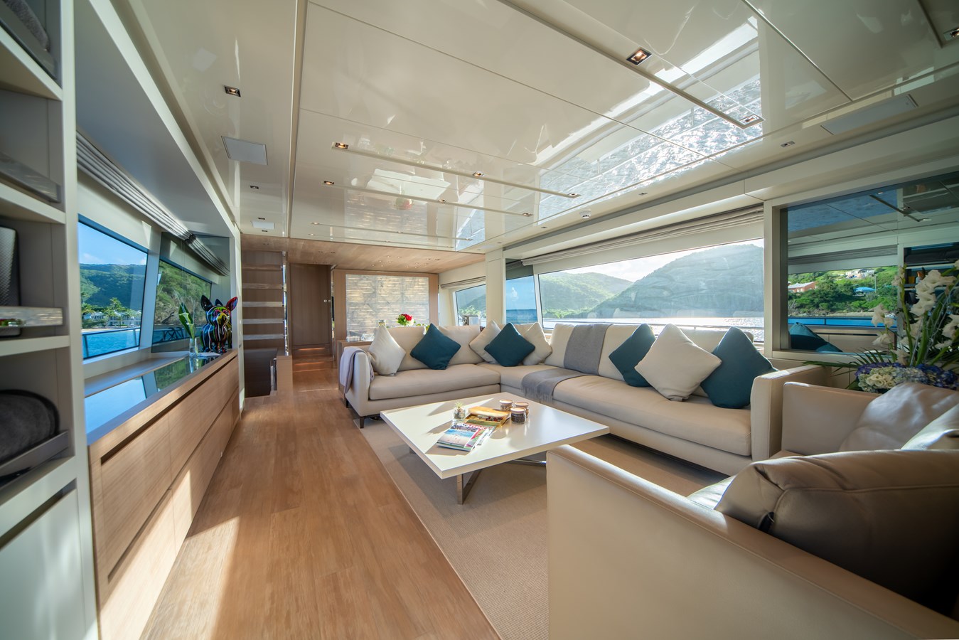 Leather upholstery troughout the boat: owner ceiling, vanity, chaise longue and aft wall; beds, guest and crew staircase walls, salon cabinet top, lower foyer wall (diff. from STD wood or lacquer) Spruce wood for walls, doors, cabinets, wardrobes (diff. from STD wood finishing)