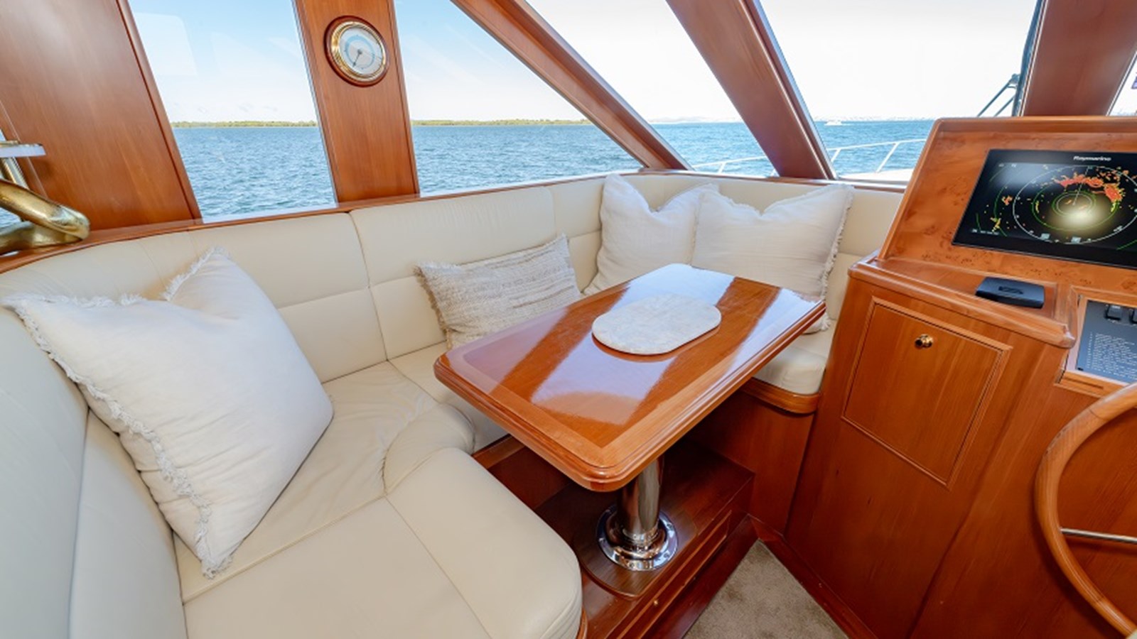 Forward of the saloon and up two steps lies the pilothouse and U-shaped galley to port, outfitted with granite countertops and Grohe fittings. Gourmet appliances include a Liebherr upright fridge, Miele induction cooktop, oven, and dishwasher, as well as an LG microwave and a trash compactor. Forward of the galley, a dinette with a U-shaped settee and hi/lo teak table offers a cozy place to dine underway.