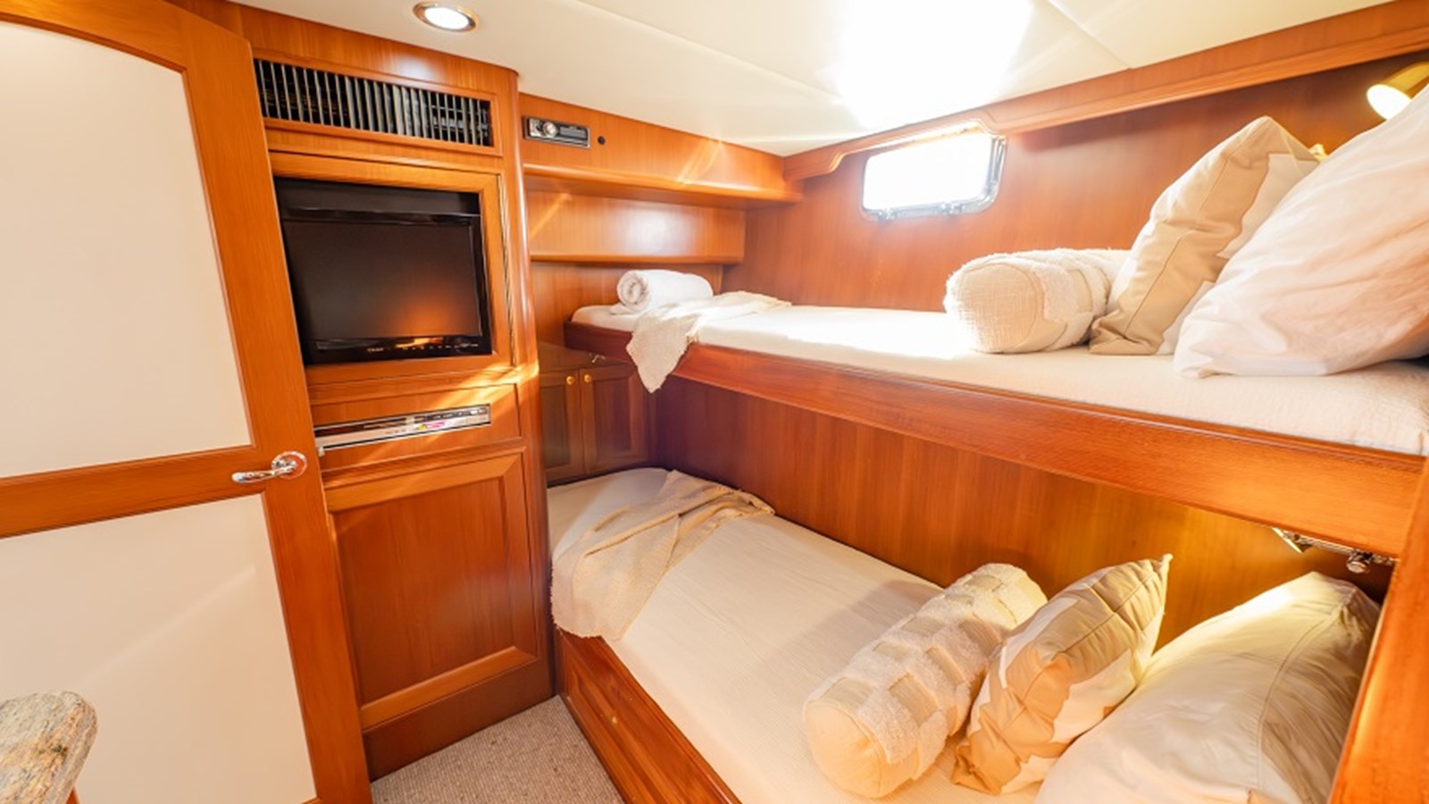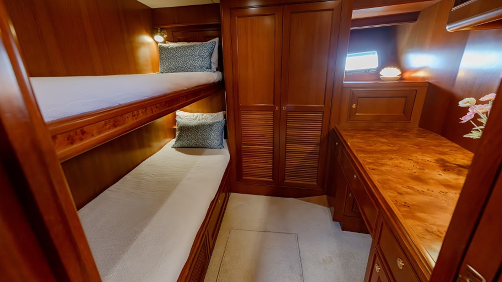 Accommodation aboard ‘Sweet Dreams’ is three generous and beautifully appointed guest cabins. Accessed via the starboard side staircase in the pilothouse, the full-beam midship master suite boasts a king-size island bed, and a luxurious private ensuite with double-opening “pully” doors, frosted glass panels, a waterfall showerhead, dual sinks, a heated towel rail, and an ultra-quiet ventilation system. Additional features include bedside tables, a vanity, 33″ Samsung TV and Panasonic DVD player. The forward VIP cabin features a double bed, 25″ Teac TV and Sony DVD player and private entry to the shared guest bathroom. To port, a guest cabin includes over-under single beds and a desk, ideal for families or extra guests.