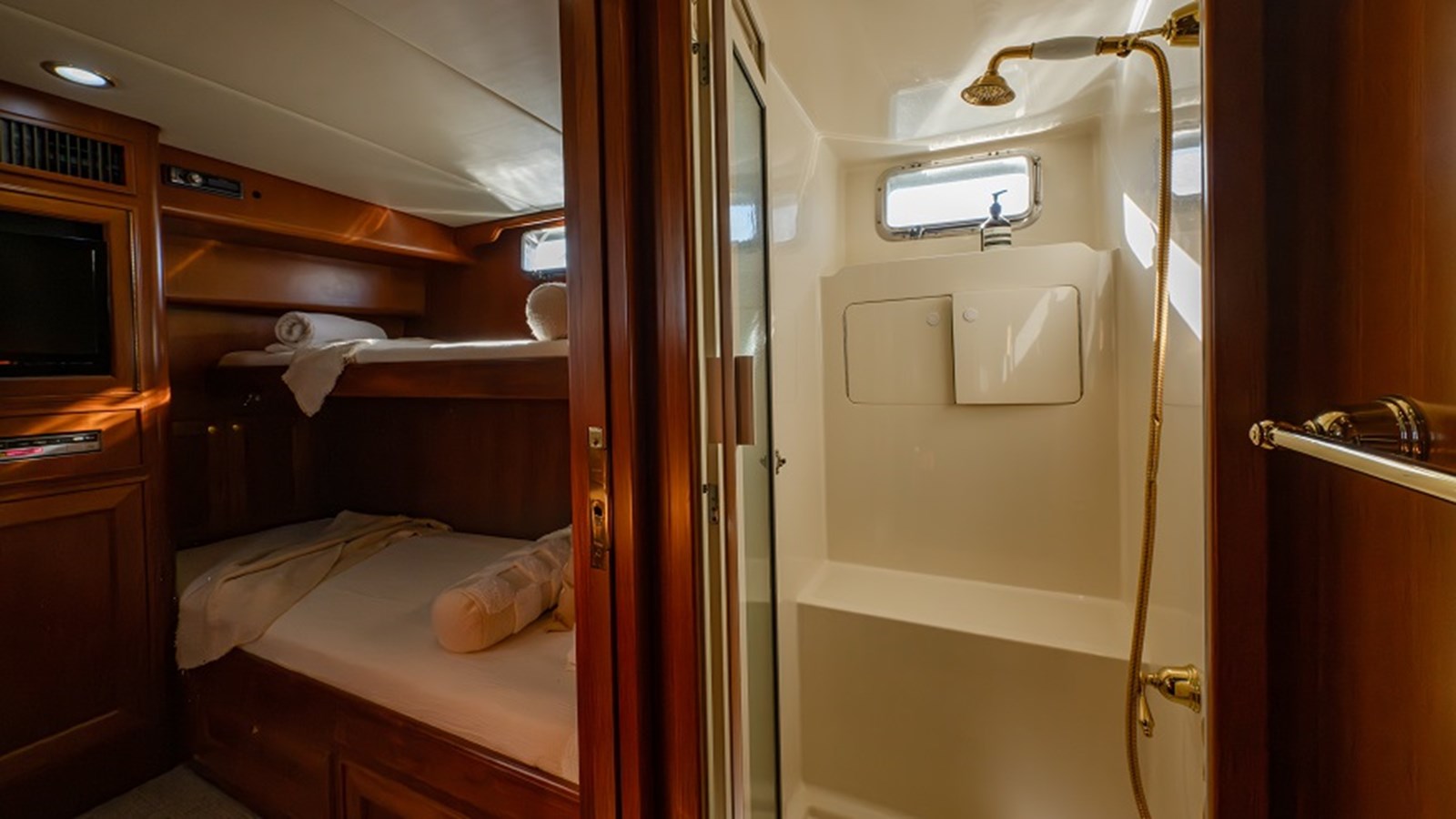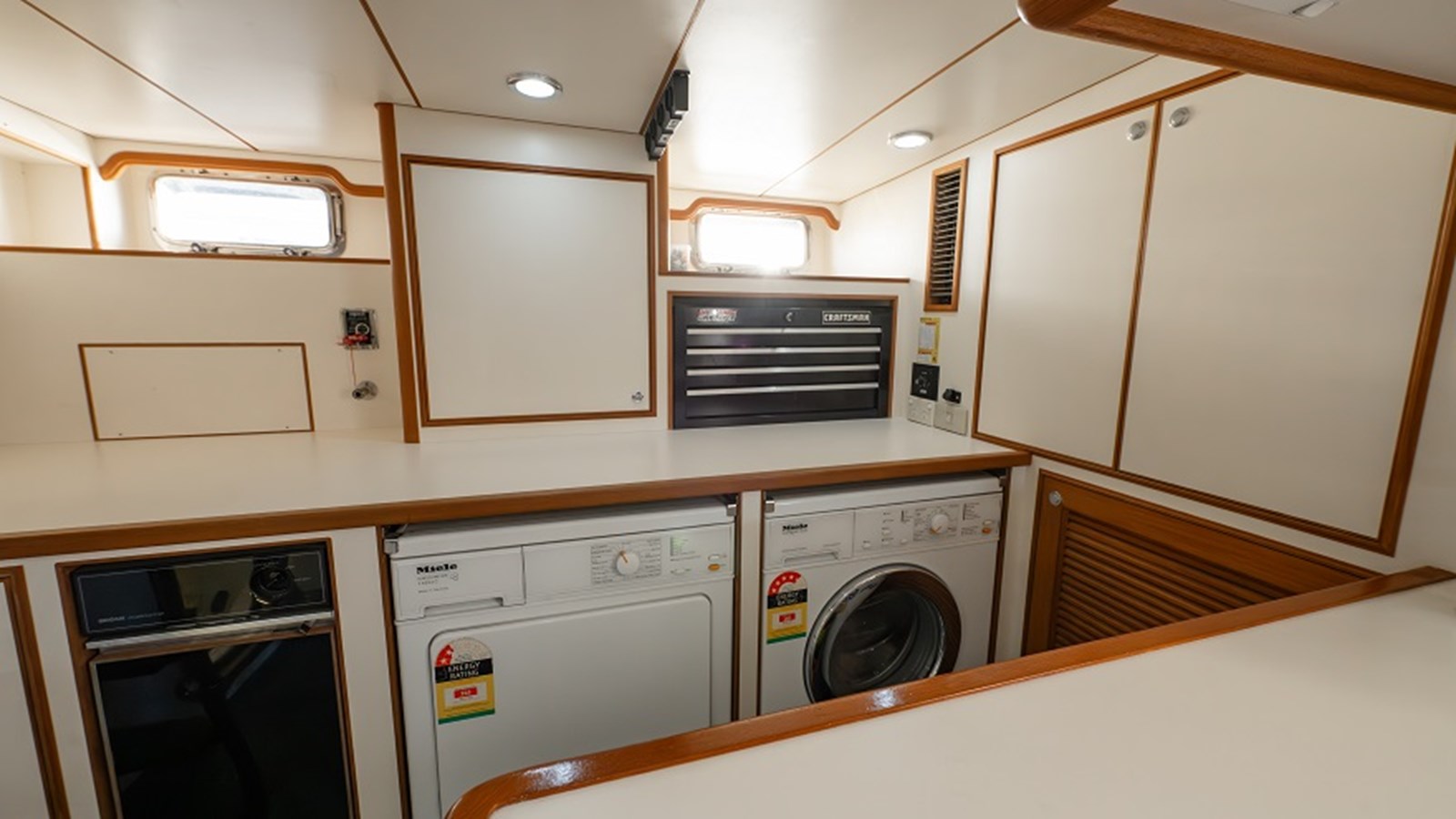 Below, the lazarette is accessed from either the transom or cockpit and includes a separate Miele washer and dryer, Broan trash compactor, a Liebherr freezer, tool storage, sink, and rod holders. The adjacent crew cabin sits to port and includes over-under single beds, a 21″ Teac TV, sink and a private ensuite with toilet and separate shower stall.
