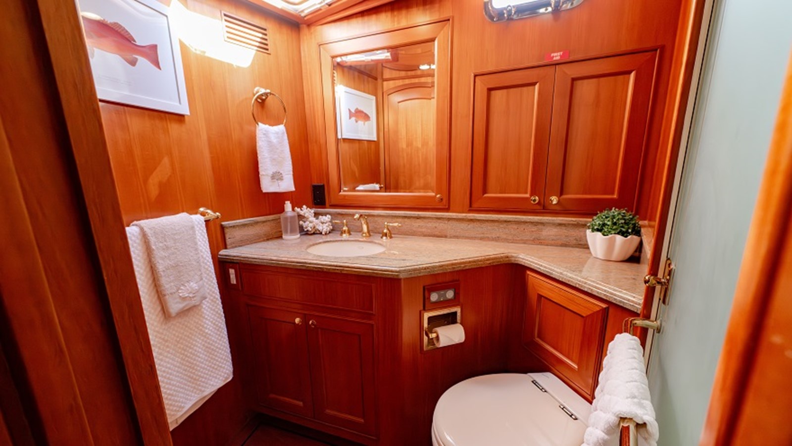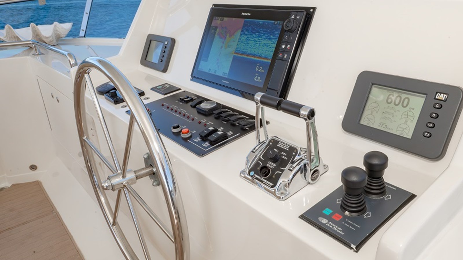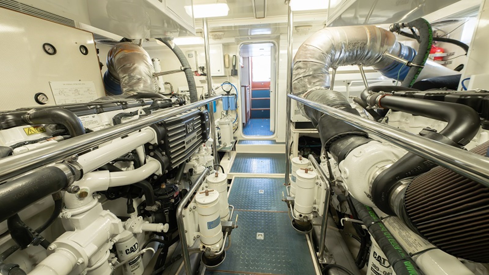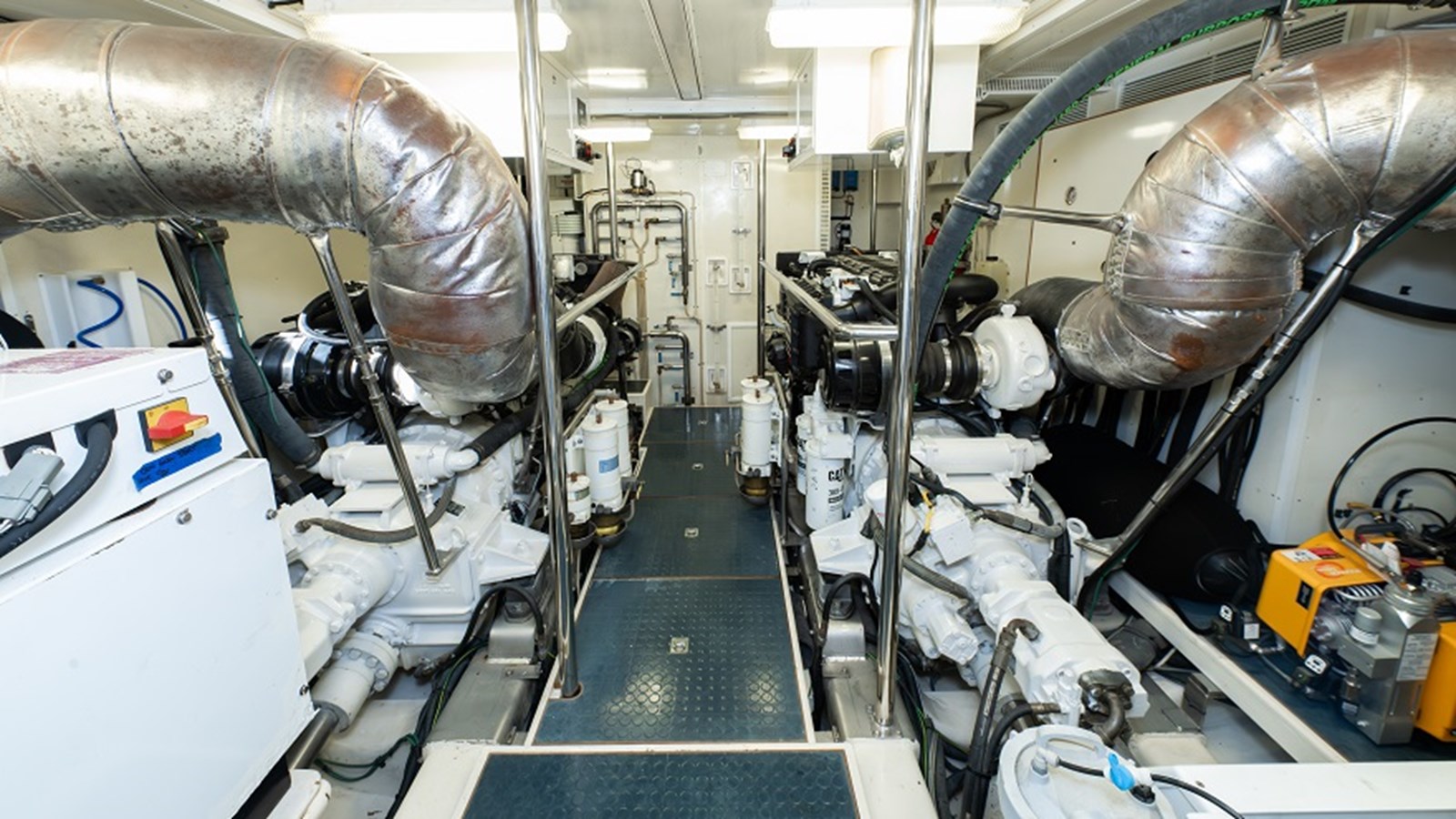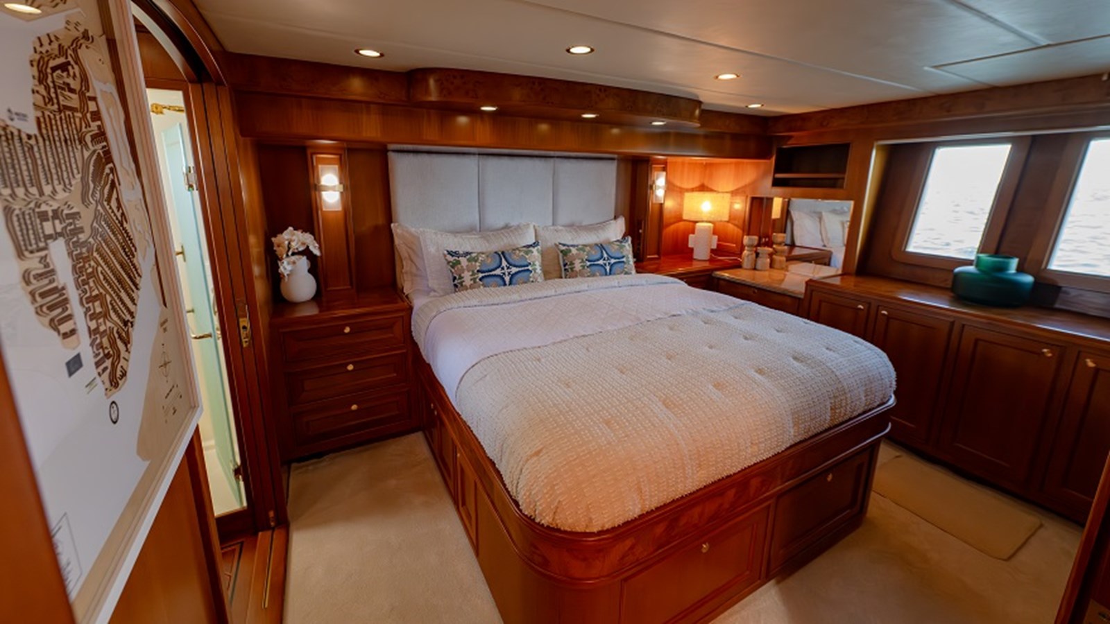 At the core of the ‘Sweet Dreams’ is its impeccably maintained and spacious engine room, a testament to thoughtful design and diligent care. Twin Caterpillar C-18 diesel engines, each delivering 1000hp, provide smooth and efficient propulsion, while the Onan 22.5 KW generator ensures dependable onboard power for all systems and amenities. The Blue Water Legend water maker and Allcraft stainless steel hot water heater empowers extended cruising by producing fresh water on demand, ideal for adventurous voyages far from shore. For added safety, the engine room is equipped with a Fireboy automatic fire suppression system with integrated engine shutdown capability, along with dual Hanse engine room cameras for real-time monitoring and peace of mind.