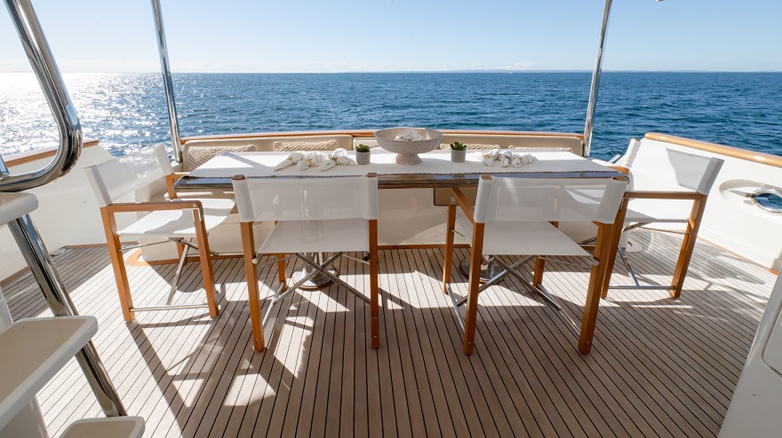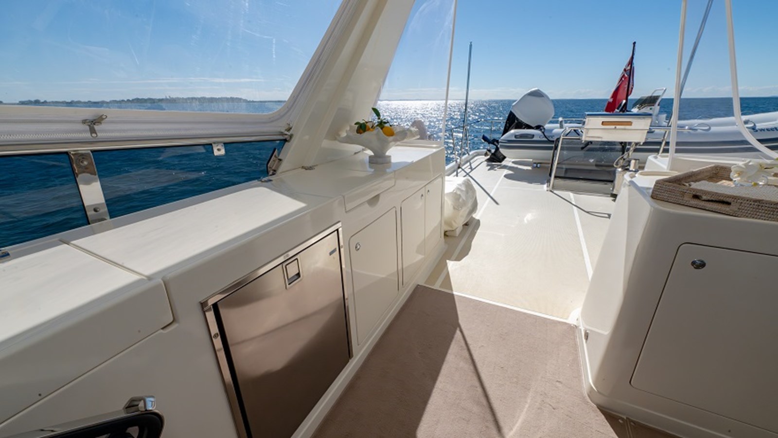 Out on deck, non-skid side decks with stainless steel handrails ensure safe movement around the vessel. Side deck access doors offer flexibility, and the bow features a large sunpad perfect for taking in the panoramic views. Her anchoring equipment includes a 70kg stainless steel Bruce anchor connected to a Muir vertical windlass.