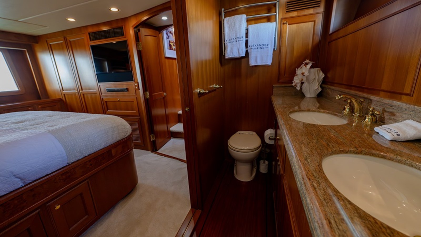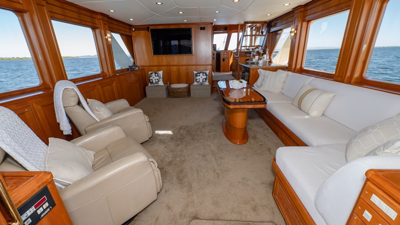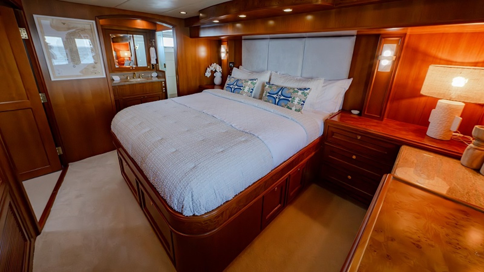 Entering the saloon through a sliding door, you’re welcomed into a space of timeless elegance with carpeted flooring and warm satin-finished teak cabinetry that’s throughout the vessel. To starboard is an L-shaped sofa with space for additional seating to port, and a Liebherr wine fridge keeps your collection perfectly chilled. Entertainment is covered with a wall-mounted 50″ Samsung TV, Bose surround sound, and Starlink satellite internet with marina antenna connectivity. The entire vessel is climate-controlled via Marine Air Systems air conditioning.