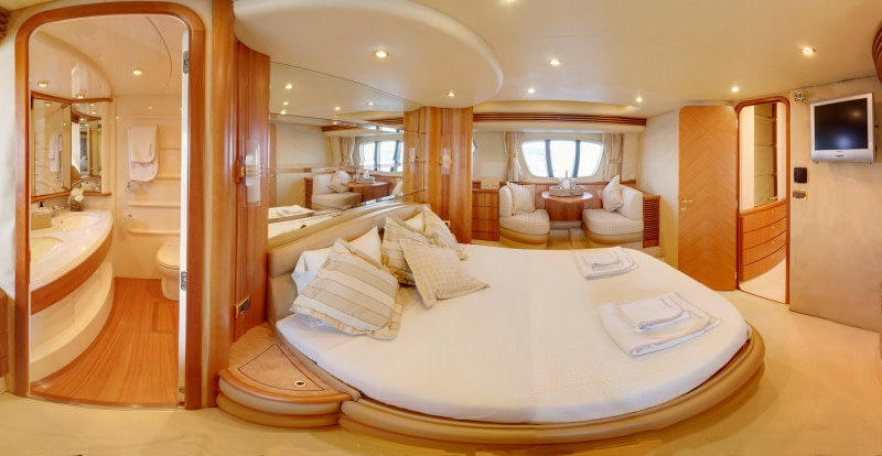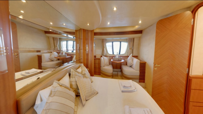 This stylish and modern yacht can welcome 8-9 guests sleeping, and up to 10 guests cruising.She boasts 4 luxurious cabins, all of which have private en suite facilities and individually controlled air conditioning.The spacious master cabin offers breathtaking views and beautiful natural sunlight thanks to it’s two generous side windows.The master cabin also has a master bathroom with 2 marble sinks, a large bathtub to relax in while soaking in the views.The layout is expertly designed with the possibility of transforming the twin cabin into a third double cabin.Meanwhile,The VIP cabin is equally spacious with 2 large side windows, hutch and en suite with shower.