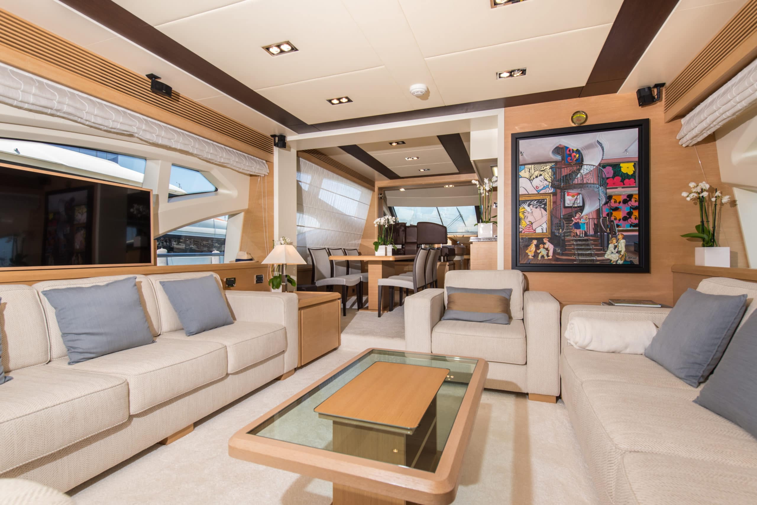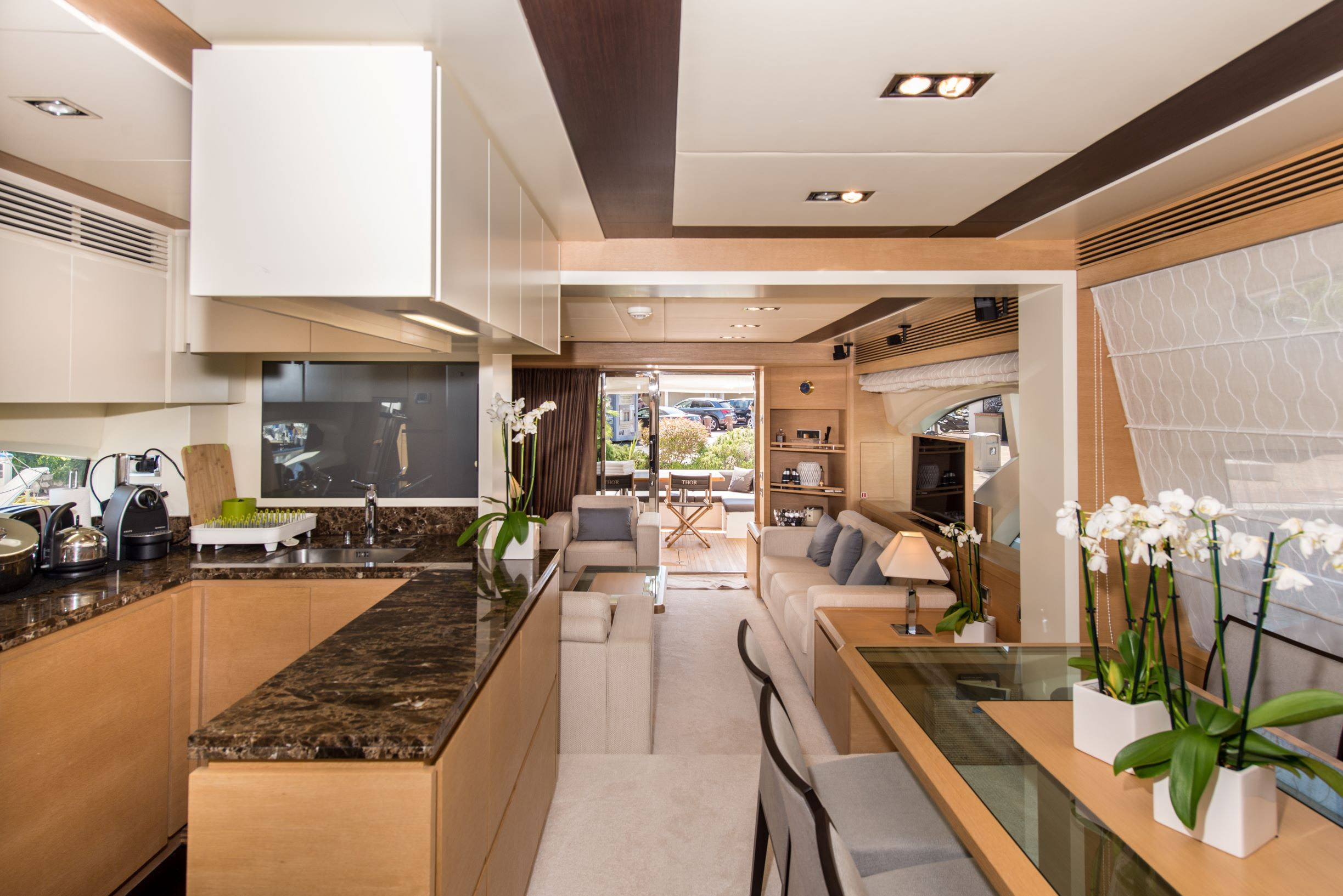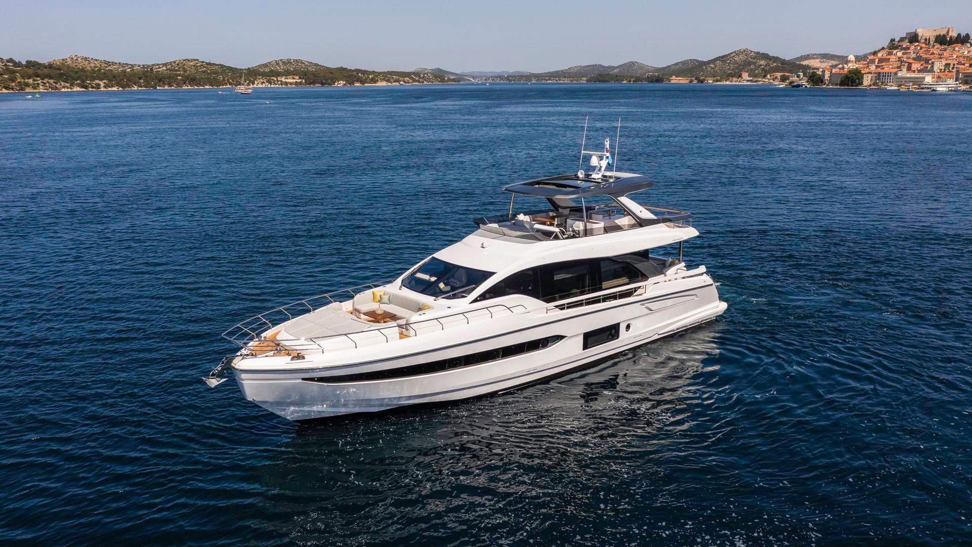 Her exterior is just as lavish as her interior. Standing at 22 metres, she is cleverly laid out and makes the absolute most out of each space! An ideal sunbathing area lies at the bow where the chic, padded sunbeds await you. This fly deck cruiser provides multiple gathering areas to enjoy entertainment with your guests. Maybe the warm Jacuzzi is calling your name? If you prefer to catch a break from the sun, the retractable bimini has you covered. At night guests like to sit out on with a glass of wine to watch the sunset over the french coastline.