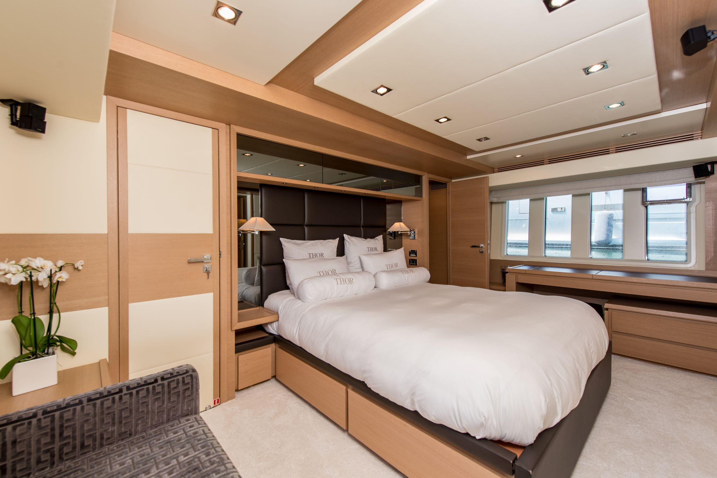 Thor can comfortably accommodate 6 guests sleeping or alternatively, 12 guests cruising. She boasts 4 elegant cabins; 1 Master suite, 1 VIP stateroom, and 2 twin cabins. All of which have their own en-suite facilities. You can rest easy knowing that you and your guests will have the perfect slumber, no matter which cabin they stay in. The Master suite is the epitome of luxury. She boasts a king sized bed and a sofa seating area. It’s also strategically placed on the lower deck to take advantage of the full beam layout. Meanwhile, the VIP cabin has a queen-sized bed, storage and an en-suite bathroom. The twin cabins are each home to two single beds with ample storage thanks to the spacious cabin. She also has 2 crew members on board at all times, ensuring all your needs are catered for.