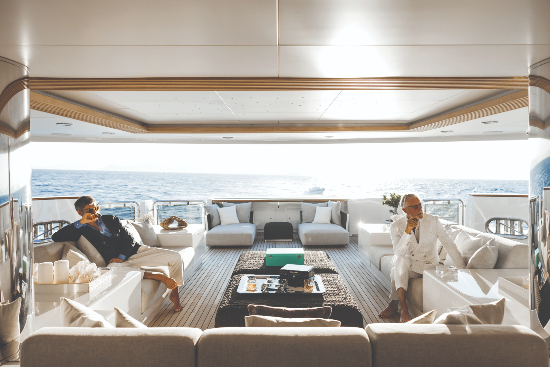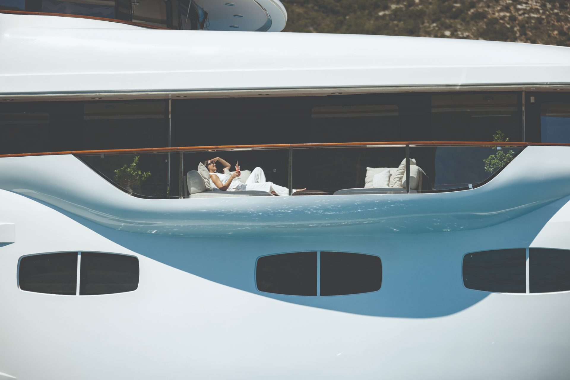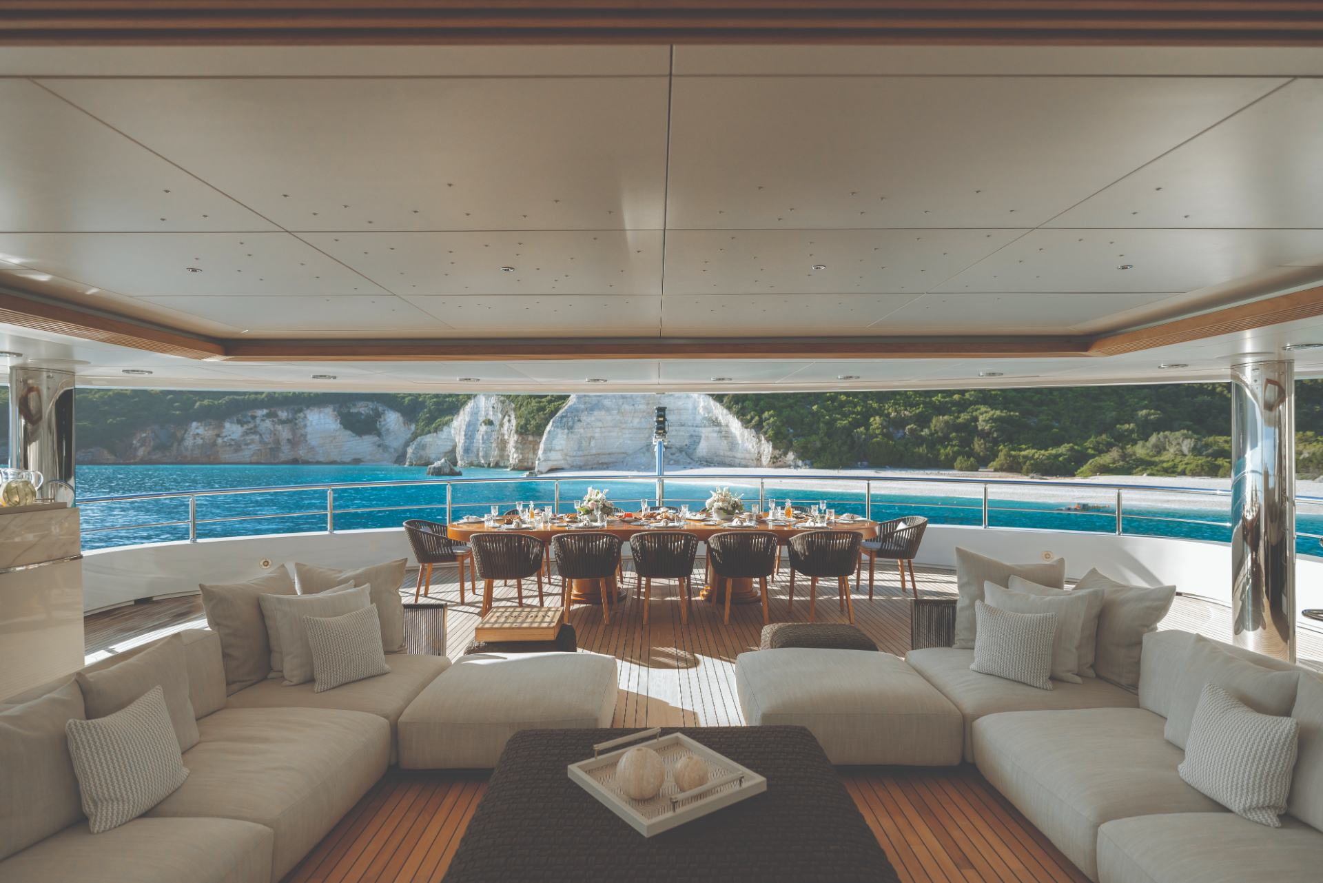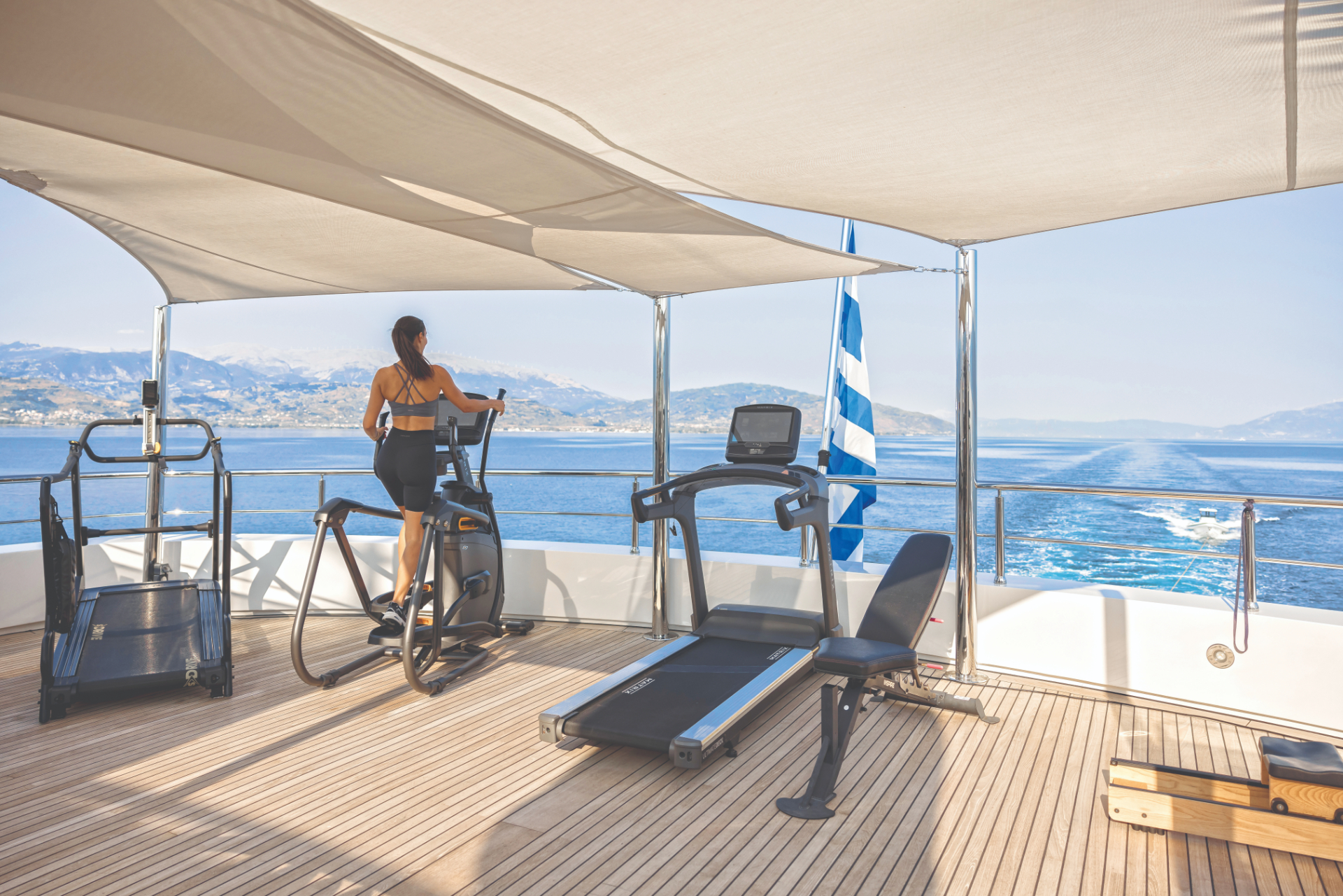 Below on the bridge deck, is a very well equipped gym area. So your guests can get their exercise in under the sun and in front of some of the most beautiful views the Mediterranean has to offer. Also on the bridge deck is another shaded relaxation area, where stylish seating areas blend nicely with the teak.