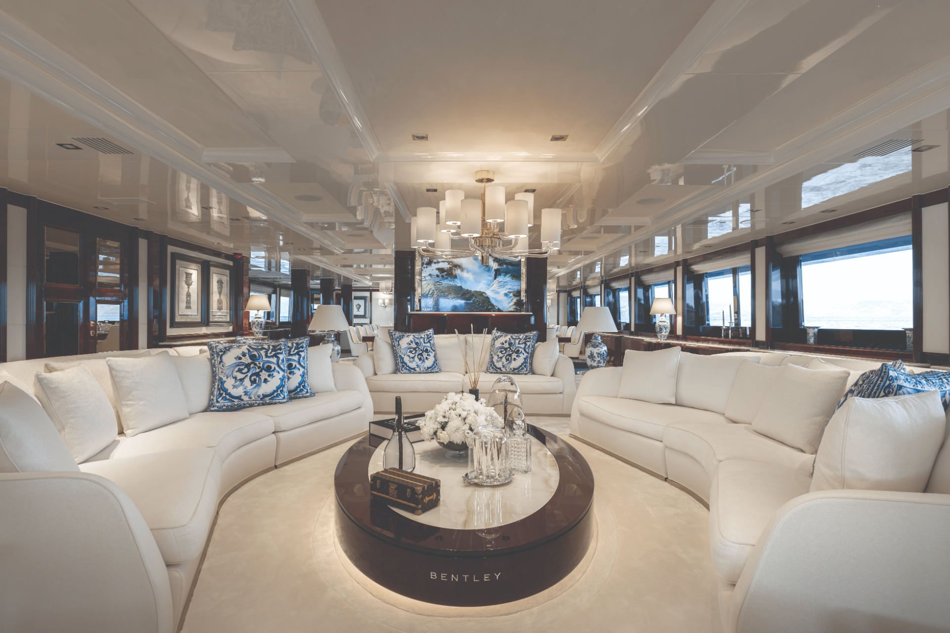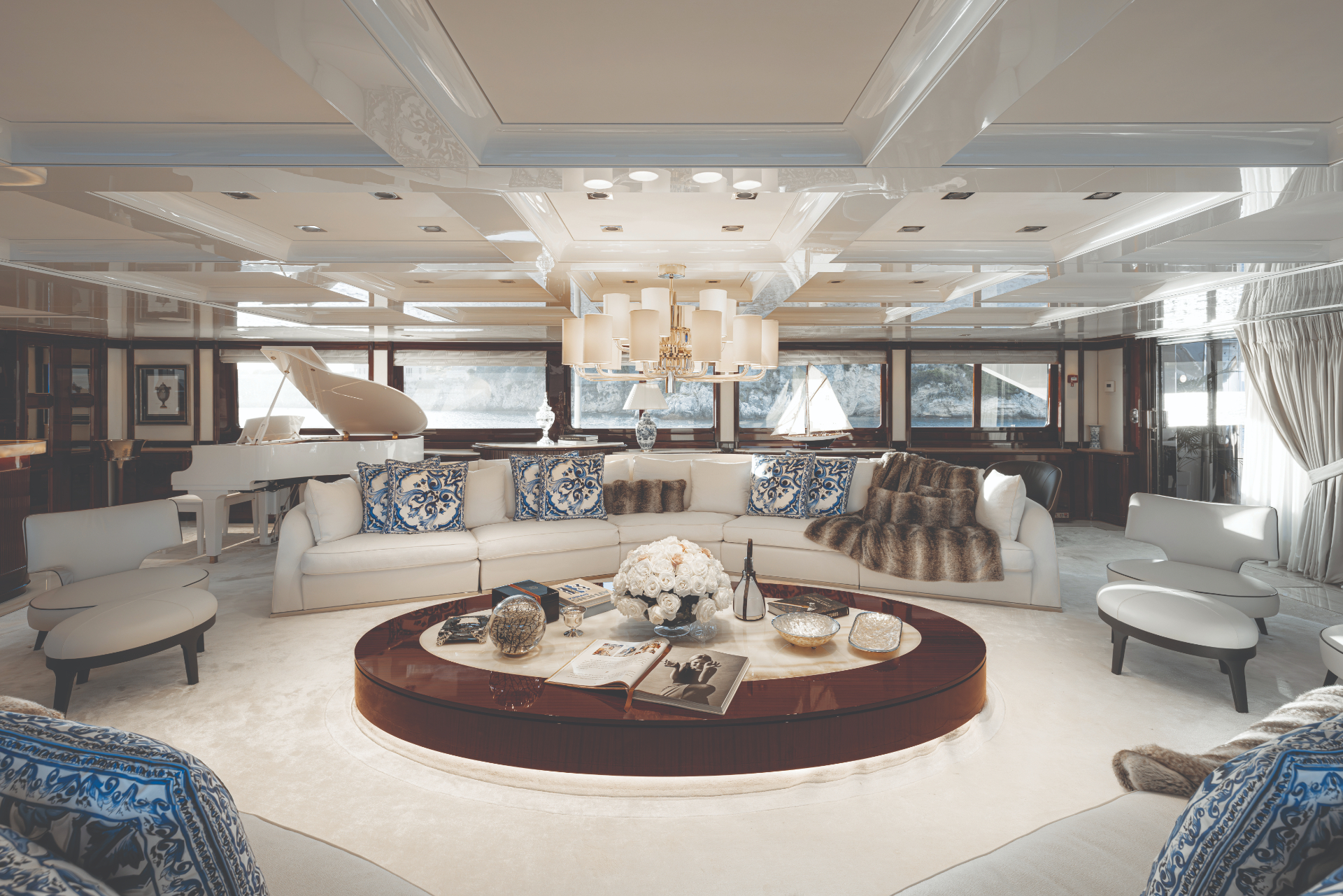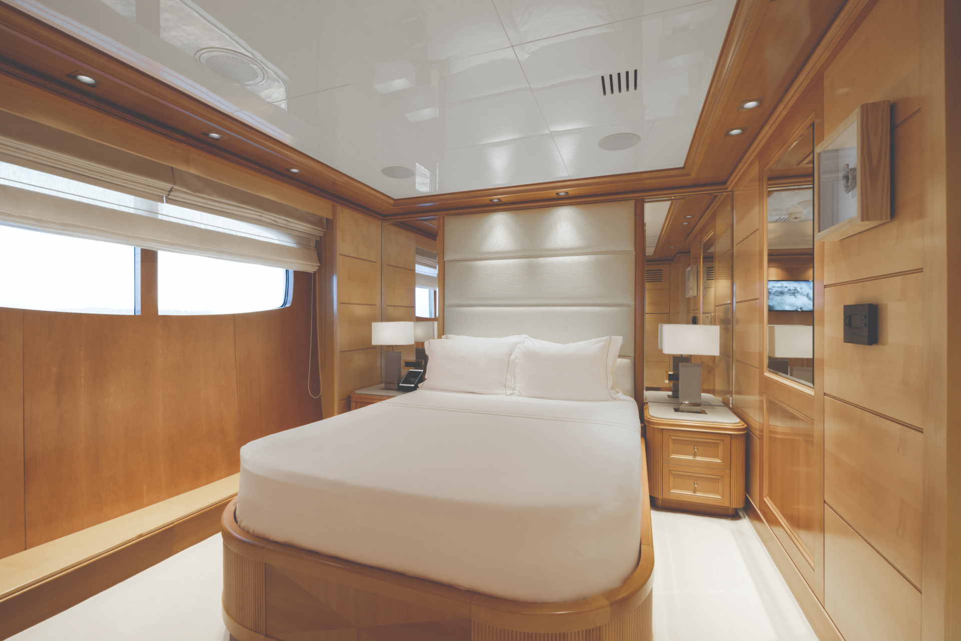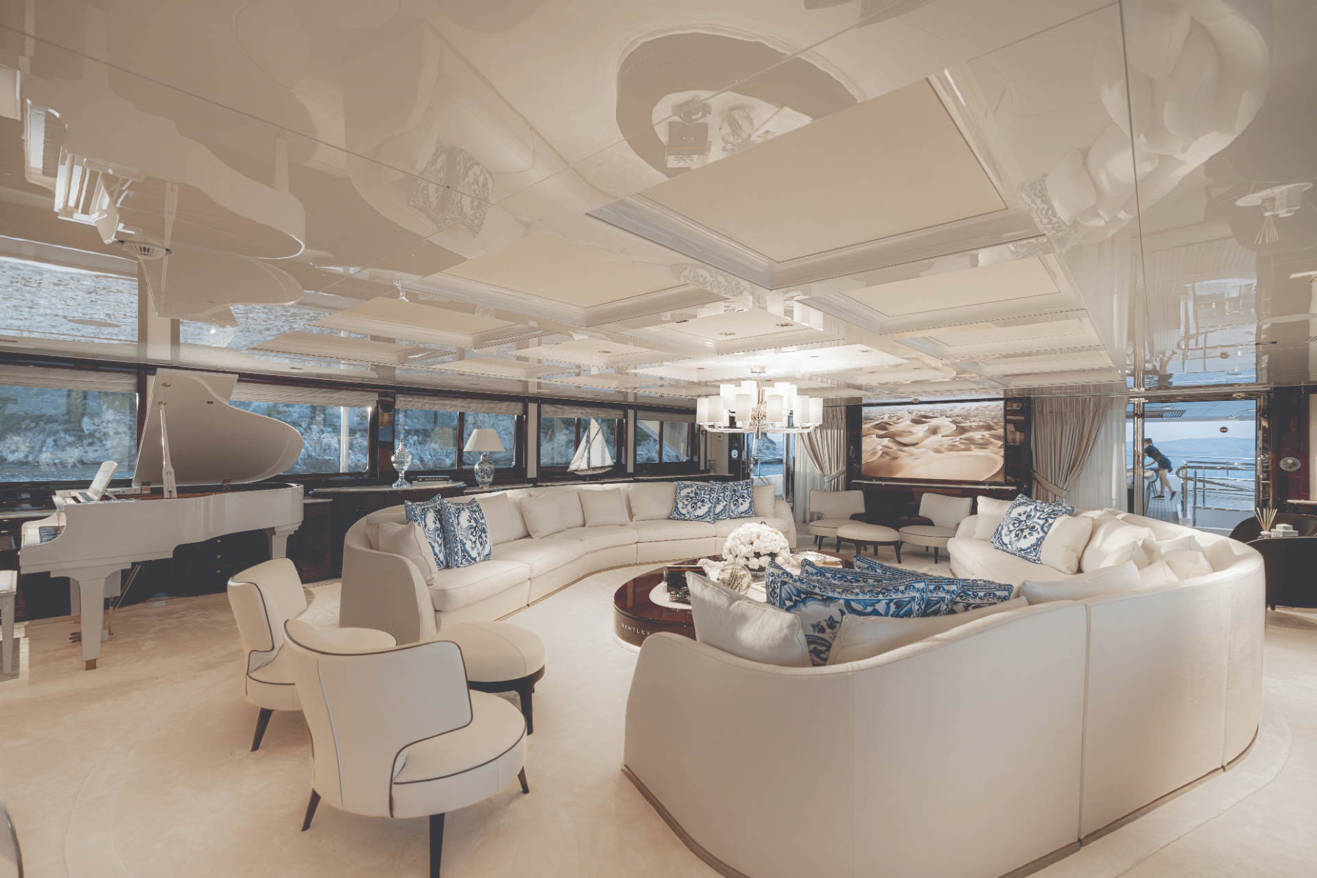 The interior of the 82m superyacht EMIR oozes elegance. The main deck is where the saloon is located, Here the light colours pair exquisitely with the cherry wood and exaggerate what is already an incredibly spacious interior. Further through is the main interior dining area with two long, formal dining tables. This deck makes the yacht ideal for large parties. Whether these are corporate events, birthdays, weddings or more, EMIR can cater for the occasion. She has a 28-strong crew on board and a capacity for massive 270 guests at quayside!