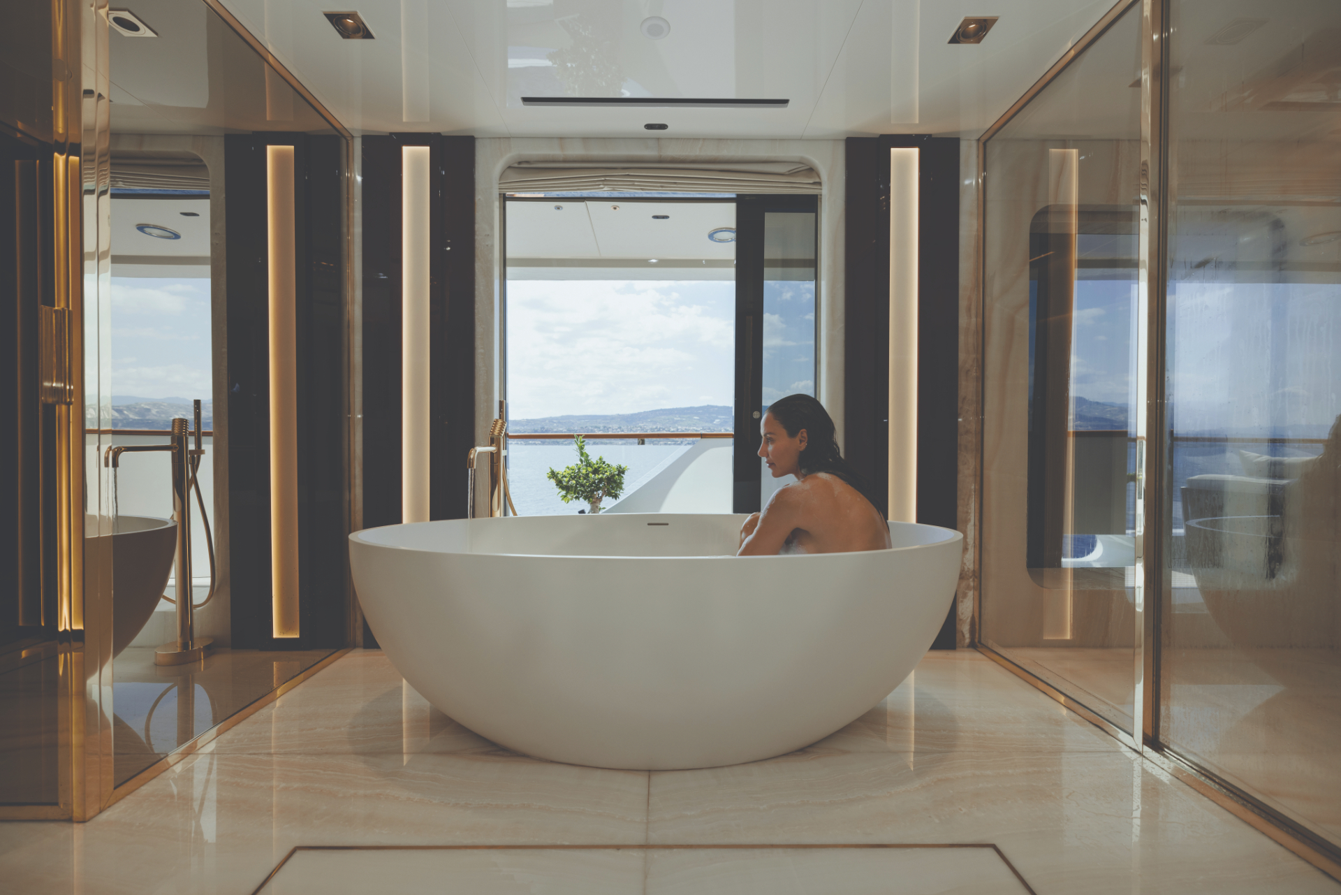The sun deck is one of six voluminous deck spaces on board the 82m superyacht EMIR. This beautifully expansive deck features a Jacuzzi with a large lounging spot around it. Also on this deck are numerous sun loungers and an additional relaxation area for guests to soak up the sun in. At aft of the sun deck is a shaded dining area, ensuring guests do not have to venture too far from the ultimate relaxation spot and the sun to enjoy some alfresco dining.