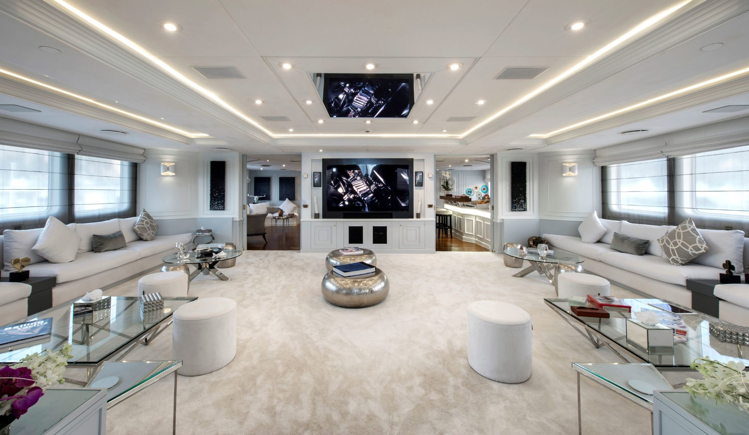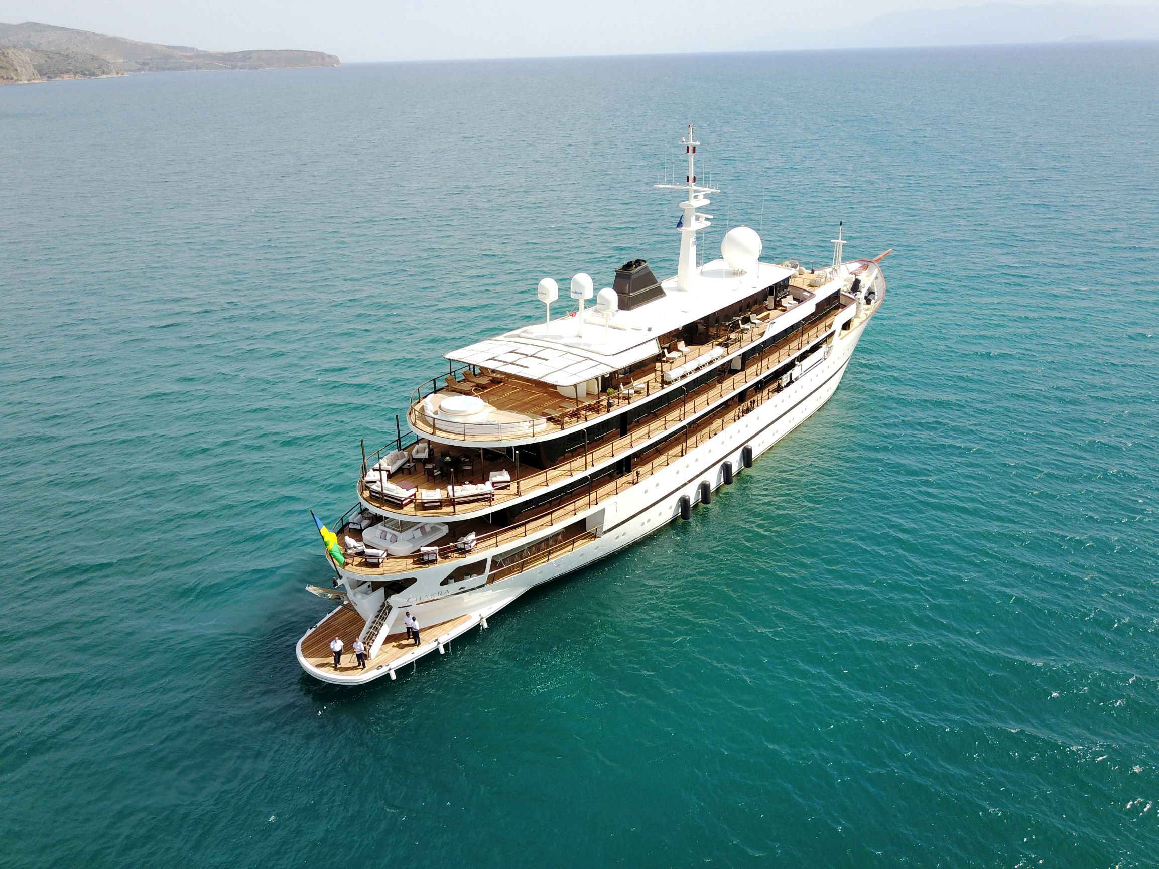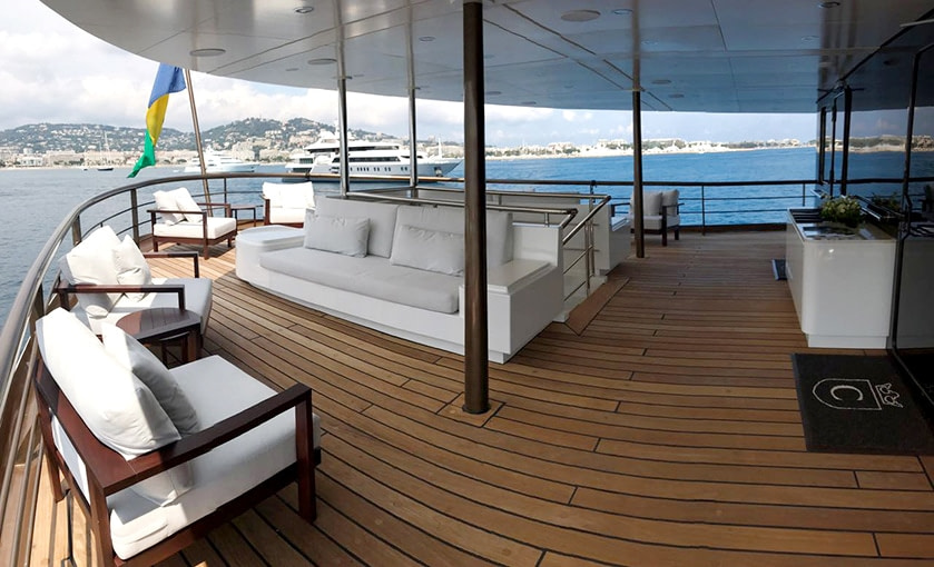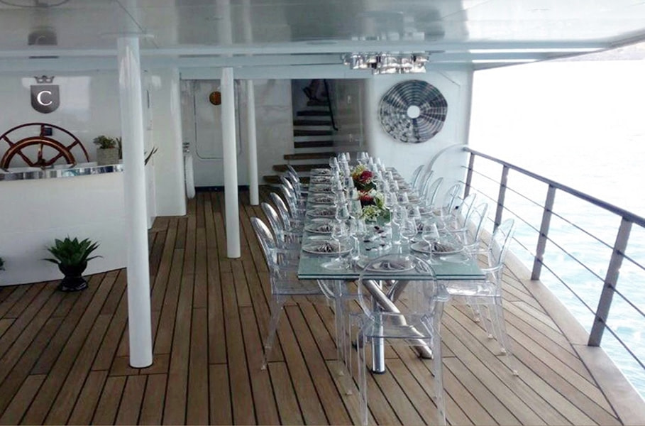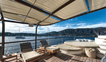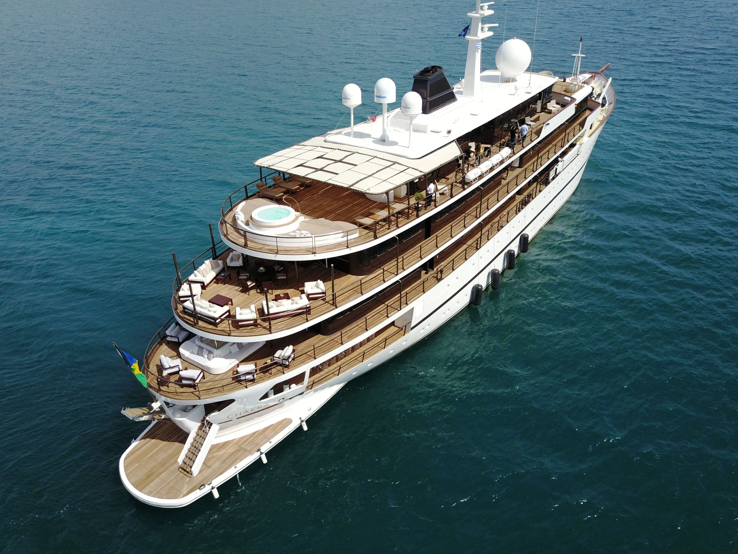 She was built by Scheepswerf Gebr. van der Werf in 1963 and recently refit by Devonport Yachts in 2017. Resulting in a light and chic design that is guaranteed to impress. There are multiple spacious decks on board making her a popular vessel for quayside events. She can cater for up to 200 guests. Her main aft deck has a large external dining area, perfect for all your guests to gather round and enjoy a gourmet meal. Prepared and catered for by the 30 strong crew on board. On upper decks there is plenty outdoor seating on beautiful white couches. Both in the shade and in the sun. The bridge deck offers the most spectacular views. All to be taken in while you sit back and relax in the deluxe Jacuzzi. Here there are also sun loungers, perfect for sunning and relaxing. Chakra has some excellent outdoor spaces. From a yoga area to a beach platform she has it all.