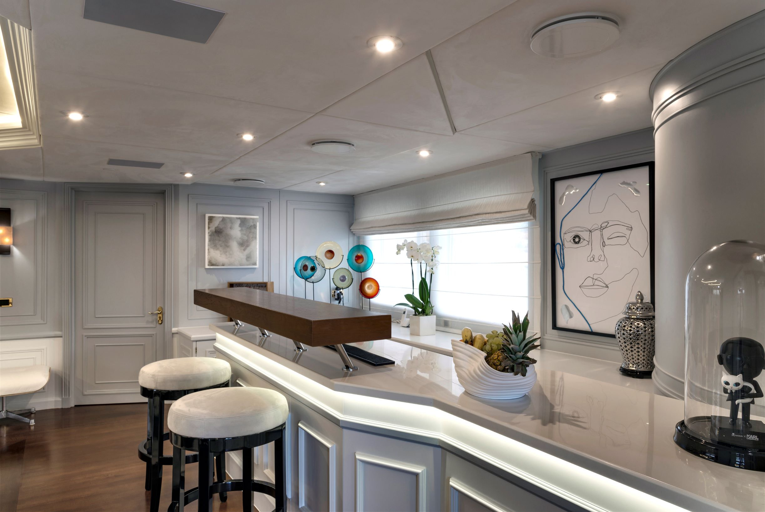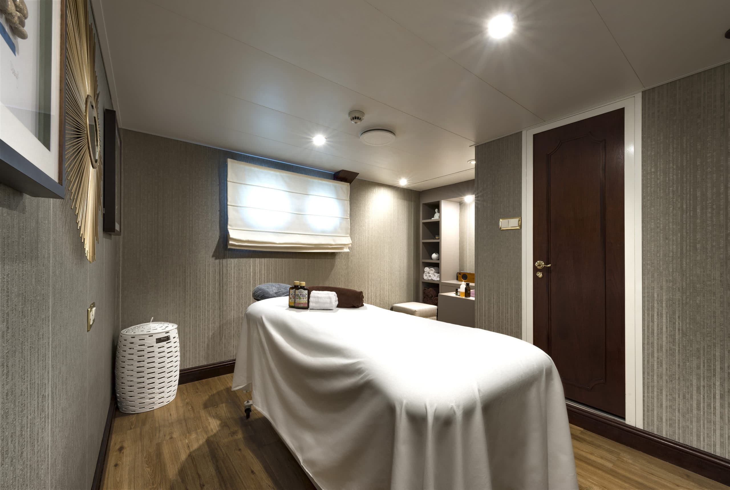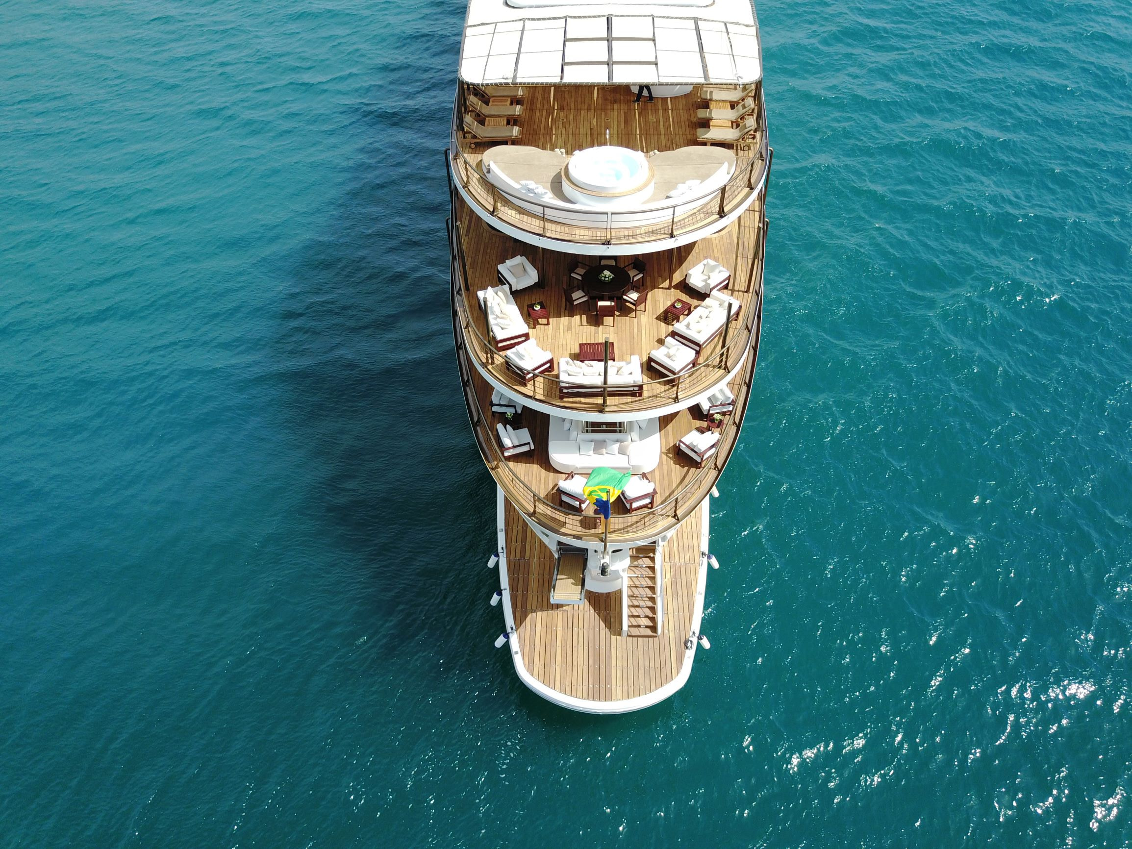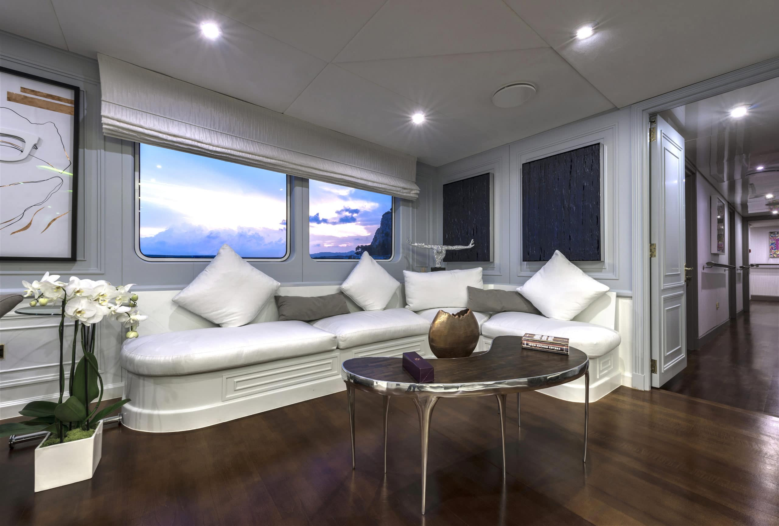 She was built by Scheepswerf Gebr. van der Werf in 1963 and recently refit by Devonport Yachts in 2017. Resulting in a light and chic design that is guaranteed to impress. There are multiple spacious decks on board making her a popular vessel for quayside events. She can cater for up to 200 guests. Her main aft deck has a large external dining area, perfect for all your guests to gather round and enjoy a gourmet meal. Prepared and catered for by the 30 strong crew on board. On upper decks there is plenty outdoor seating on beautiful white couches. Both in the shade and in the sun. The bridge deck offers the most spectacular views. All to be taken in while you sit back and relax in the deluxe Jacuzzi. Here there are also sun loungers, perfect for sunning and relaxing. Chakra has some excellent outdoor spaces. From a yoga area to a beach platform she has it all.