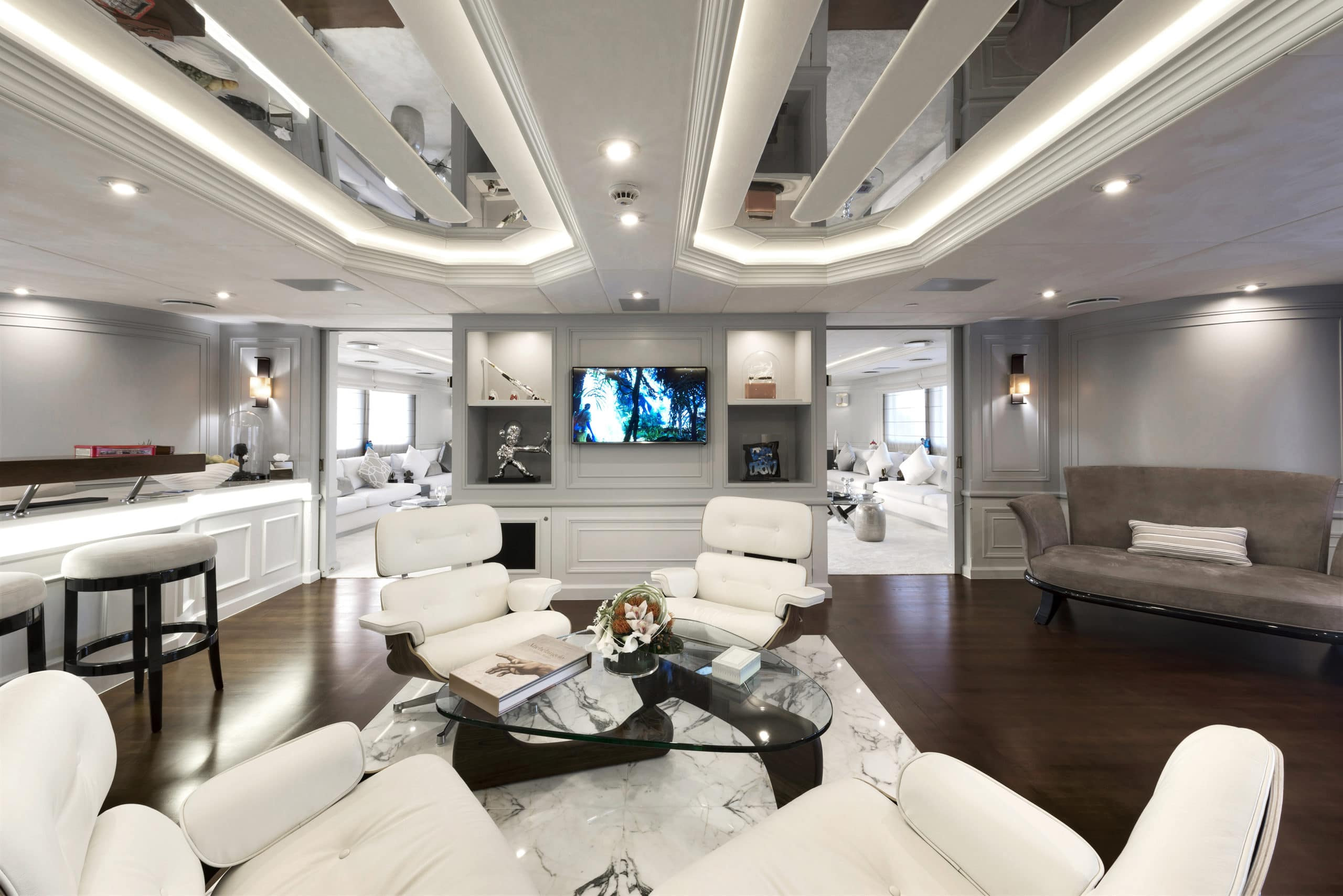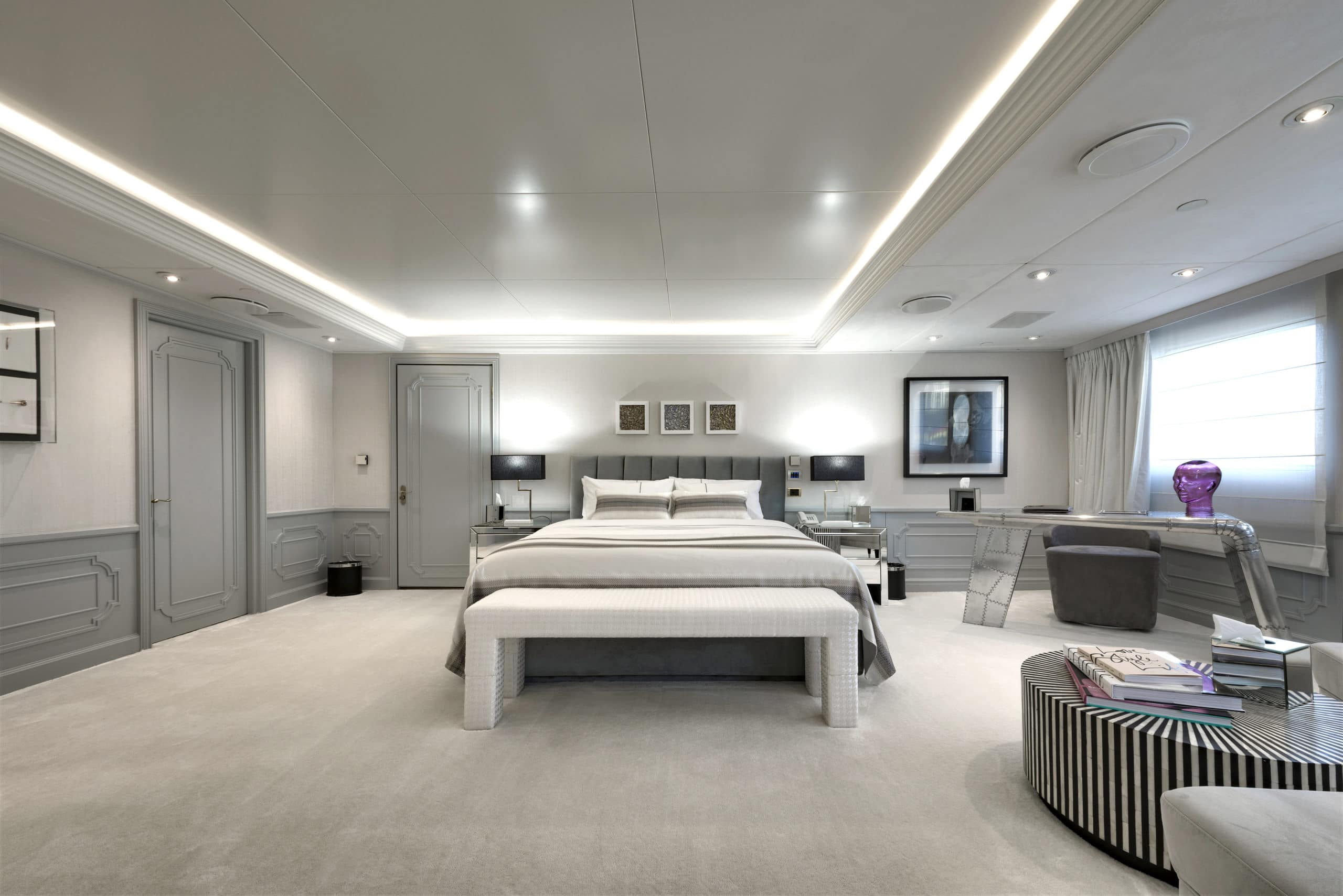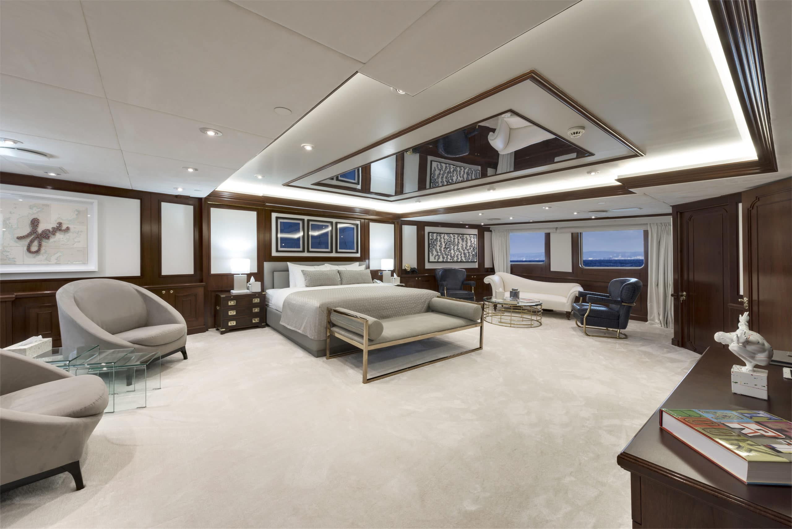 This Devonport superyacht charter is just as breath-taking on the inside. On an upper deck there is an impressive club area. Designed with stylish, modern furnishings and even a lounge bar with a piano. Your guests will feel spoilt enjoying a cocktail here after a day on the water. Downstairs is the main saloon. An elegant space that can cater for all your 24 guests at once. With huge windows she offers panoramic views of your beautiful charter destination. Ensuring you never miss anything. This leads on to the expansive interior dining area which can seat all your guests if you would rather enjoy a meal inside. On board there is also a beauty parlour, a massage room and a fully equipped gym. You and your guests will really get the VIP treatment on board Chakra – and at no extra cost!