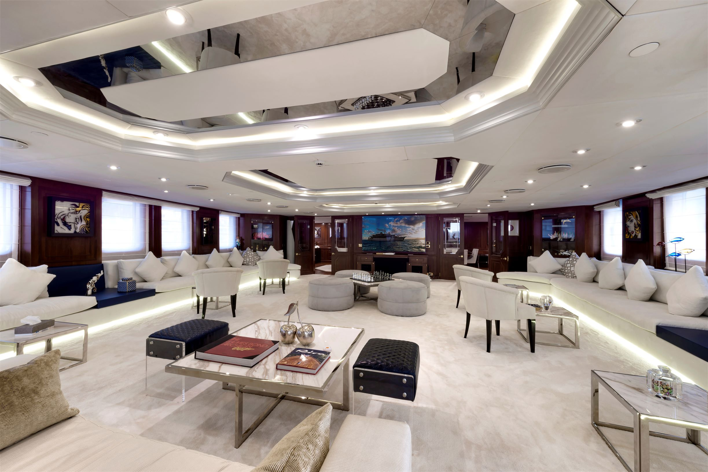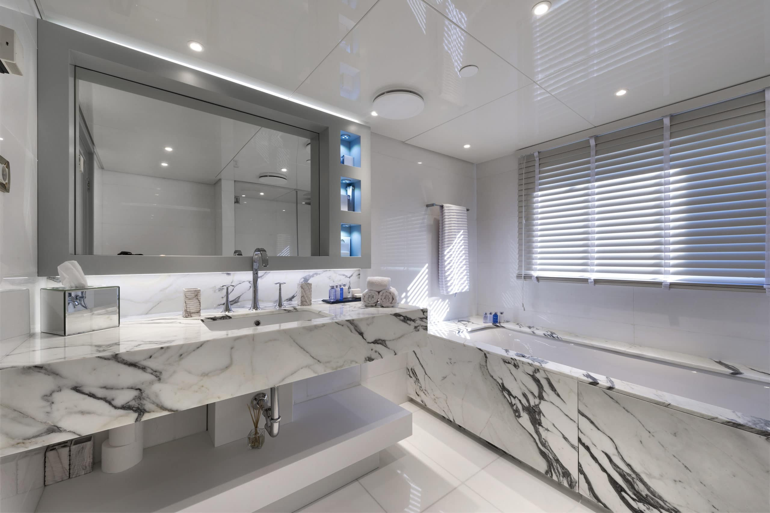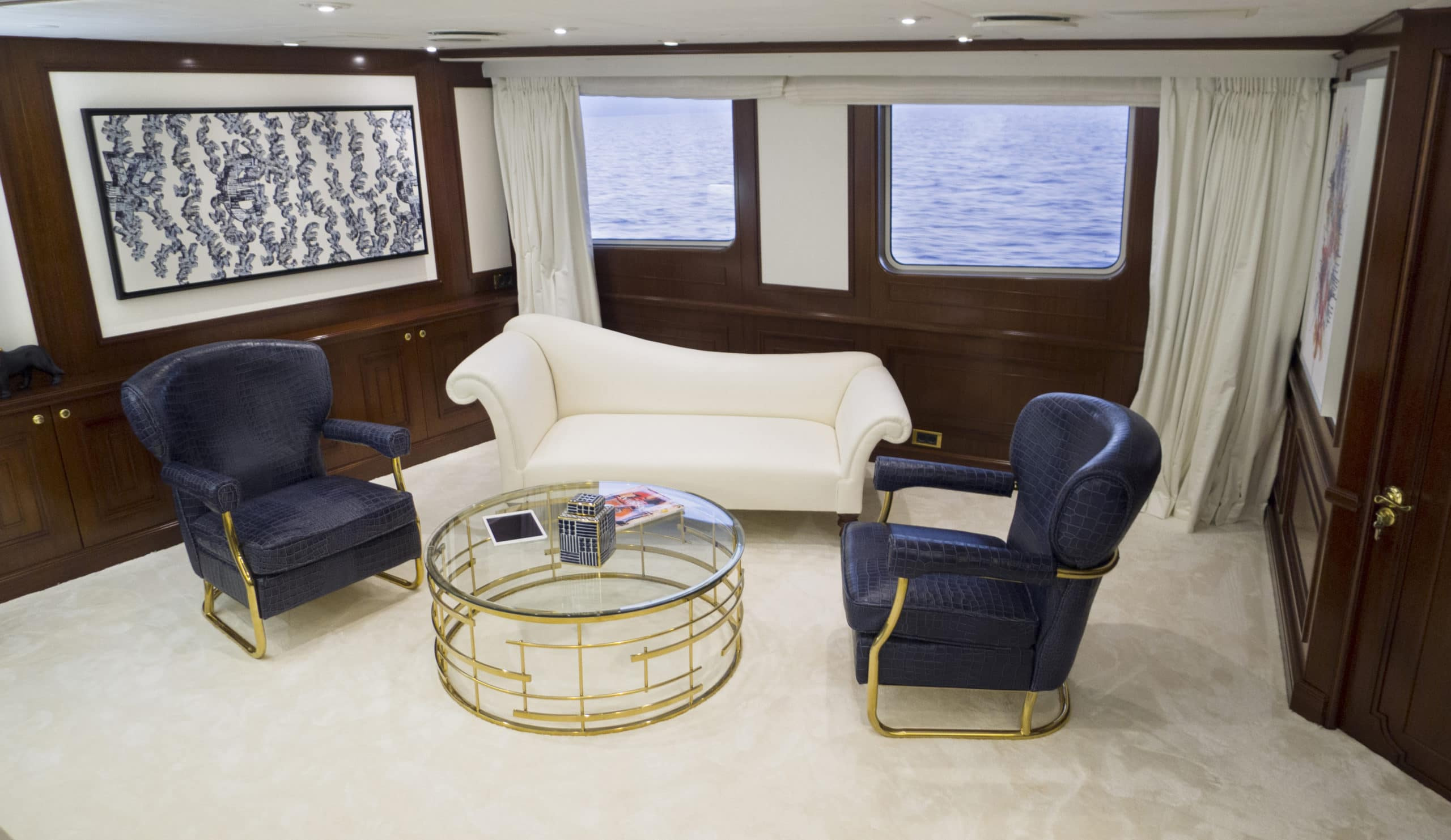 This Devonport superyacht charter is just as breath-taking on the inside. On an upper deck there is an impressive club area. Designed with stylish, modern furnishings and even a lounge bar with a piano. Your guests will feel spoilt enjoying a cocktail here after a day on the water. Downstairs is the main saloon. An elegant space that can cater for all your 24 guests at once. With huge windows she offers panoramic views of your beautiful charter destination. Ensuring you never miss anything. This leads on to the expansive interior dining area which can seat all your guests if you would rather enjoy a meal inside. On board there is also a beauty parlour, a massage room and a fully equipped gym. You and your guests will really get the VIP treatment on board Chakra – and at no extra cost!