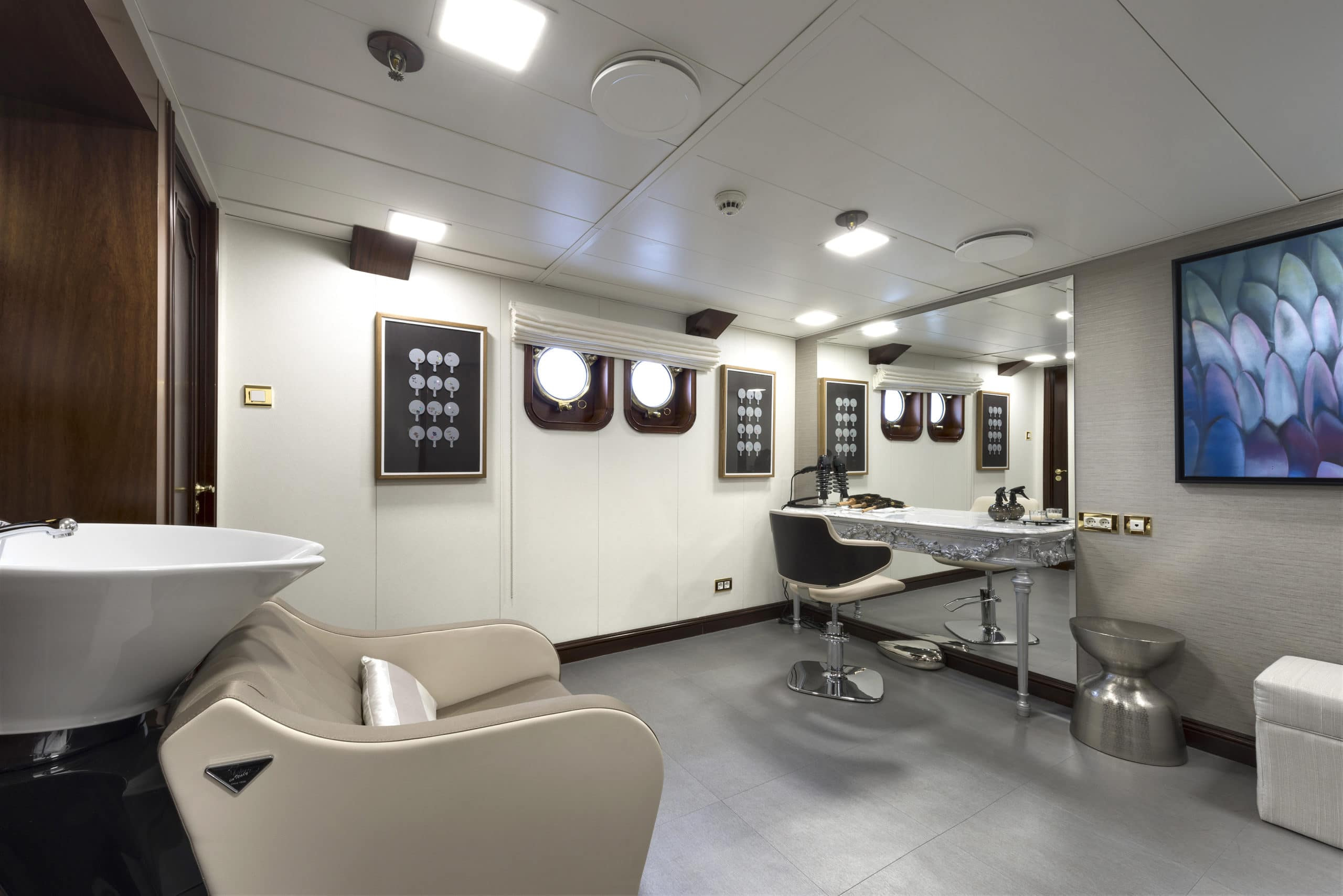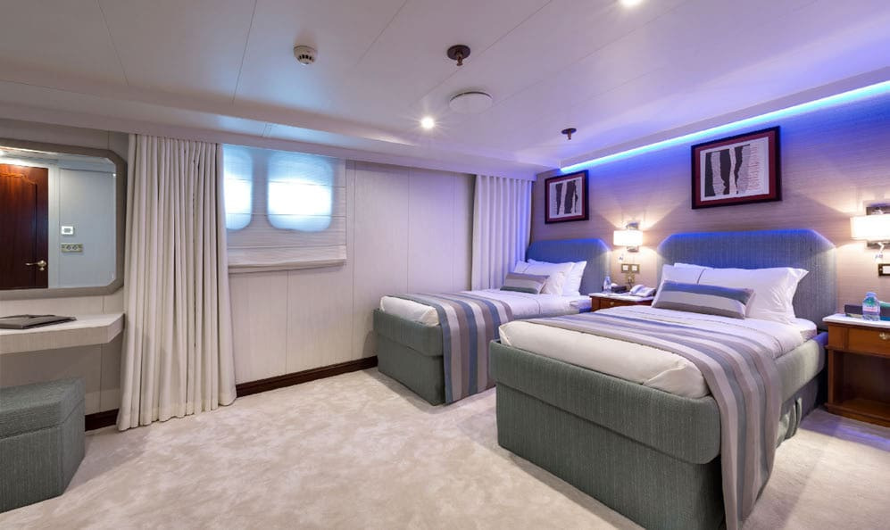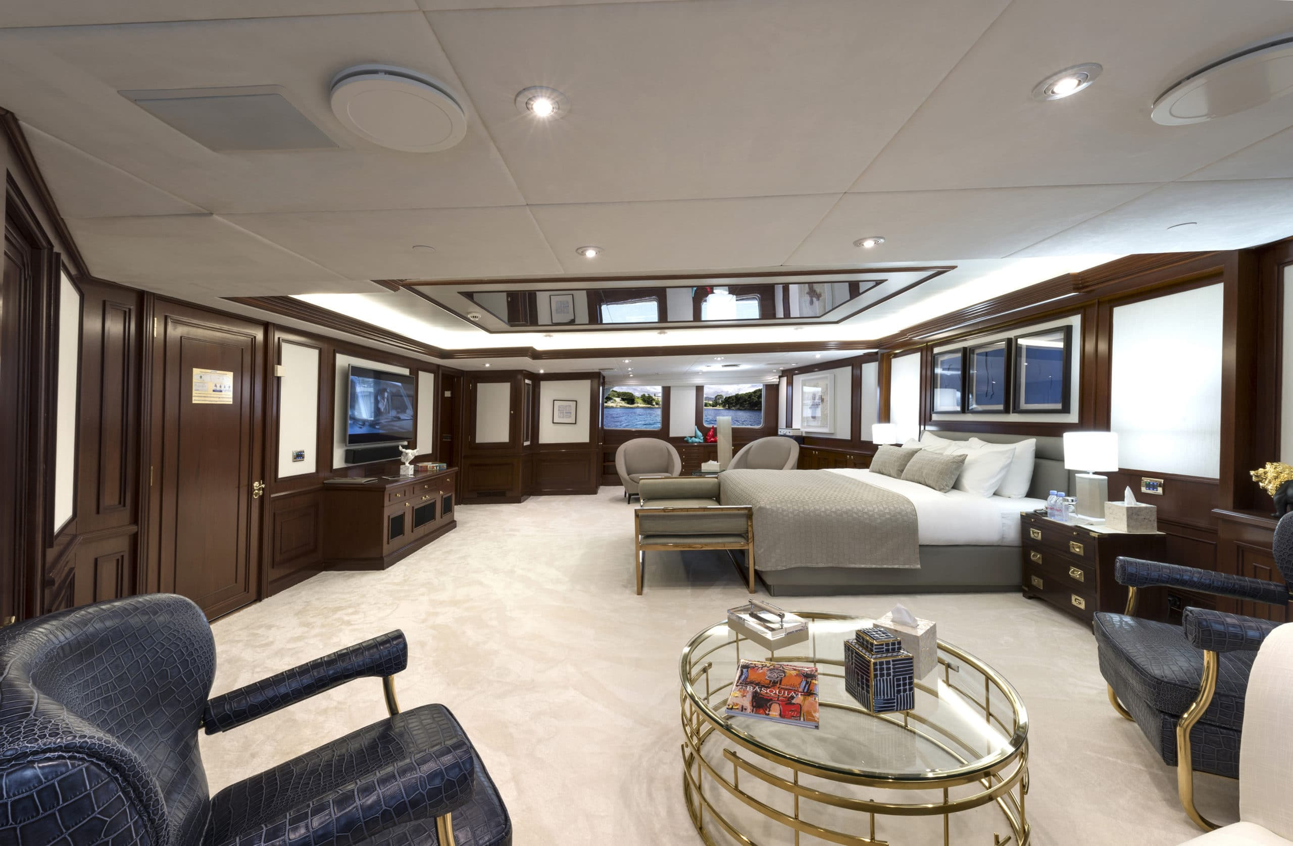The accommodation on board Chakra are comparable to the finest hotel. The owner’s cabin is a full beam, state of the art facility. With its own private office, luxurious bathroom and walk in wardrobe. Her master cabin is equally impressive. Another spacious and beautifully designed cabin with a marble en suite. Also, on board are 7 VIP suites which put the master cabins on most yachts to shame. 6 Double suites, 4 twin cabins and lastly 2 single cabins. Her 20 cabins in total can accommodate 24 guests, giving them the utmost comfort and luxury. The guest quarters have complete privacy as all her crew sleep completely separate on the lower deck. Chakra also boasts at anchor stabilisers ensuring that even at night, you have the most enjoyable time on board.
