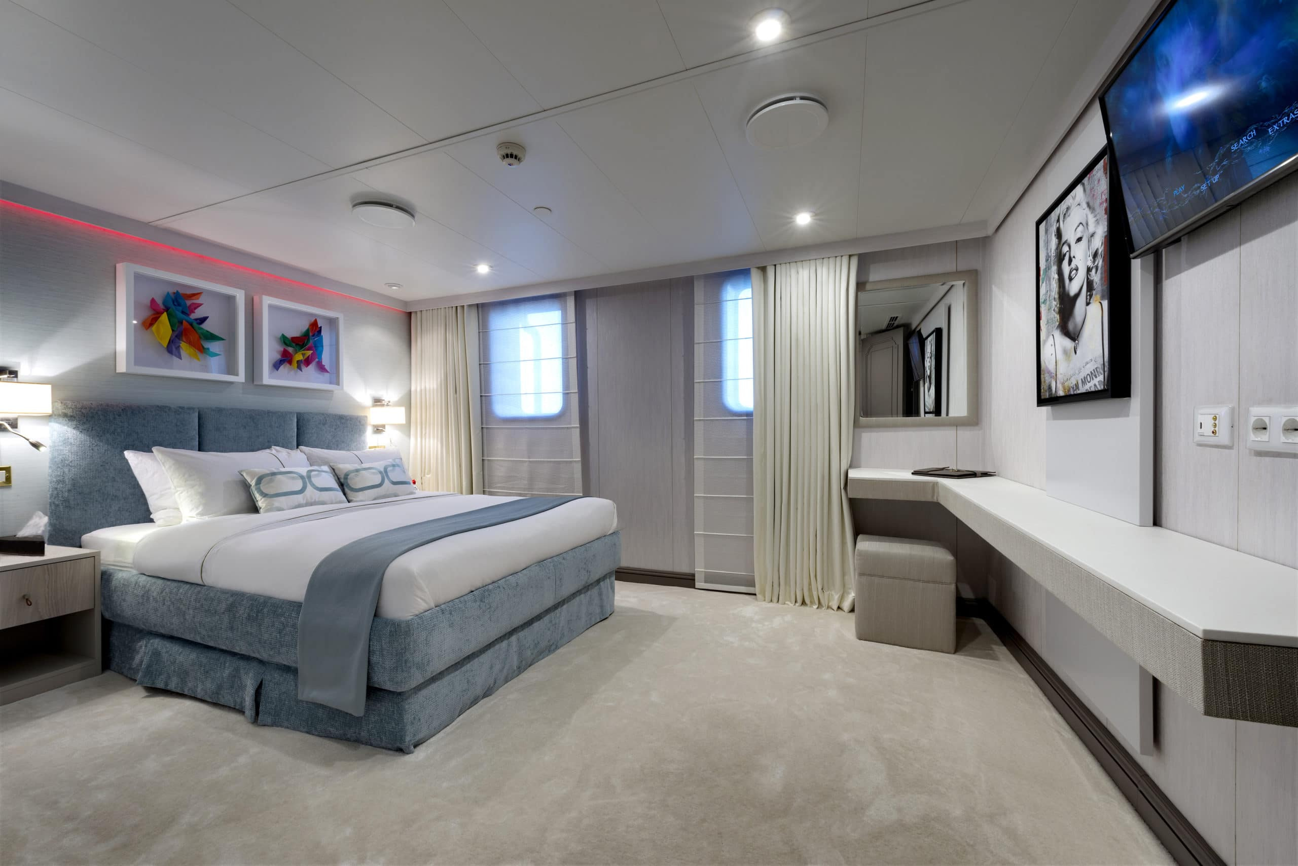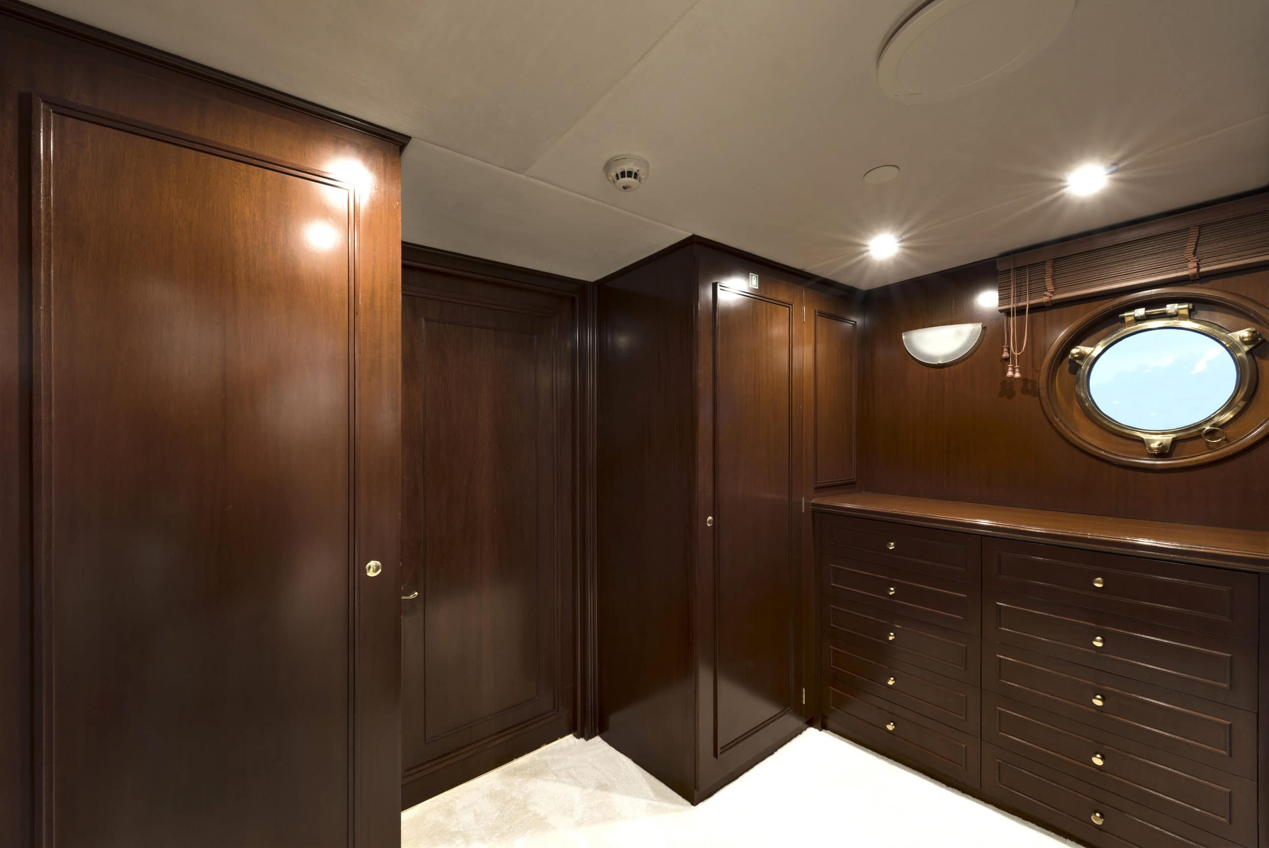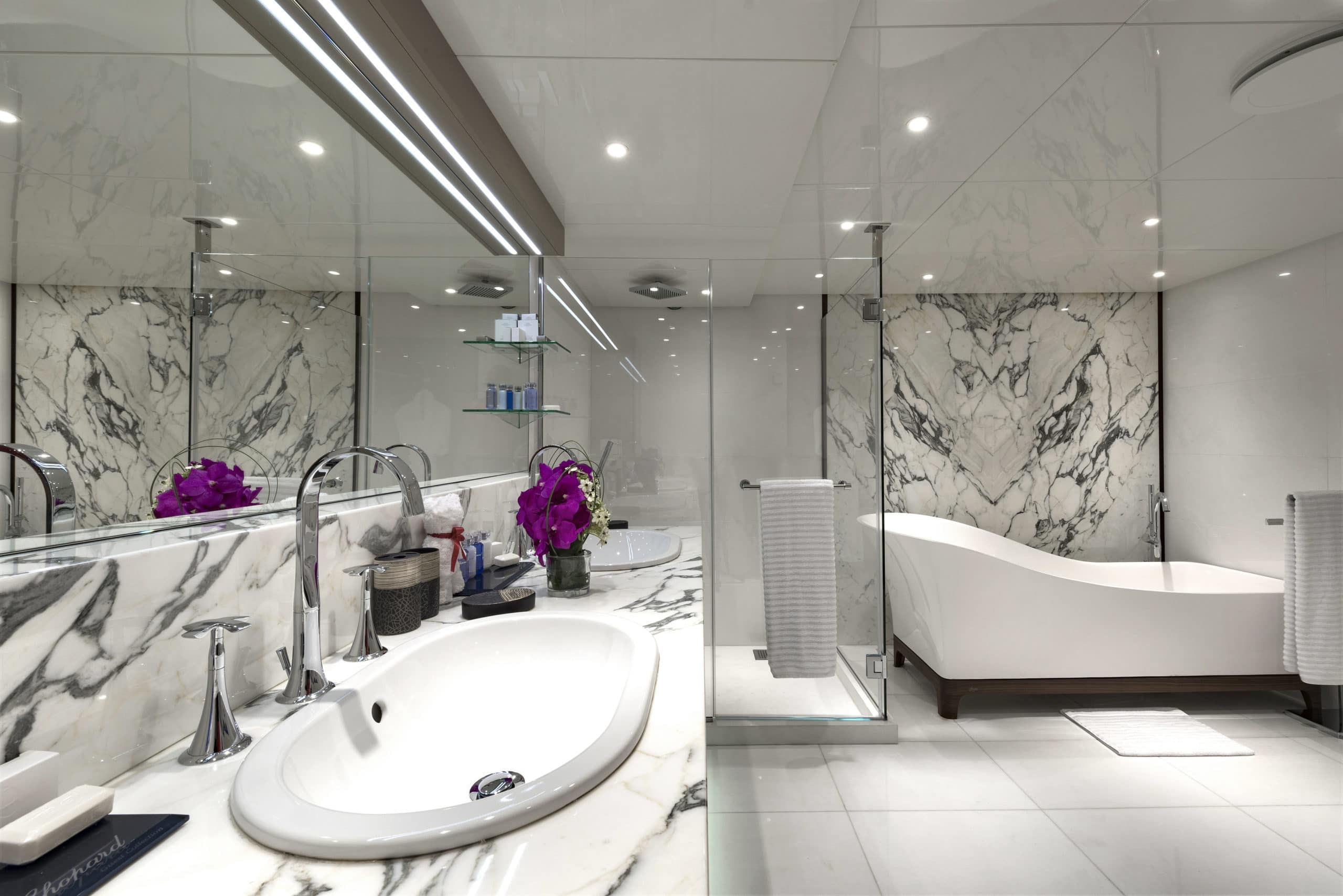 The accommodation on board Chakra are comparable to the finest hotel. The owner’s cabin is a full beam, state of the art facility. With its own private office, luxurious bathroom and walk in wardrobe. Her master cabin is equally impressive. Another spacious and beautifully designed cabin with a marble en suite. Also, on board are 7 VIP suites which put the master cabins on most yachts to shame. 6 Double suites, 4 twin cabins and lastly 2 single cabins. Her 20 cabins in total can accommodate 24 guests, giving them the utmost comfort and luxury. The guest quarters have complete privacy as all her crew sleep completely separate on the lower deck. Chakra also boasts at anchor stabilisers ensuring that even at night, you have the most enjoyable time on board.