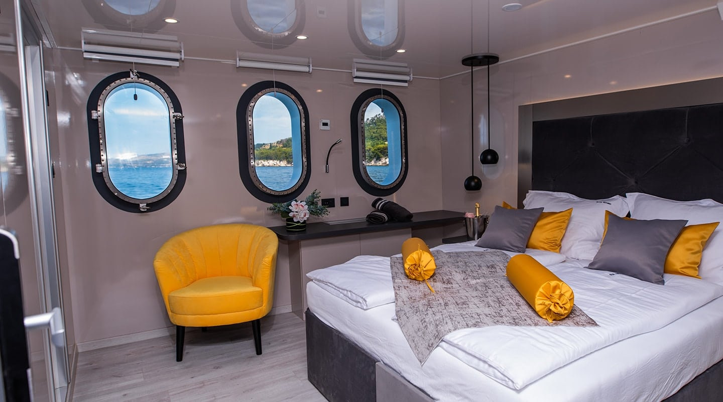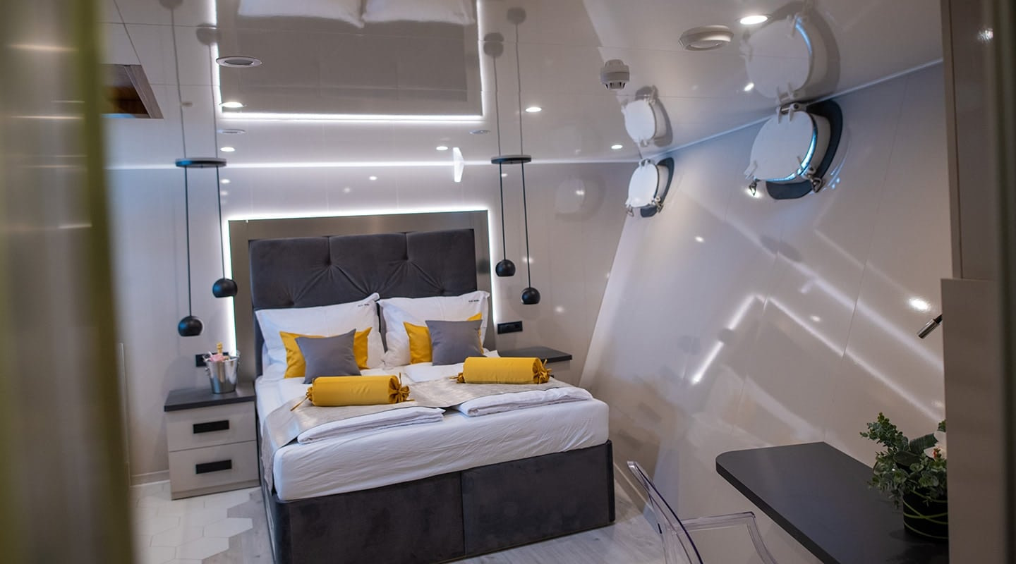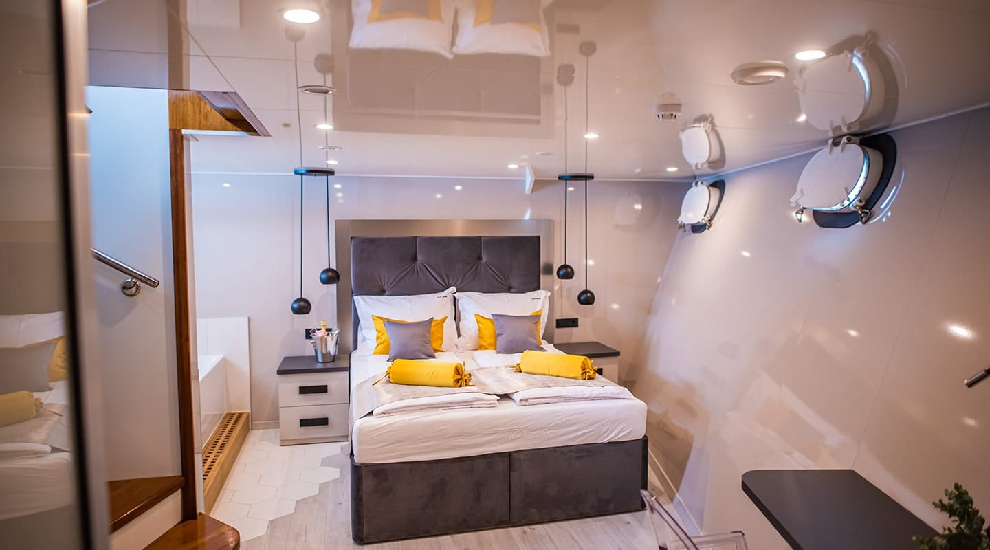 This yacht accommodates 30 guests sleeping. There are 15 cabins including a master suite, ten double cabins, and four twin cabins. These cabins are very comfortable and spacious. The color theme is white, grey, and, yellow. Some of the en-suites have a bathtub. There is room to accommodate up to 11 crew. This ensures that all your needs can be looked after while onboard.