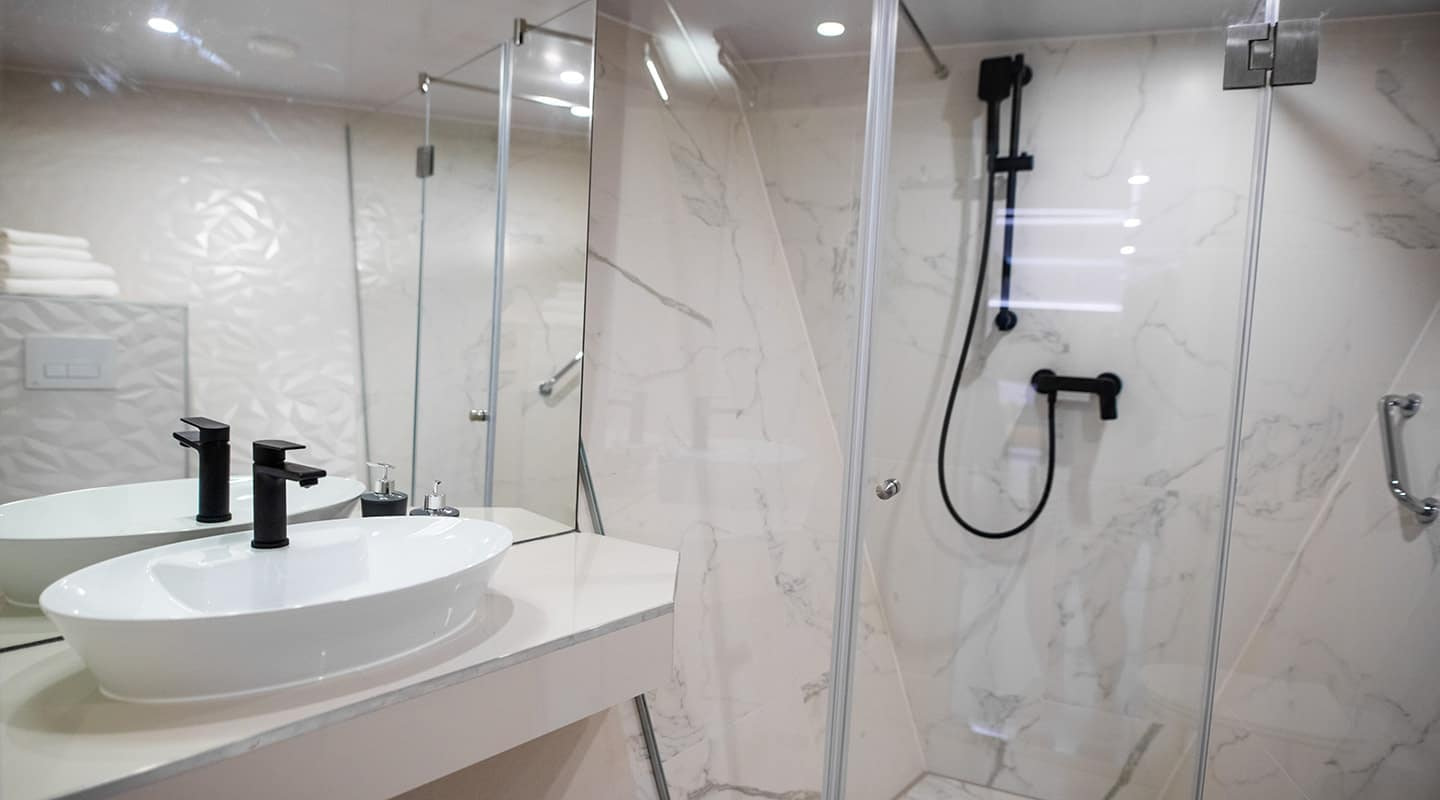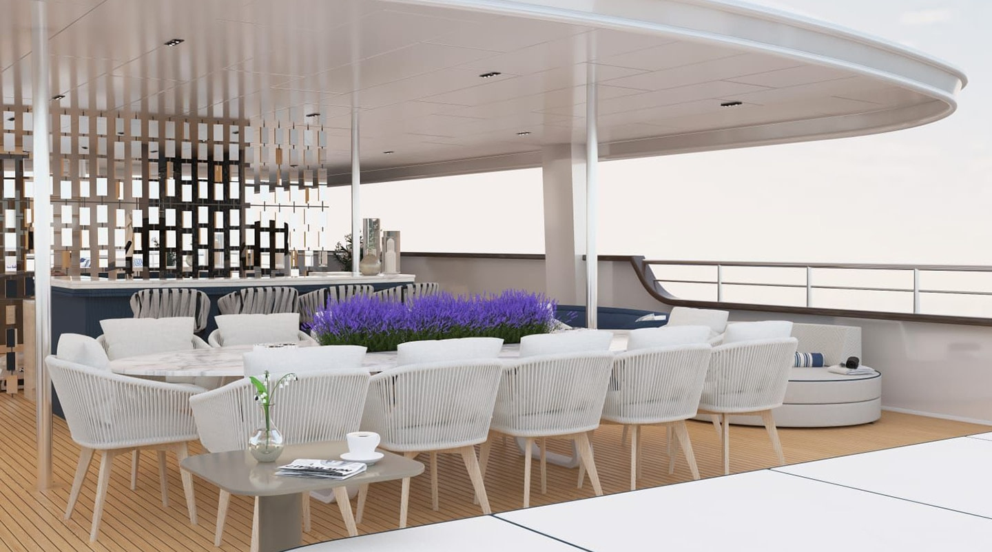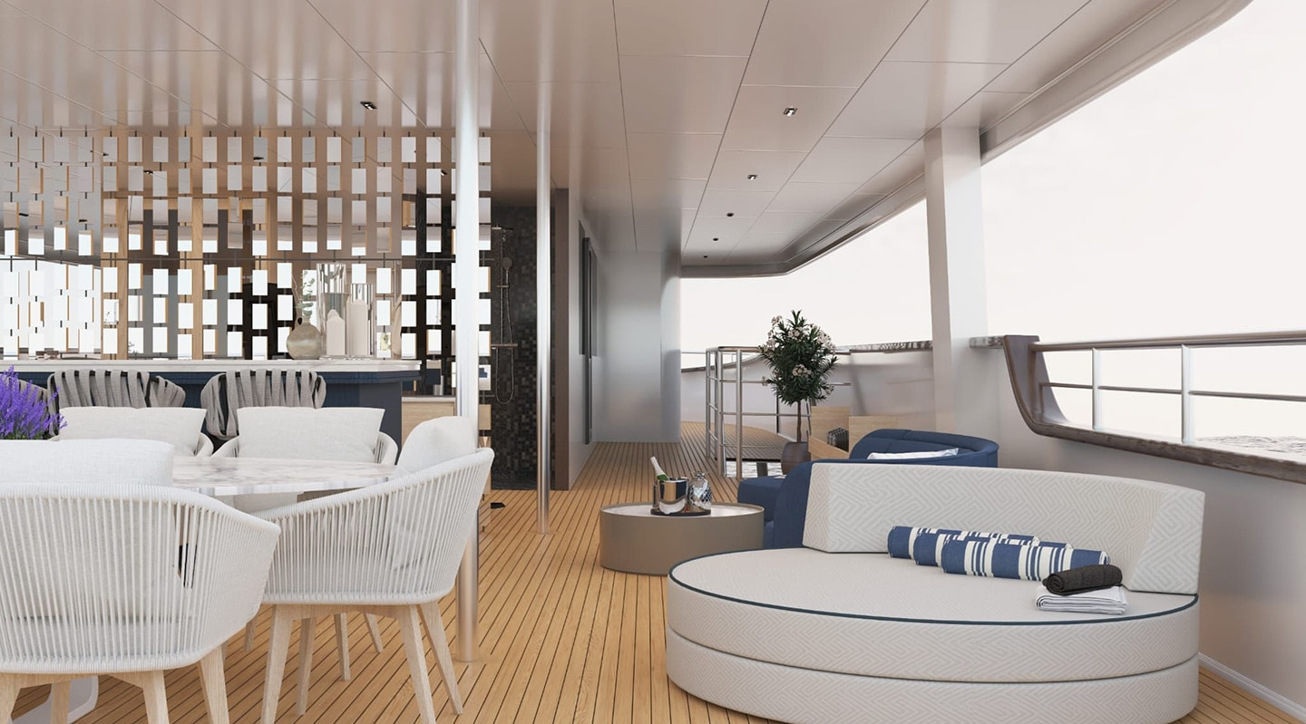 This yacht accommodates 30 guests sleeping. There are 15 cabins including a master suite, ten double cabins, and four twin cabins. These cabins are very comfortable and spacious. The color theme is white, grey, and, yellow. Some of the en-suites have a bathtub. There is room to accommodate up to 11 crew. This ensures that all your needs can be looked after while onboard.
