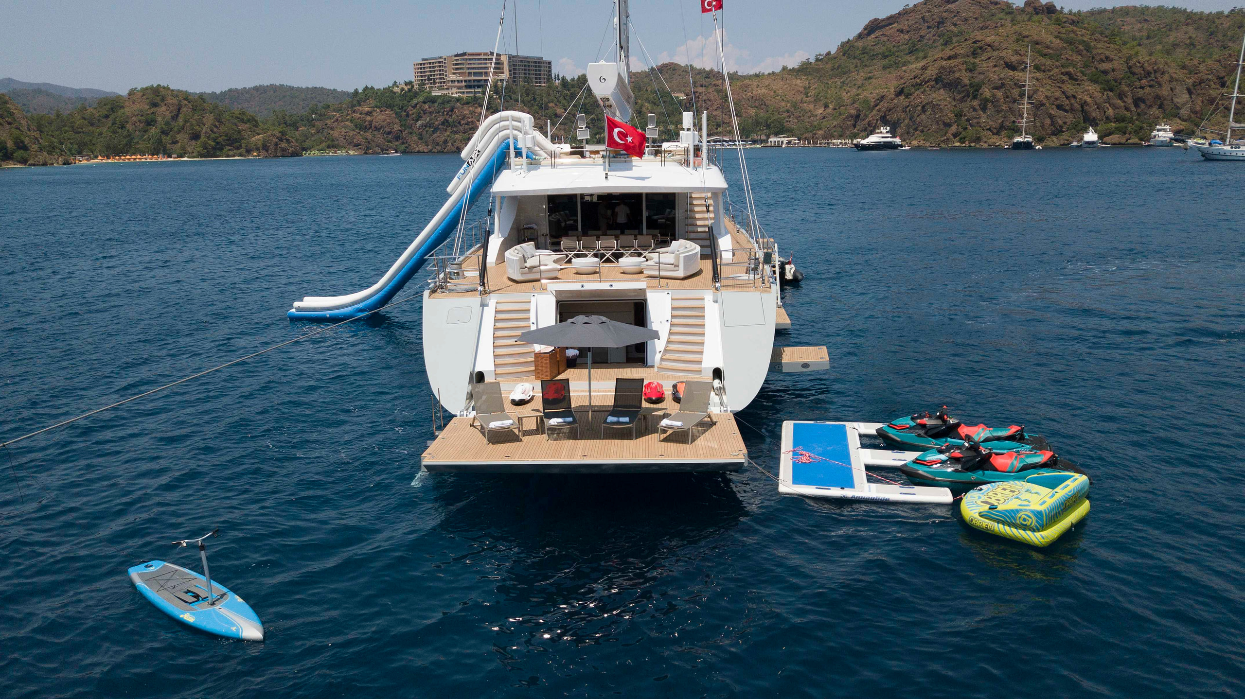 The water toys onboard ALL ABOUT U 2 include 2 x Jet Skis, 2 x SEABOBs, Water skis, Wakeboards, an Inflatable jet ski dock and a RIB Tender for shore access.