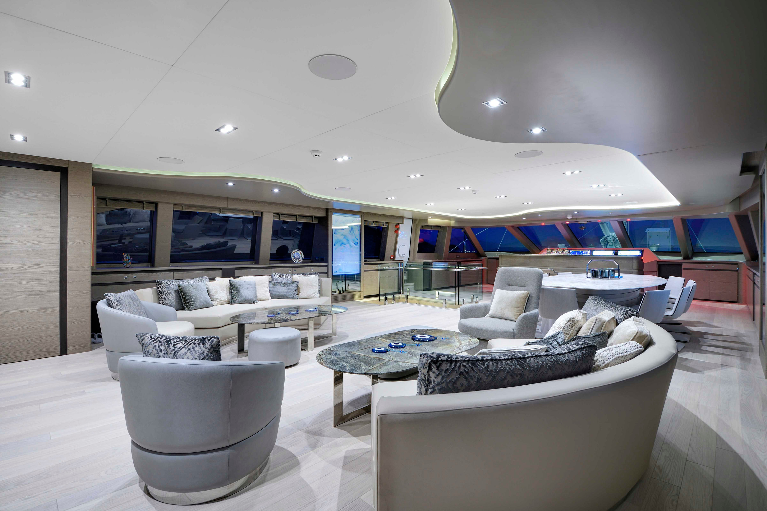 On deck, guests can unwind in sunpads, sip cocktails at the exterior bar, or cool off in the beach club with seamless sea access.
