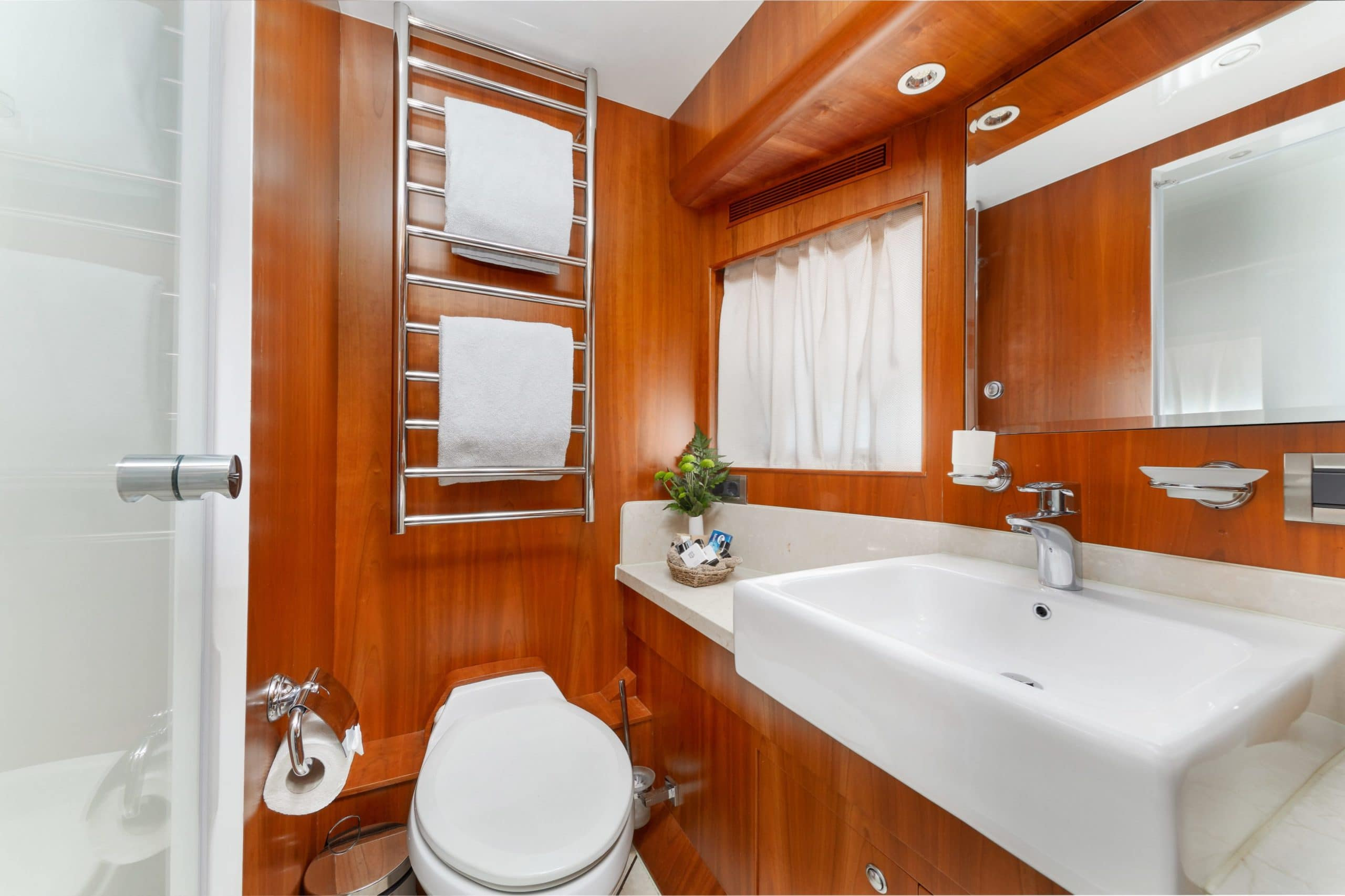Annabel II can sleep up to 10 guests comfortably on board. Her four versatile cabins mean that she can accommodate various sleeping arrangements. She boasts a full beam Master State room for her head charterers to enjoy with an ensuite. A VIP cabin and two twin cabins which can be converted into a full width King cabins, depending on the preferences of the guests on board. Annabel II has a large open plan salon with top of the range entertainment systems to enjoy after a long day spent making the most of the beautiful East Mediterranean weather. Annabel is fully air conditioned and has Wi-Fi available throughout the vessel. She also has stabilizers at anchor to ensure that you and your guests experience the utmost comfort while on board.