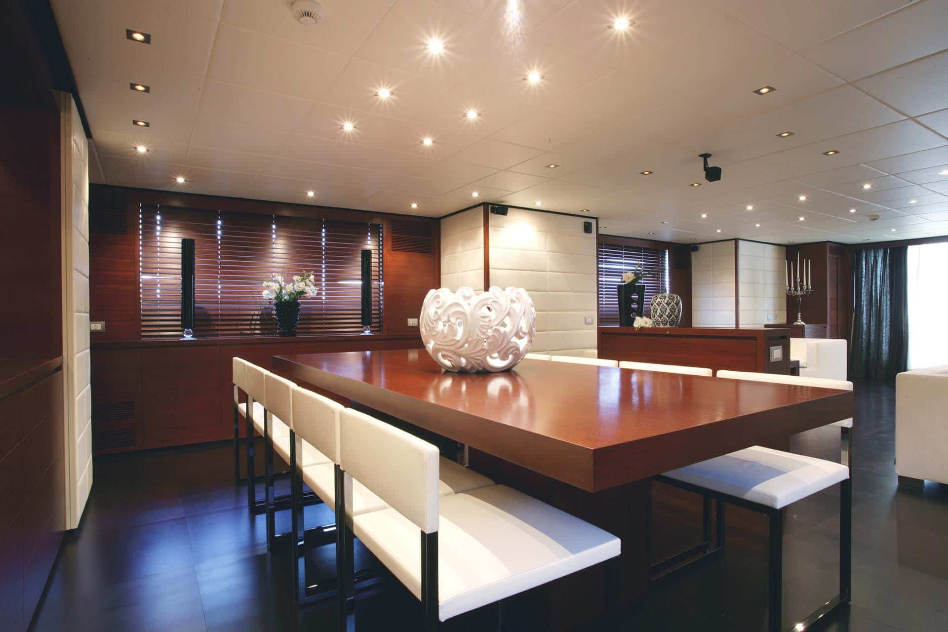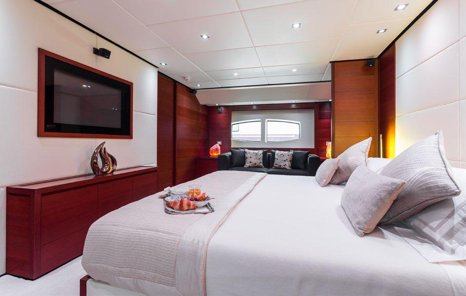 The interior of the yacht was designed by Francesco Paszkowski, who has done an excellent job in creating a modern yet sophisticated feel around the yacht. Up to twelve guests can sleep on board in her five stylish cabins. Which consist of 3 queen beds, 2 single beds and 2 Pullman beds. Inside the main saloon is a lounge area with comfortable sofas for when you need a break from the sun. Also featuring in the interior is a large, formal dining table and a study. All beautifully detailed to fit with the overall style of the rest of the yacht.