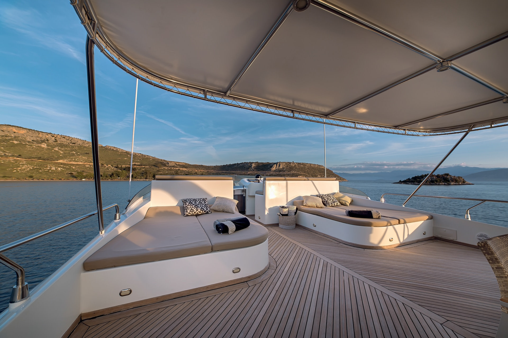 The spectacular exterior of this Aquila Motor Yacht is what attracts so many potential charters to this vessel. The aft is fresh and modern and features a long comfortable sofa, dining table and chairs, and coffee table and chairs set. What better place to enjoy your morning coffee while taking in the views? One can enjoy a refreshing breakfast while watching the sun come up. The flybridge is home to another fully equipped dining area as well as several lounge beds and sofas. It is spacious and beautifully laid out, and the ideal location for all guests to come together and watch the sunrise or sunset and soak up some rays during the day. For some privacy or chill time, one can retire to the front of the boat where there is another large sun bed and sunbathing space. From here, one also has a full 360-degree view of the breath-taking surroundings.