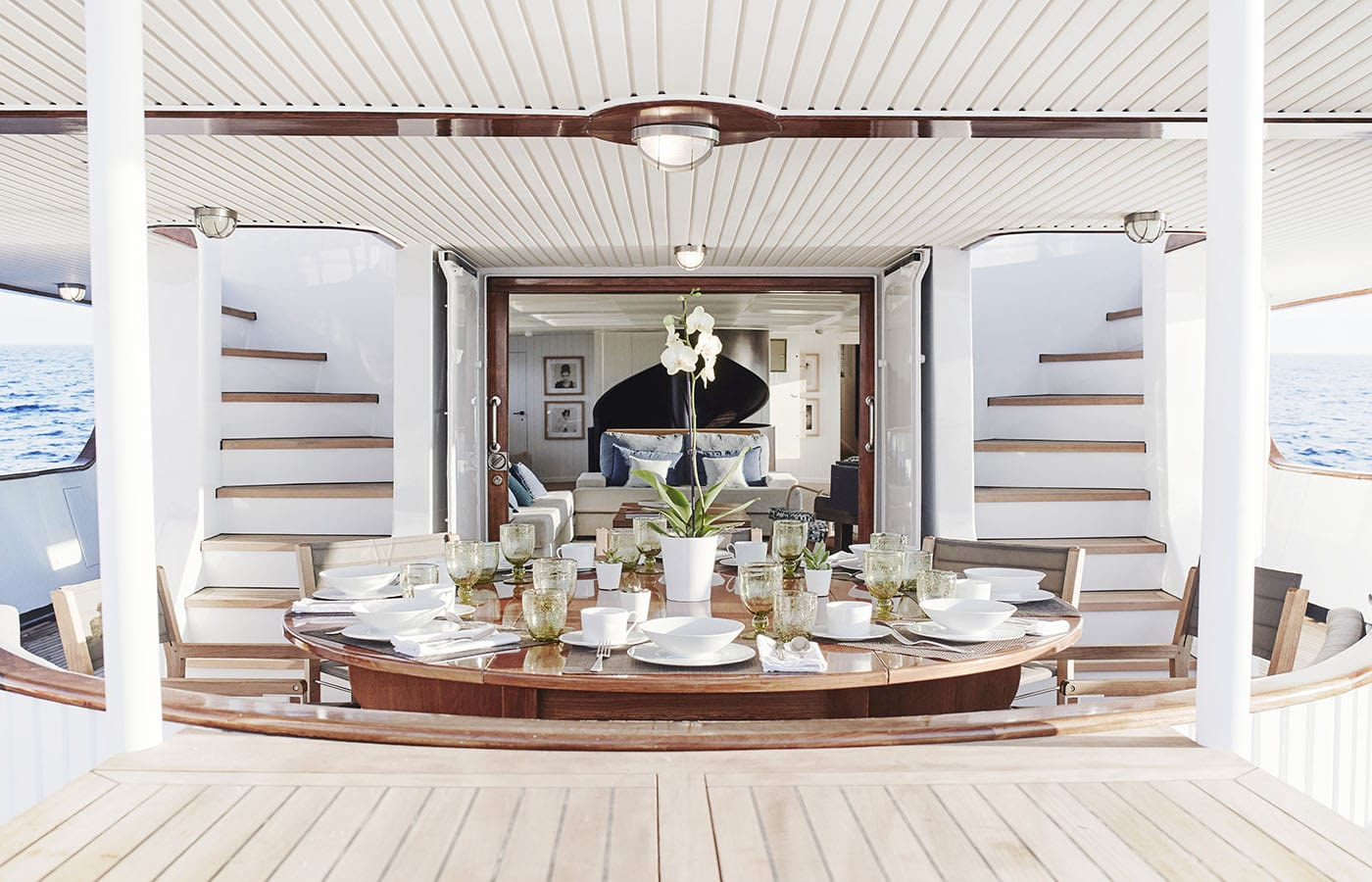 Moving inside the expert work of the French interior design company Mare e Terra is seen in every last detail. The overall feeling is one of elegance and a Hamptons-style sophistication. In the main saloon her grand piano and stunning spiral staircase are strong statement pieces, that catch your attention as you move into the space. The room has a light and airy feeling to it. Created by the large glass windows and white ceiling. This paired with the neutral and trendy furnishings create a beach house vibe. On the upper deck is the interior dining area. This elevated space offers breath taking 180-degree views of the sea. Here up to 14 guests can be seated and avail of the adjoining pantry and bar.