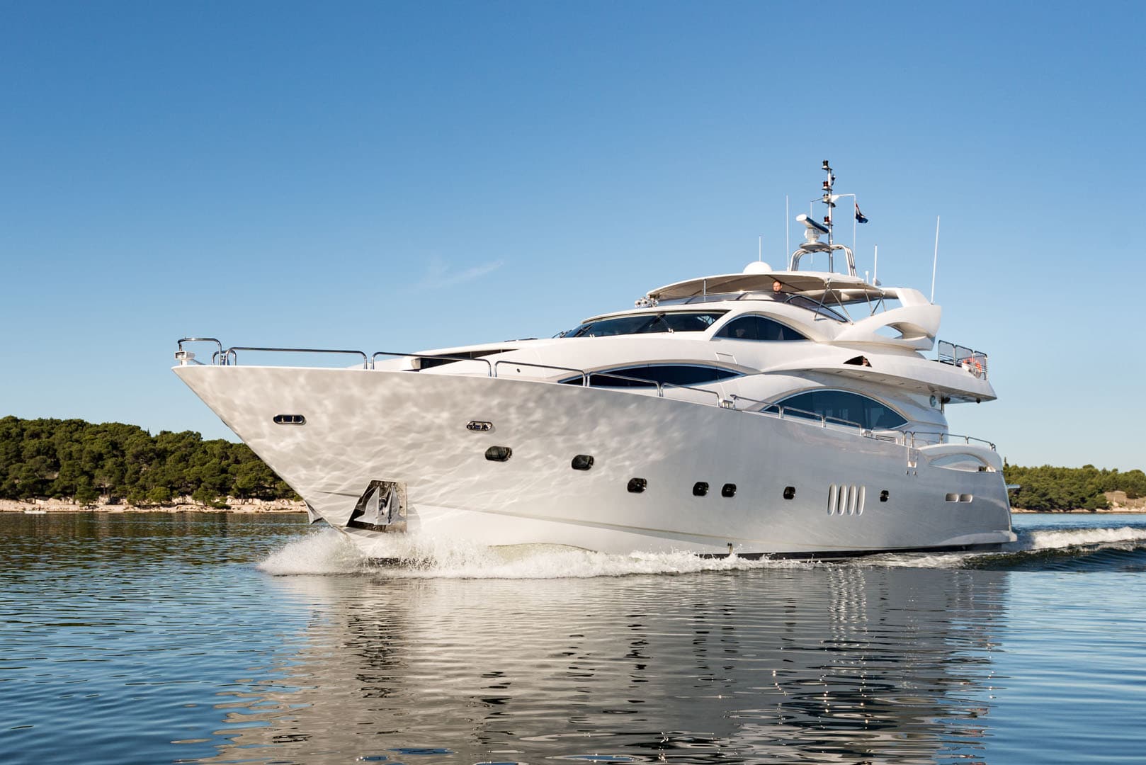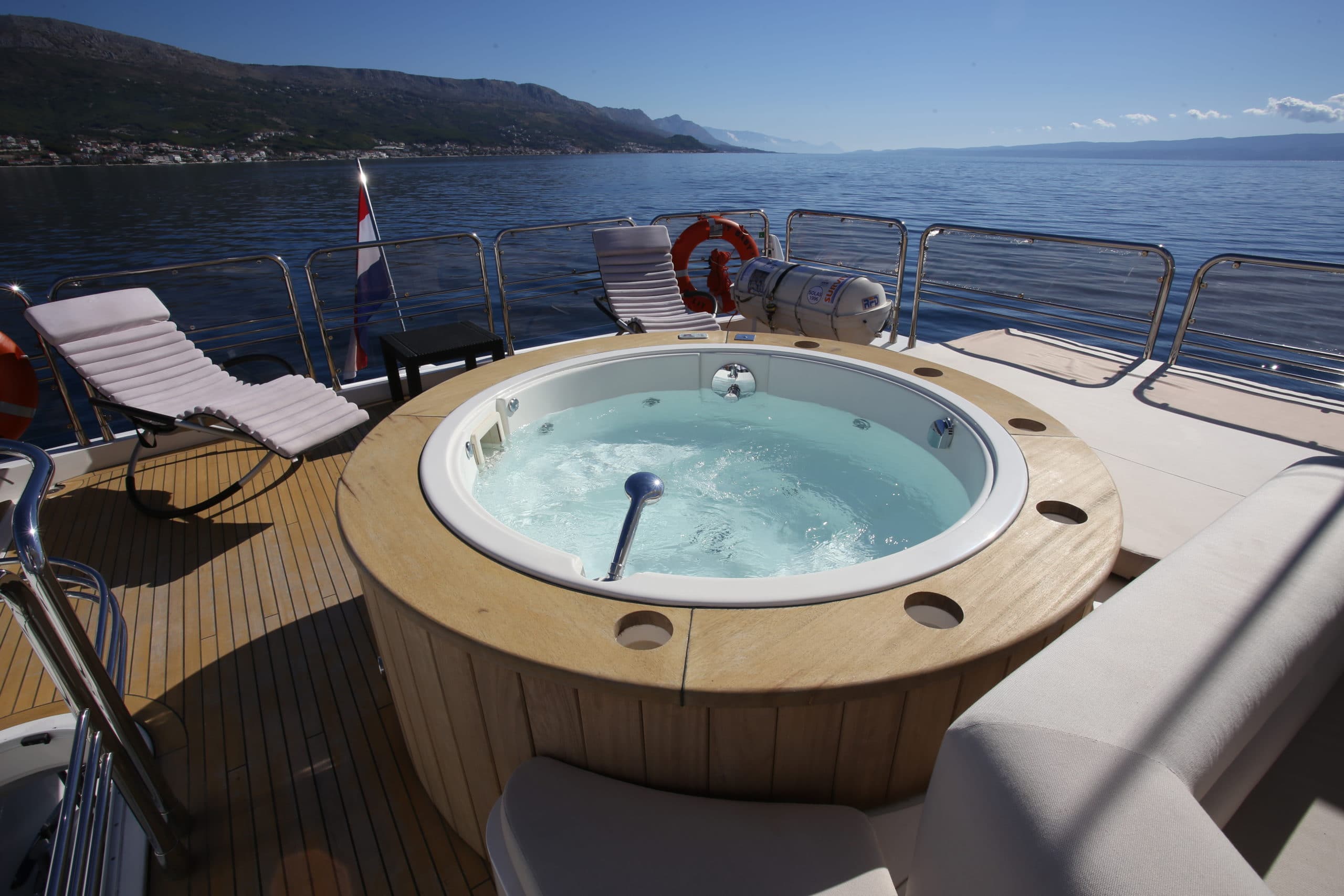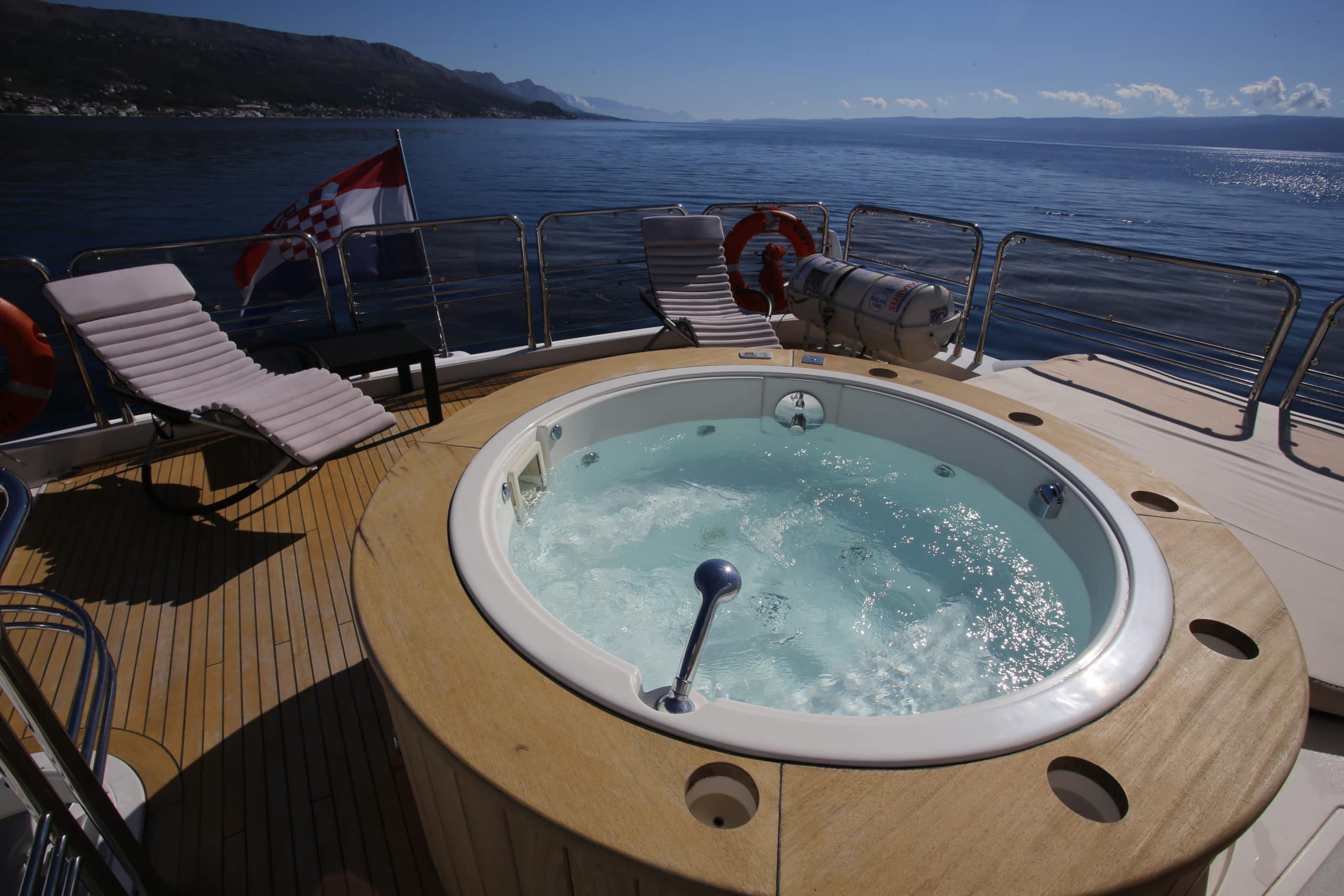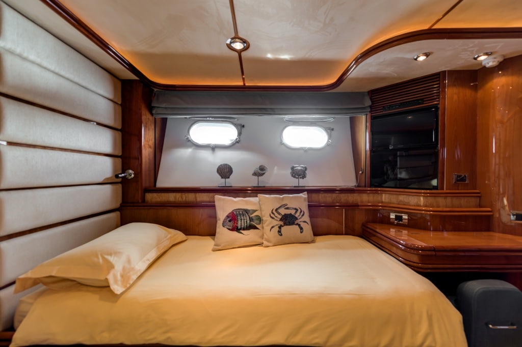 Moving inside this 30-meter Croatian masterpiece you enter into a modern and clean space thanks to BABY I’s refit in 2015. New interior furniture, sofas and carpets provide an up to date aesthetic. You also have a surprisingly spacious interior at your disposal. Feel free to relax after a day of soaking in the Mediterranean sun in the saloon enjoying the LCD TV and cinema surround sound or enjoy a freshly prepared meal around the dining table. This 30-meter Croatian yacht can comfortably facilitate up to 8 guests in 4 staterooms. The main VIP stateroom on the deck enjoys 180-degree views and direct access to the Jacuzzi for a truly relaxing experience. The master staterooms are can be found on the lower deck, these ample and lavish rooms are fully equipped with an en-suite including his and hers sinks and a separate room containing a steam shower. The master staterooms are accompanied by two twin staterooms of equal glamour and stock equipped with entertainment systems and en-suite facilities.