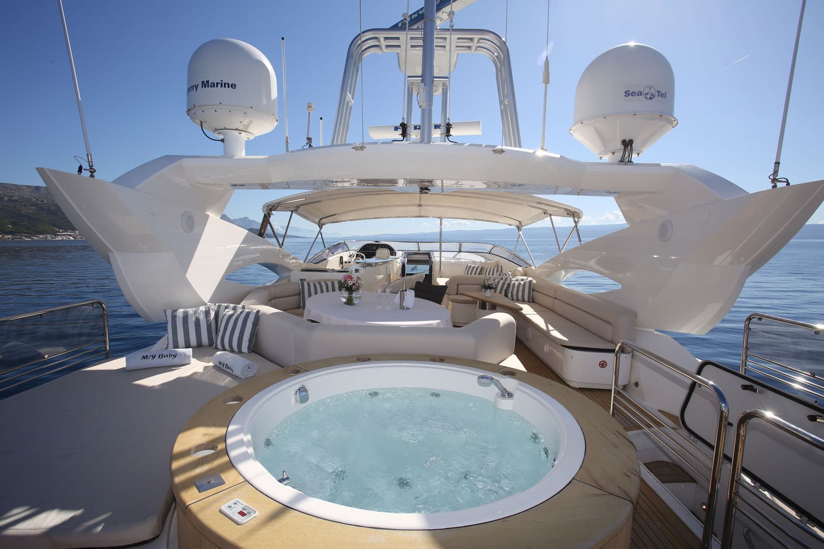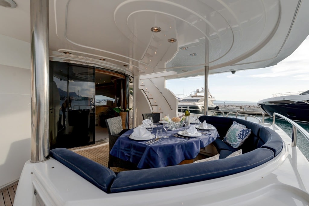 The cockpit of this 30-meter Croatian Sunseeker yacht is a real focal point, fully equipped with a bar, sunbeds, generous sofa space and a magnificent jacuzzi BABY I is perfect for relaxing, bathing in the glorious sun or soaking in the gorgeous scenery while cruising the coastlines of Albania, Croatia, Italy, Montenegro, Slovenia or Venice. All of this while sipping on a cocktail or refreshing beverage at the sundeck dining table that members of staff would be delighted to prepare for guests upon request, what could be better??