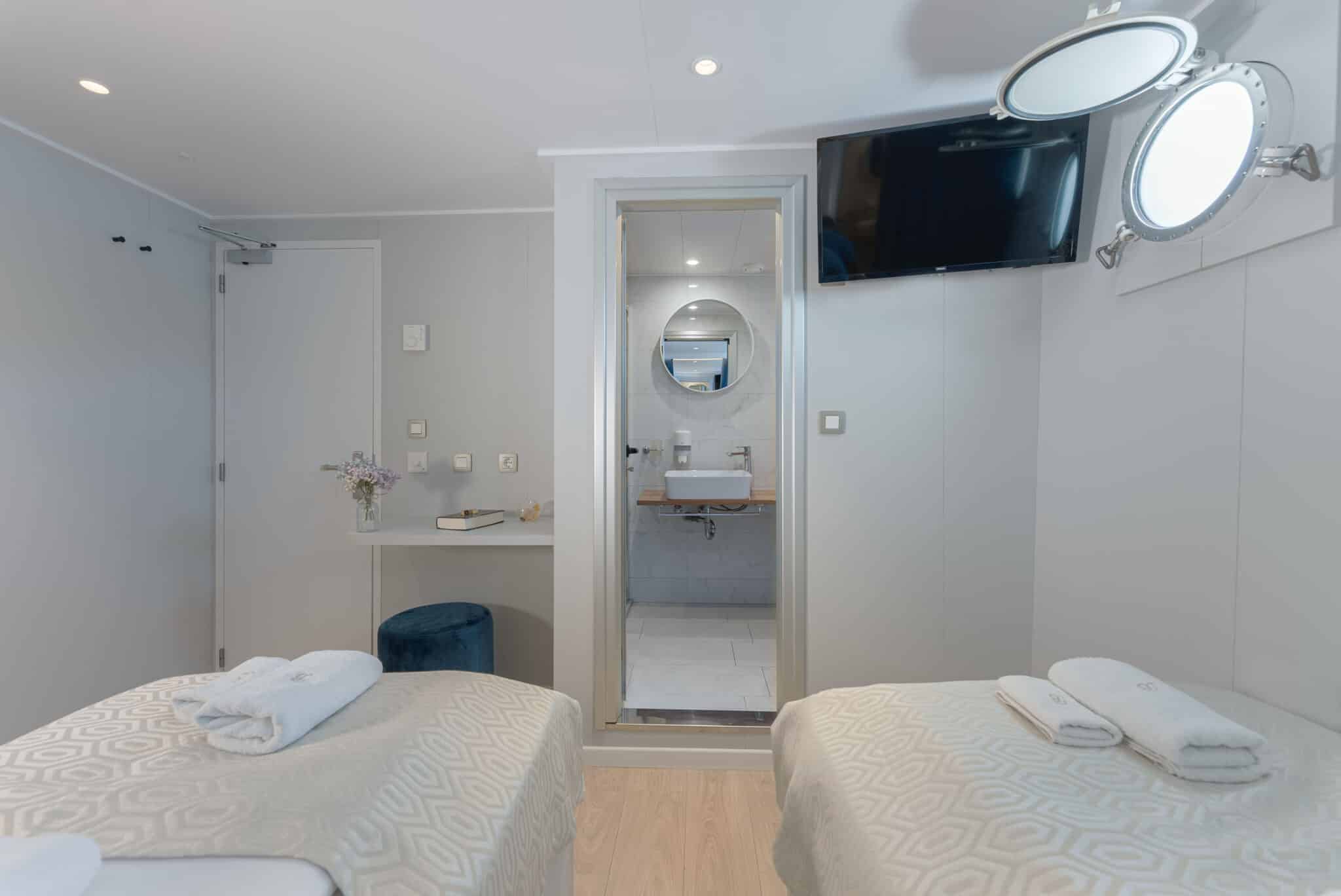 On your Bellezza Yacht Charter, enjoy lounging in the spacious salon. This area features designer dining chairs and is the ideal place to indulge in a delicious breakfast before a leisurely day on the water. Furthermore, the main deck features three double and seven twin cabins. Each twin cabin is convertible into a double. Also, each cabin has a sleek, modern design with a private bathroom. This yacht is extremely family friendly, with the lower deck housing two triple cabins, two double and four twins. So take your pick and enjoy a comfortable, peaceful night’s sleep!