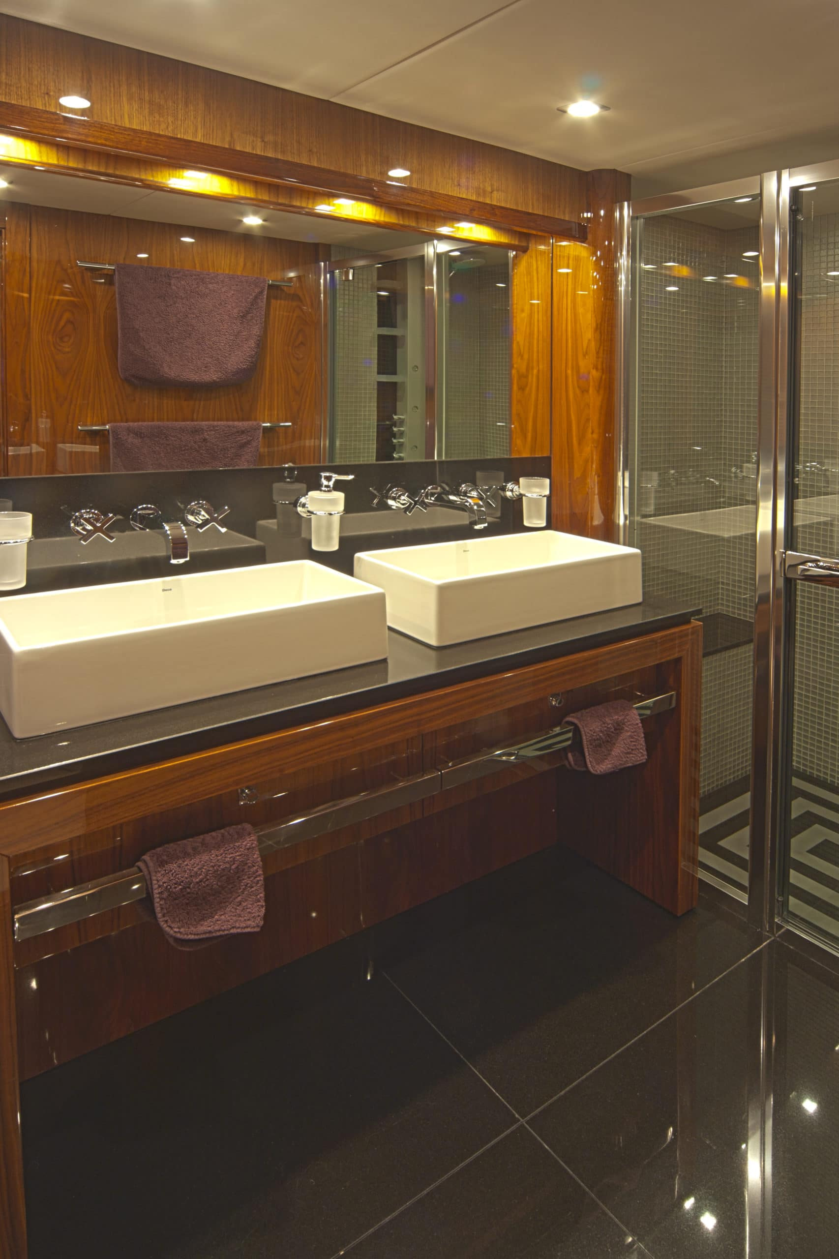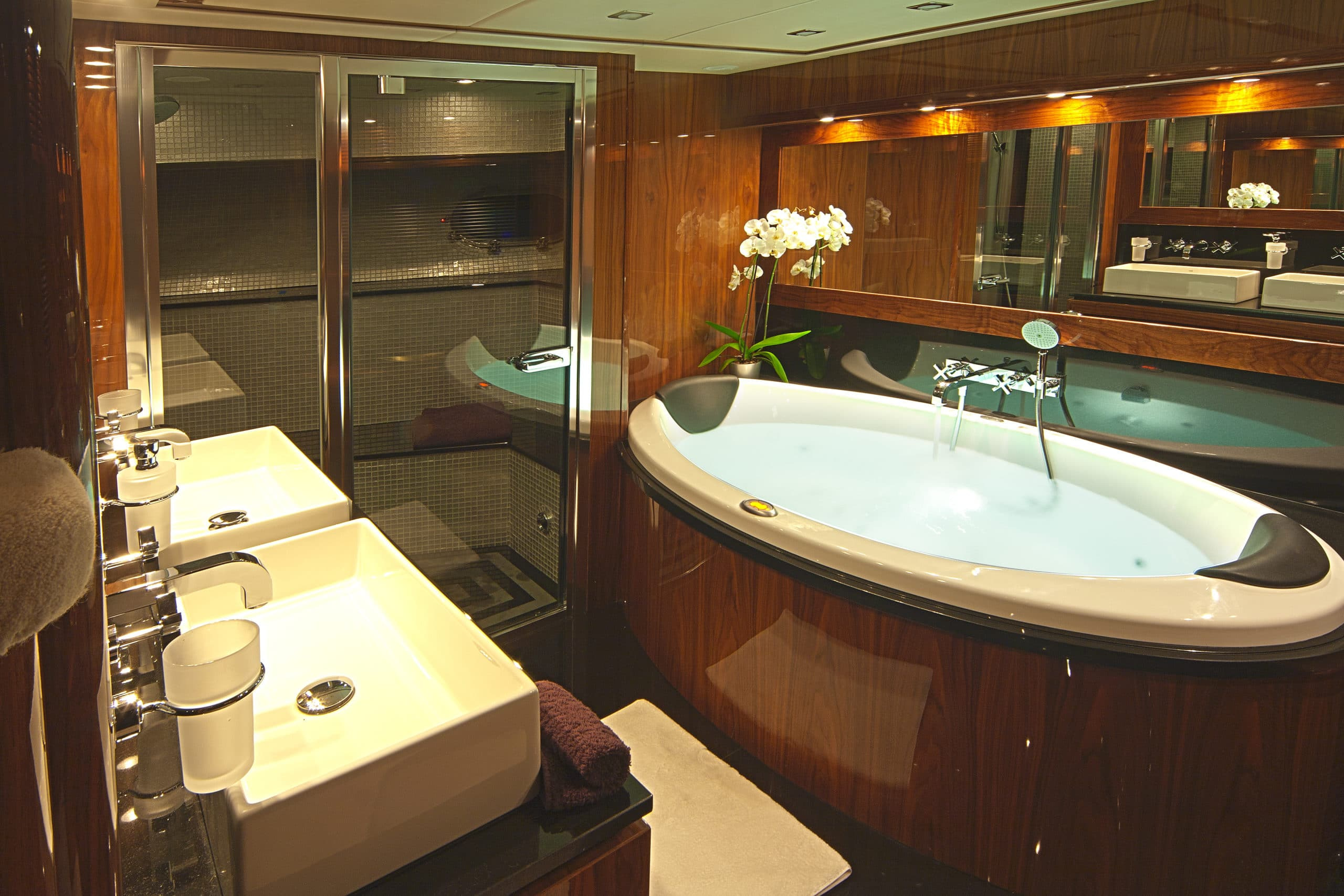Moving inside this Sunseeker UK masterpiece you enter a modern and clean space thanks to CASSIOPEIA’s impeccable upholding. You have a surprisingly spacious interior at your disposal. Feel free to relax after a long day of soaking in the Mediterranean sun in the saloon or enjoy a freshly prepared meal around the dining table. This Sunseeker UK yacht can comfortably facilitate up do 10 guests in 5 staterooms. The master stateroom is located on the main deck and enjoys 180-degree views, it is fully equipped with a walk-in wardrobe and a sunken en suite with a stunning Jacuzzi/bath alongside a steam shower room. In addition to this, there are two VIP staterooms on the lower deck. These generously sized rooms are equipped with en-suite his and hers sinks and a spacious shower. The two twin staterooms are also equipped with an en-suite his and hers sinks as well as entertainment systems.