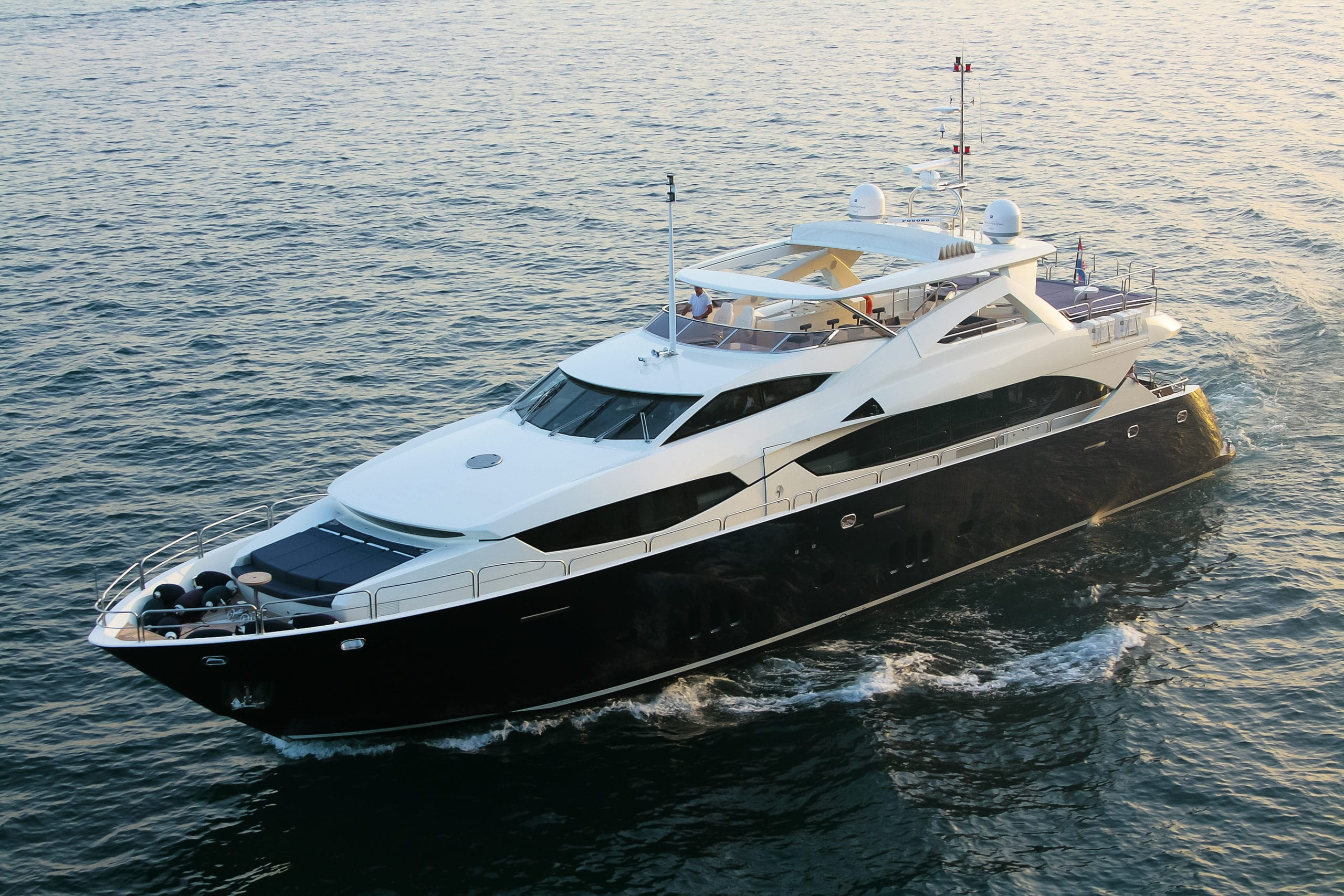 Her contrasting two tone exterior provides a sleek and elegant exterior to match her impeccable interior. Standing at 33.91 meters with a beam of 7.39 meters and a draft of 2.28 meters she boasts a luxurious yet comfortable and open plan layout.