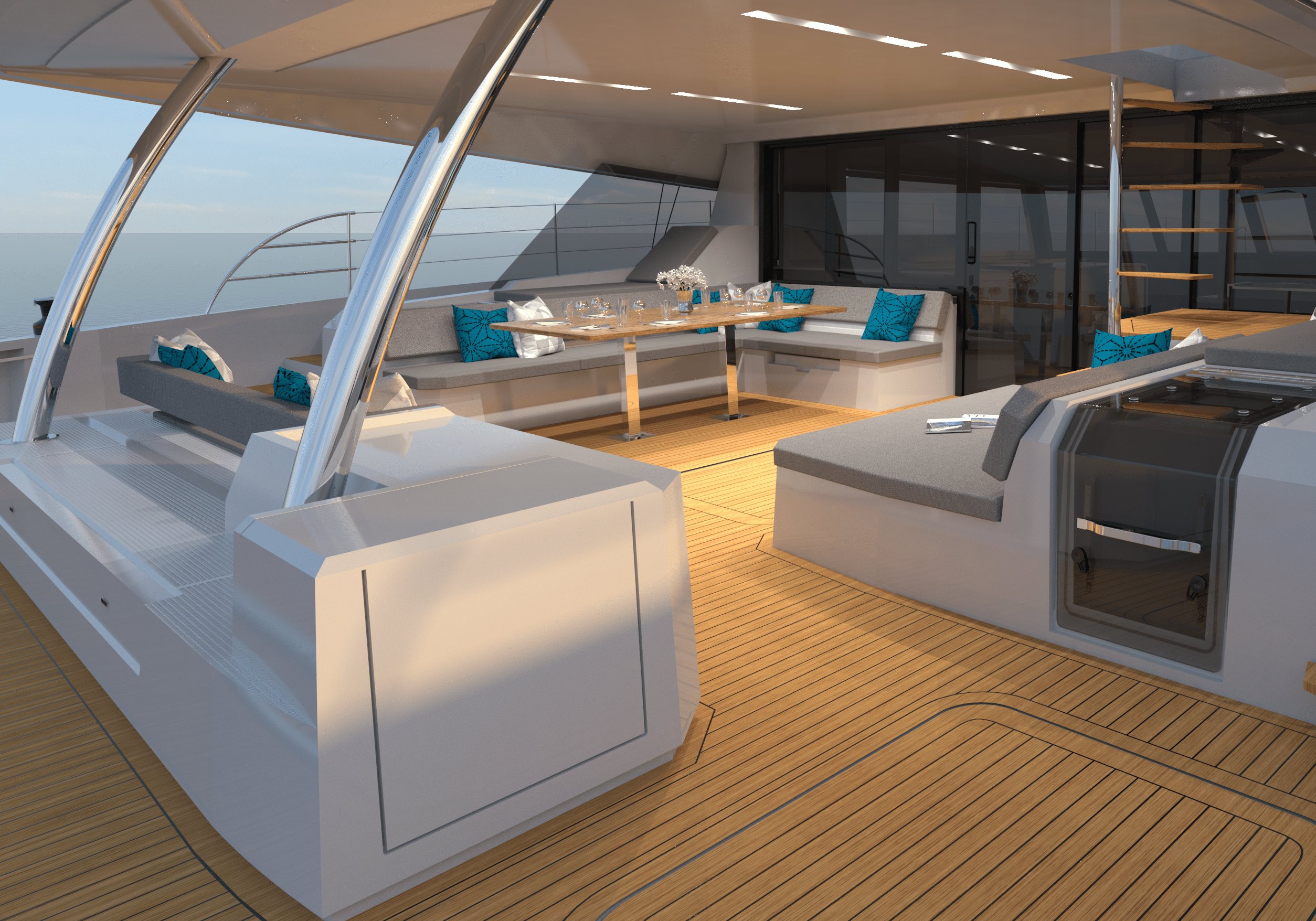 Her cockpit is a generous 36m2, an ideal space to relax outside with your friends and family. Why not sunbathe before grilling up a delicious meal for all your guests? Or else chill out on the flybridge which is a generous 32m2.