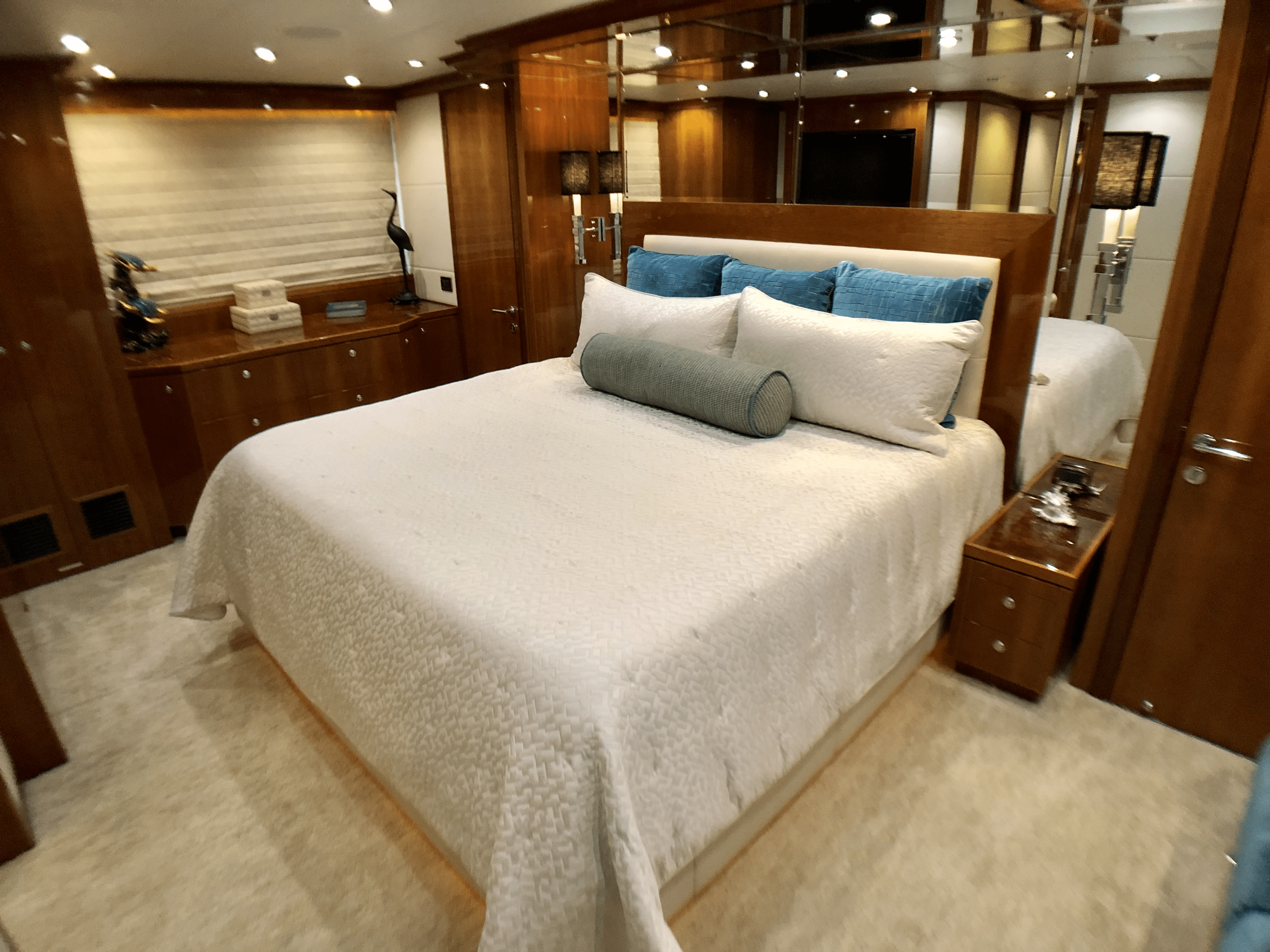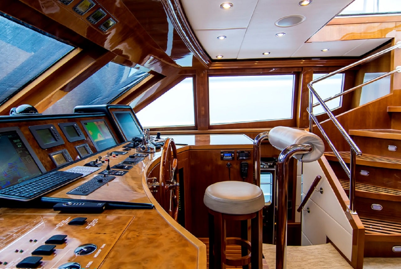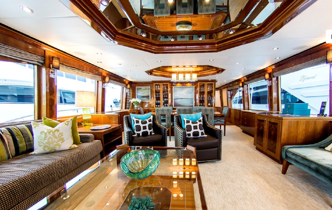 It is not only the exterior of this yacht that is bound to impress– upon stepping in to the spacious American vessel, guests are greeted by the stunning main saloon, designed by Hargrave and featuring cherry gloss and camphor burl wood joinery to radiate a sophisticated yet contemporary vibe. Natural light pours through the windows to illuminate the formal dining area in addition to the Saloons expansive sofa area which gives guests a chance to escape the sun and chill in the air-conditioned indoor space. Cynderella is great for entertaining guests – with the port aft corner displaying a 50-inch television to add to the Marantz surround sound system around the yacht.