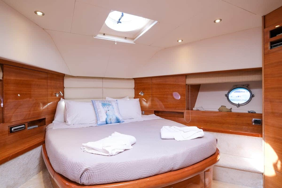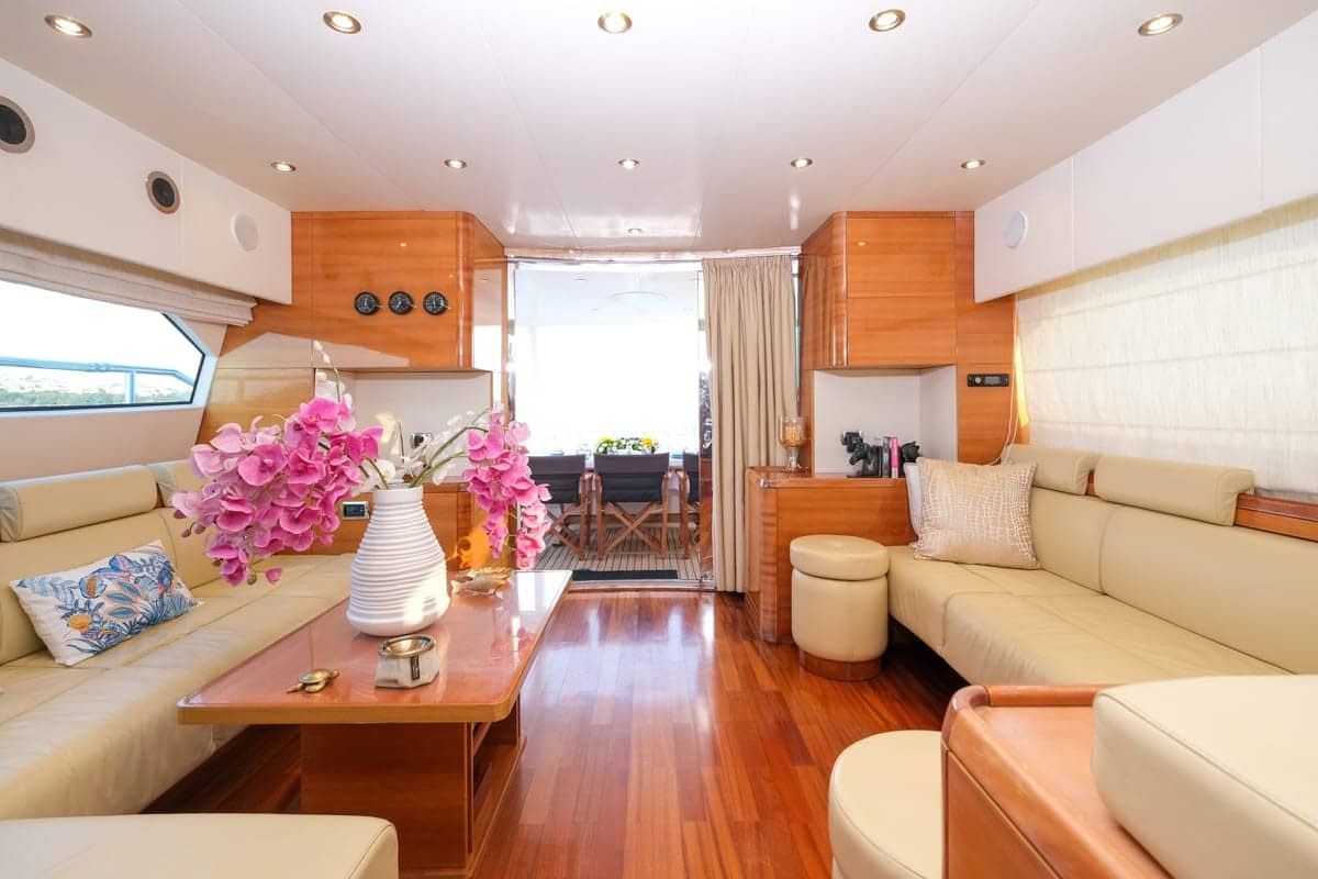 Back on the lower deck there is an outdoor dining area. Creating the perfect space to gather with friends and family to reminisce about the days adventures or excitedly plan what part of the East Mediterranean you’re going to explore next! All while enjoying a freshly prepared meal by the crew on board. This dining area leads into a spacious saloon, feel free to put your feet up and enjoy the TV or just simply relax and unwind.