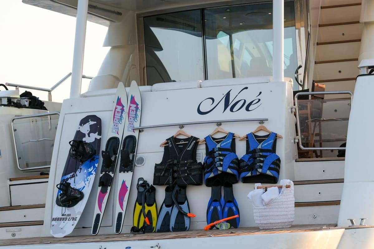 Noe is the perfect Greek yacht charter option for all those water sport enthusiasts out there! Fully equipped with the following toys: one wake board, a stand up paddle board, tubes, a banana for two people and one Seadoo. There are also water skis for adults, snorkelling and fishing equipment and an electric swimming platform. Noe caters to every level of experience and guarantees there will never be a dull moment on board!