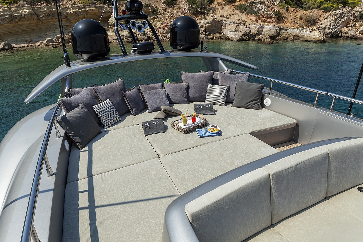 Greek motor yacht MY TOY makes superb use of its outdoor spaces with an array of seating and sunbathing areas. The sun pads located on the fly bridge provide an excellent elevated vantage point to truly appreciate the magnificent Greek scenery with panoramic views. You can also lie enjoy the sunbeds on the bow of the yacht, bathing in the Greek sunshine and admiring unrestricted views. There is a fantastic outdoor space on the main deck with large sun pads and an informal dining area, perfect for gathering with friends and family to review the amazing memories made so far on your trip or look forward for the next adventure to come.