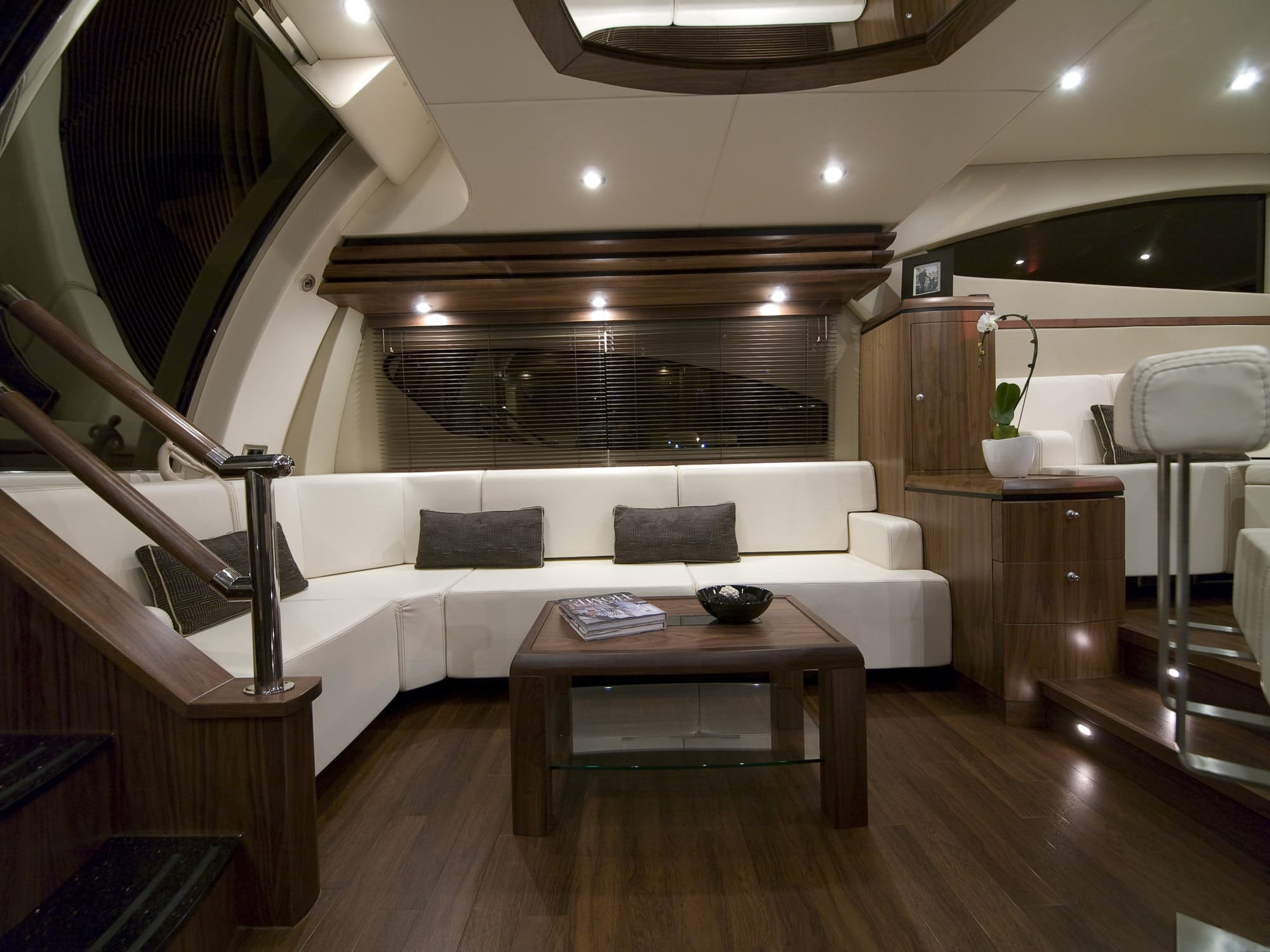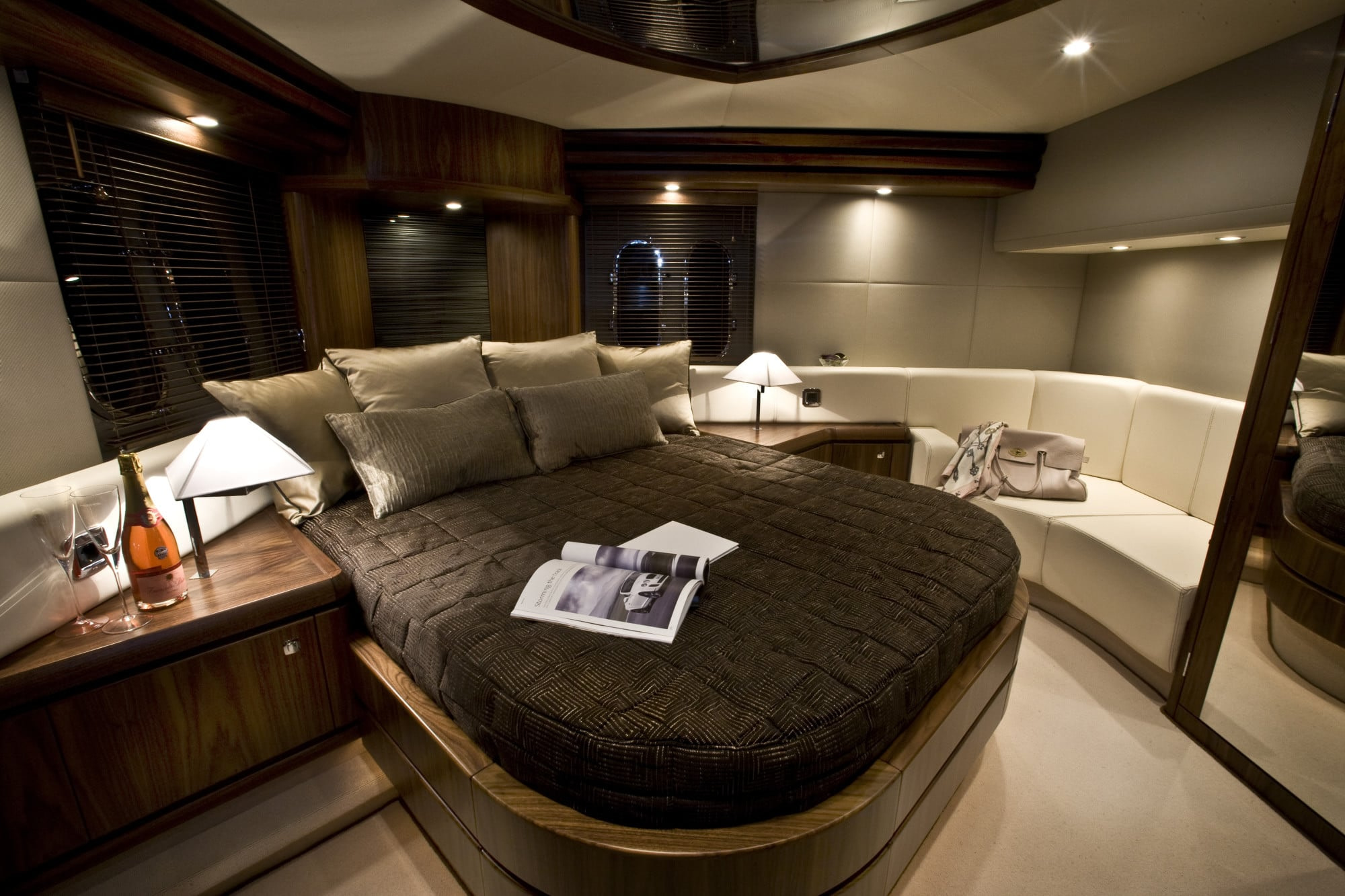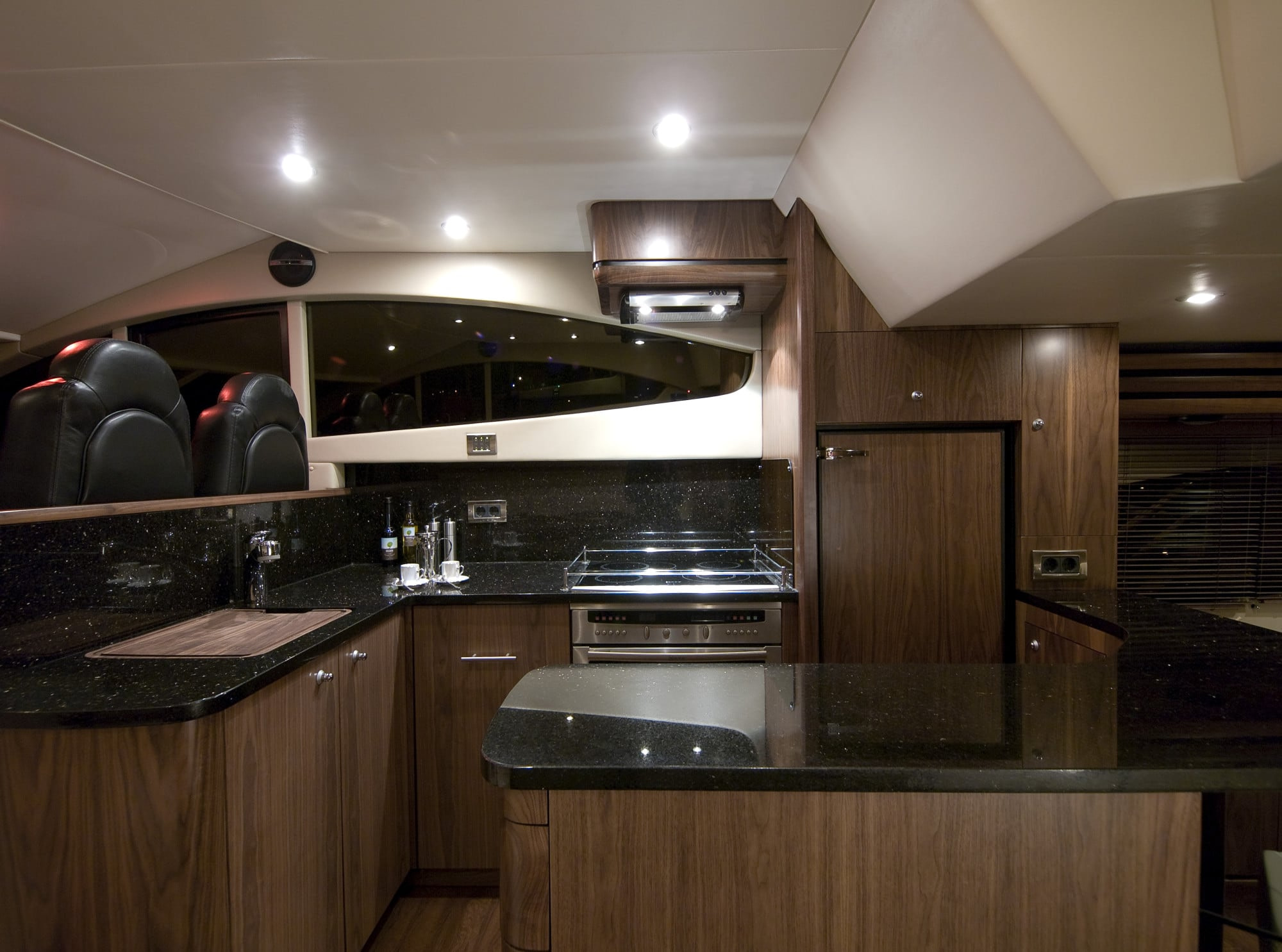 The main deck is a real treat, featuring am ultra-modern salon with a beautiful almond corner sofa, and a bar crafter with high-grade teak. A dining space is found forward, with another corner sofa immaculately serving an impressive teak table. The galley is fully functional, and finished with a dazzling black worktop adding to her chic feel. The clever use of space and handsome décor make the main deck an ideal place for entertaining or relaxing.