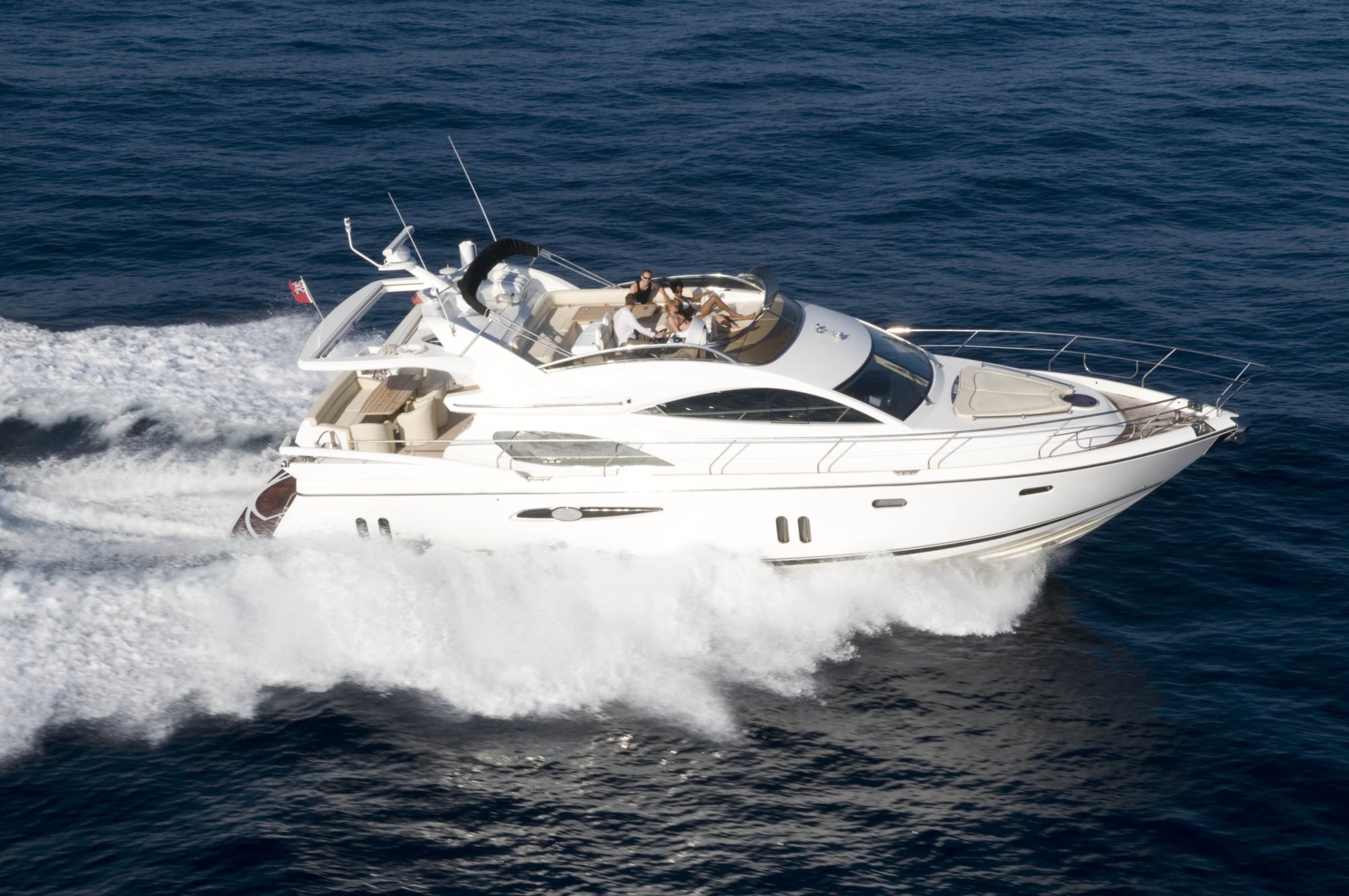Exterior space is also impressive, with an airy fly-bridge suited perfectly to open-air dining or cocktails. Sun-loungers located forward allow you to soak in the warm Mediterranean rays. Powered by twin Volvo Penta D12 800 HP engines, Harvest Moon boasts impressive performance with top speeds of 32 knots. Decked out with high-end audio visual equipment and watersport equipment, along with a carefully selected and experienced crew, your time on-board will be both thrilling and comfortable.
