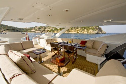 Deck space is maximised on-board. The large sun-pad is located above the pilot house. The tender well doubles as a divine shaded space to relax in. The cockpit is extremely spacious, and benefits from a large bimini. All 8 guests can comfortably dine here, enjoying the creations of the celebrated chef. To the aft is a large swimming platform.