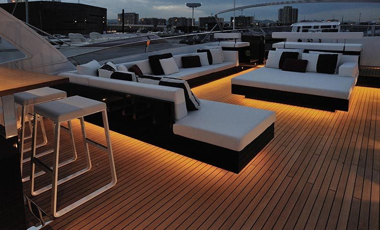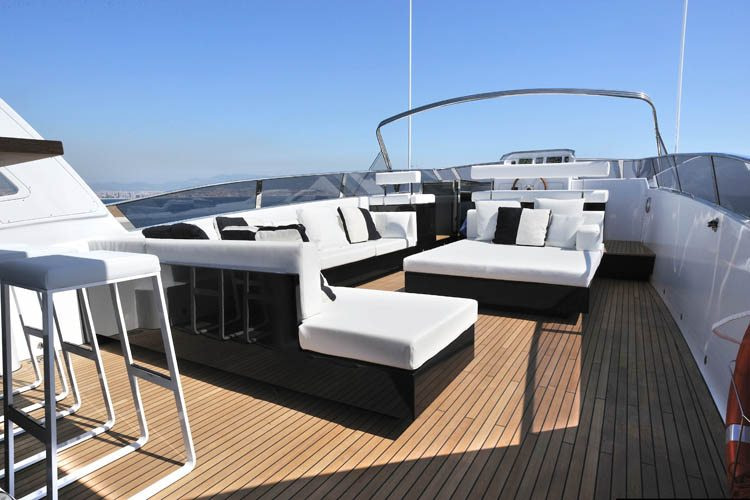 Petardo maximises exterior space. The aft deck features a gorgeous dining table, ideal for sheltered alfresco dining. The flybridge is a real highlight of this Mondomarine 85 yacht. This large space features a solarium, bar, sofa and sun-loungers. The under-seat LED lighting adds an appealing ambiance to this impressive area. Petardo is the perfect yacht for entertaining, and for relaxing with family and friends.