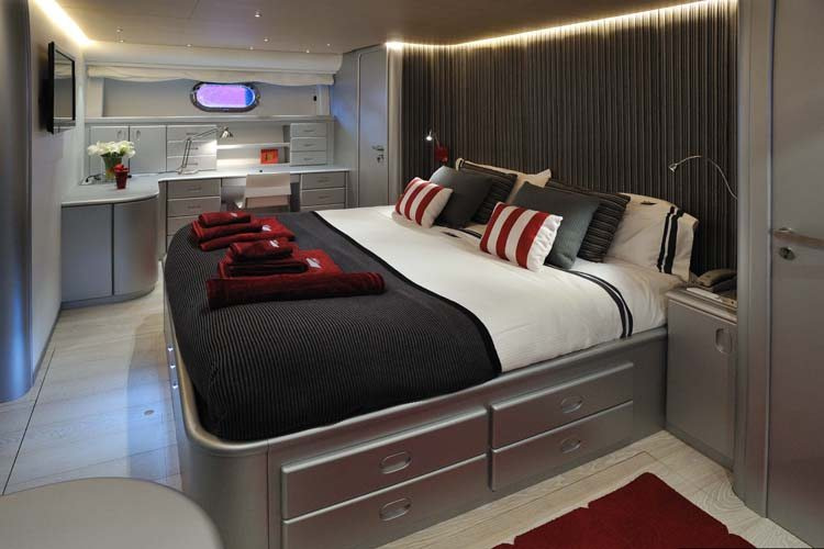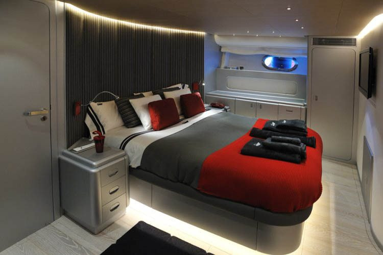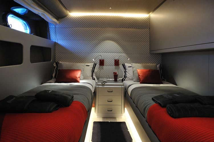 Petardo sleeps 8 guests in 4 spacious cabins. The cabins maintain the stylish interior design showcased in the saloon. There are 2 double cabins and 2 twin cabins. Each cabin has a TV, DVD player and iPod dock for entertainment. Accommodation on your Ibiza superyacht charter is luxurious and comfortable.