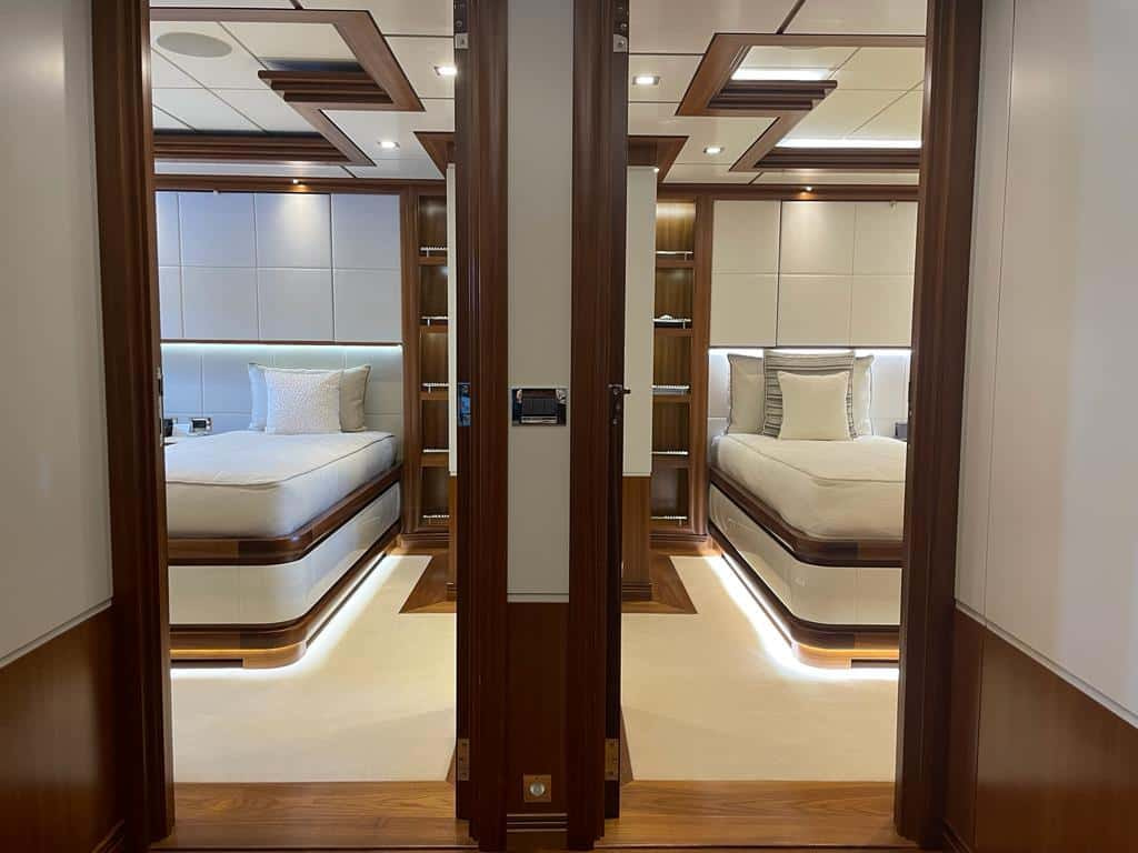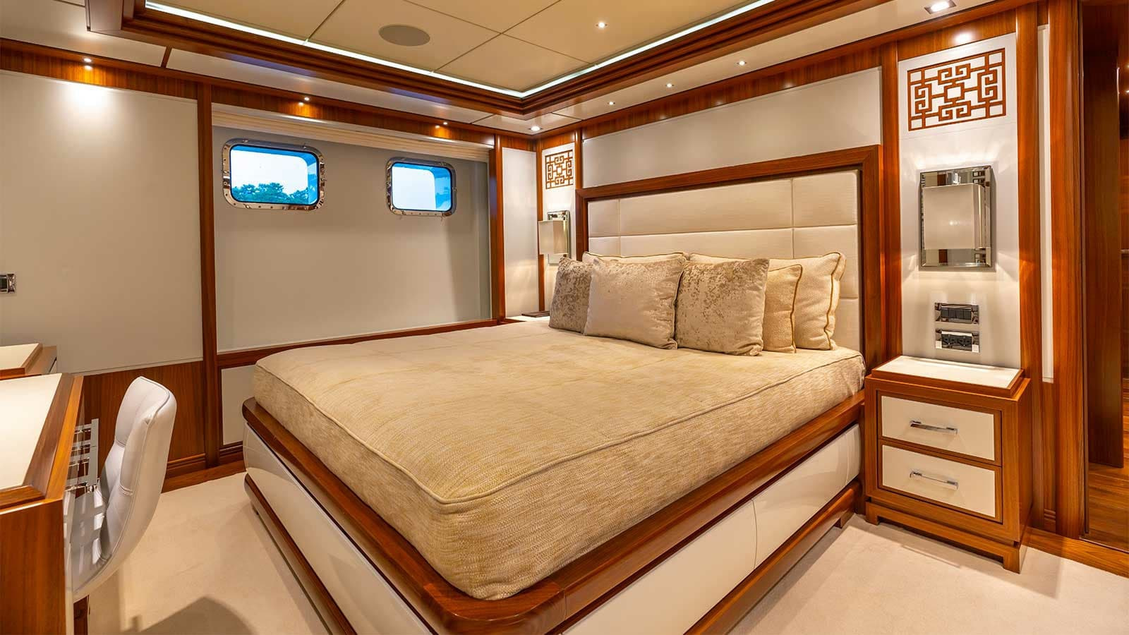 Immersive’s master suite, located forward on the main deck, offers a spacious sanctuary with neutral shades and antique carved paneling. The full-beam design incorporates a private owner’s lobby and study, providing a perfect blend of functionality and luxury. Additionally, the ensuite bathroom, complete with a bathtub, walk-in shower, and steam room, adds an extra layer of indulgence.